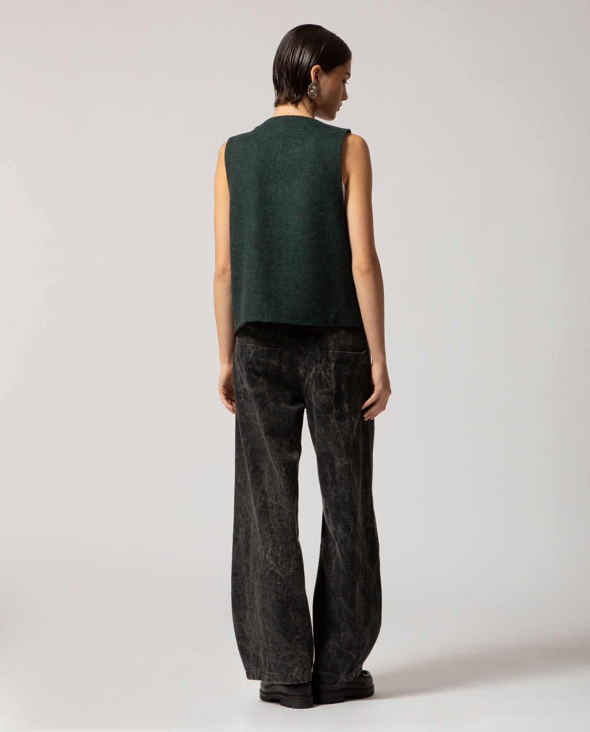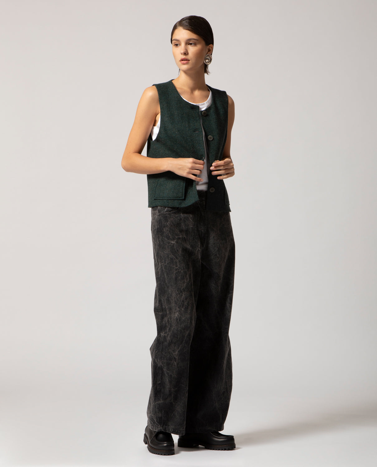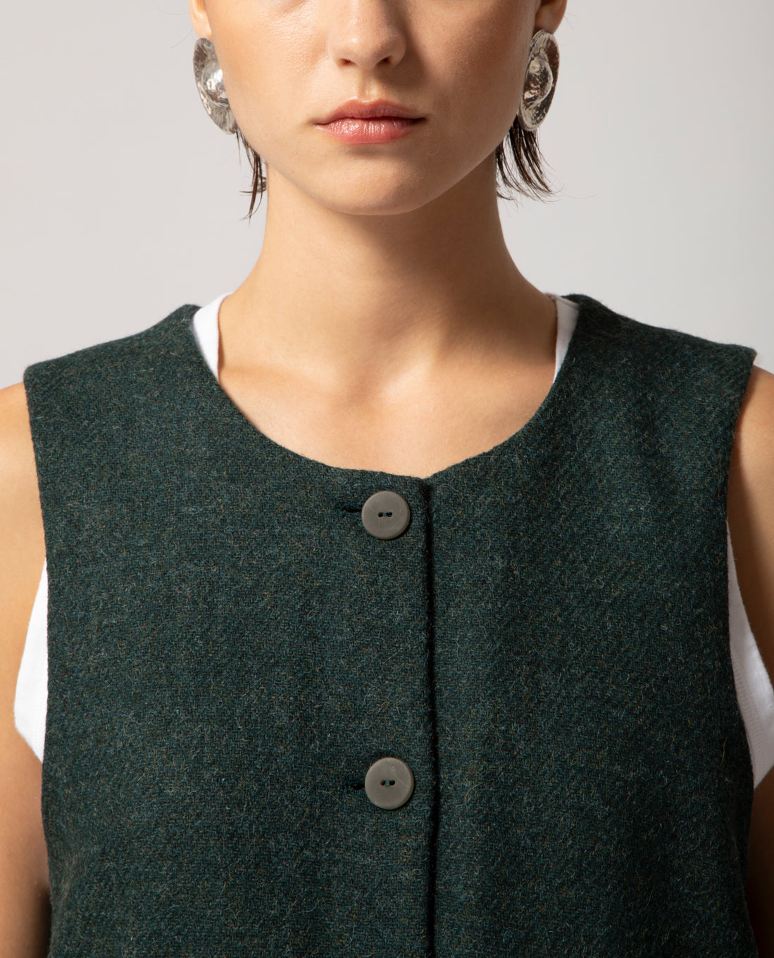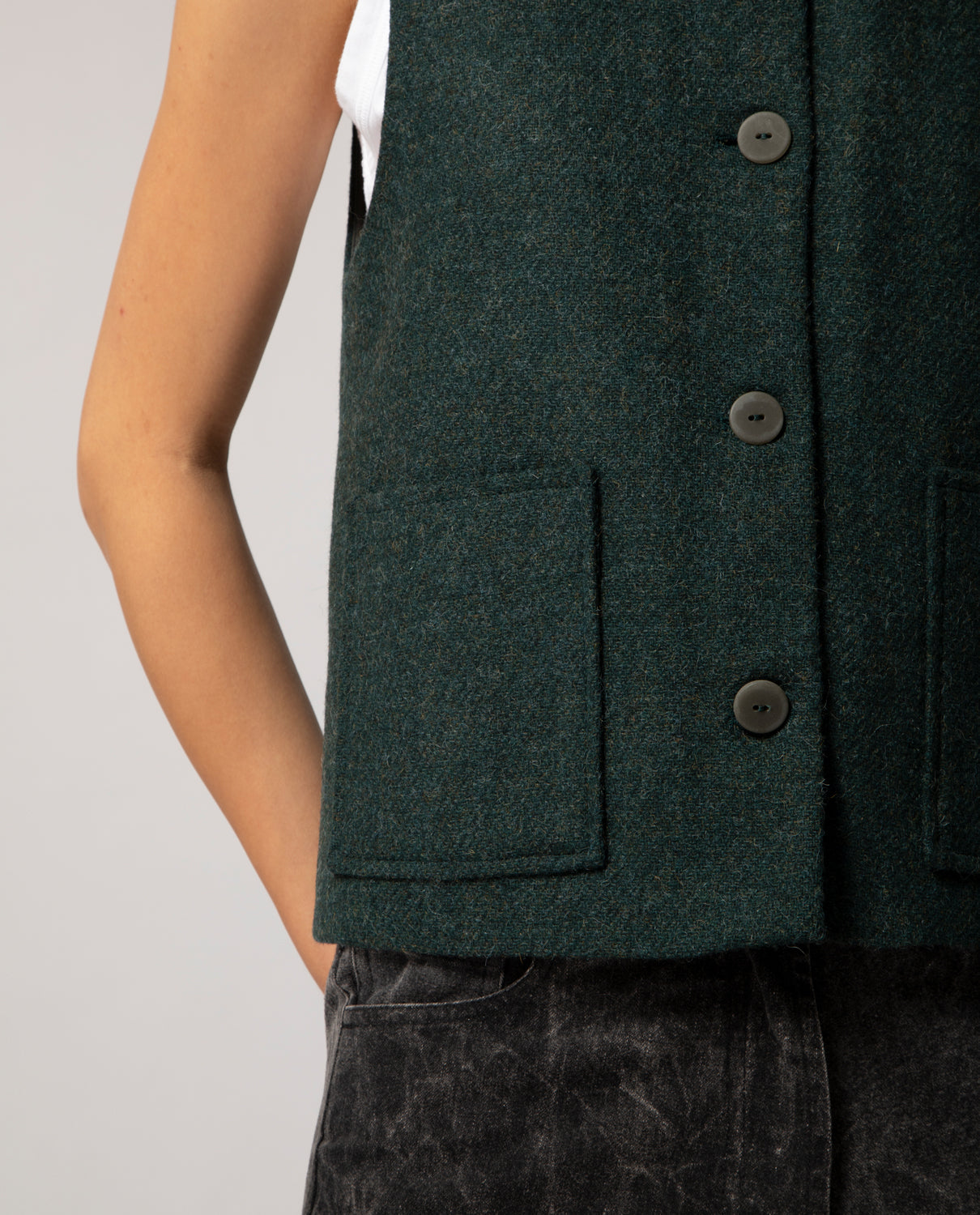 Designed with a boxy silhouette, this gilet features a crew neckline and square patch pockets. It is fully lined in cotton for added comfort and structure.