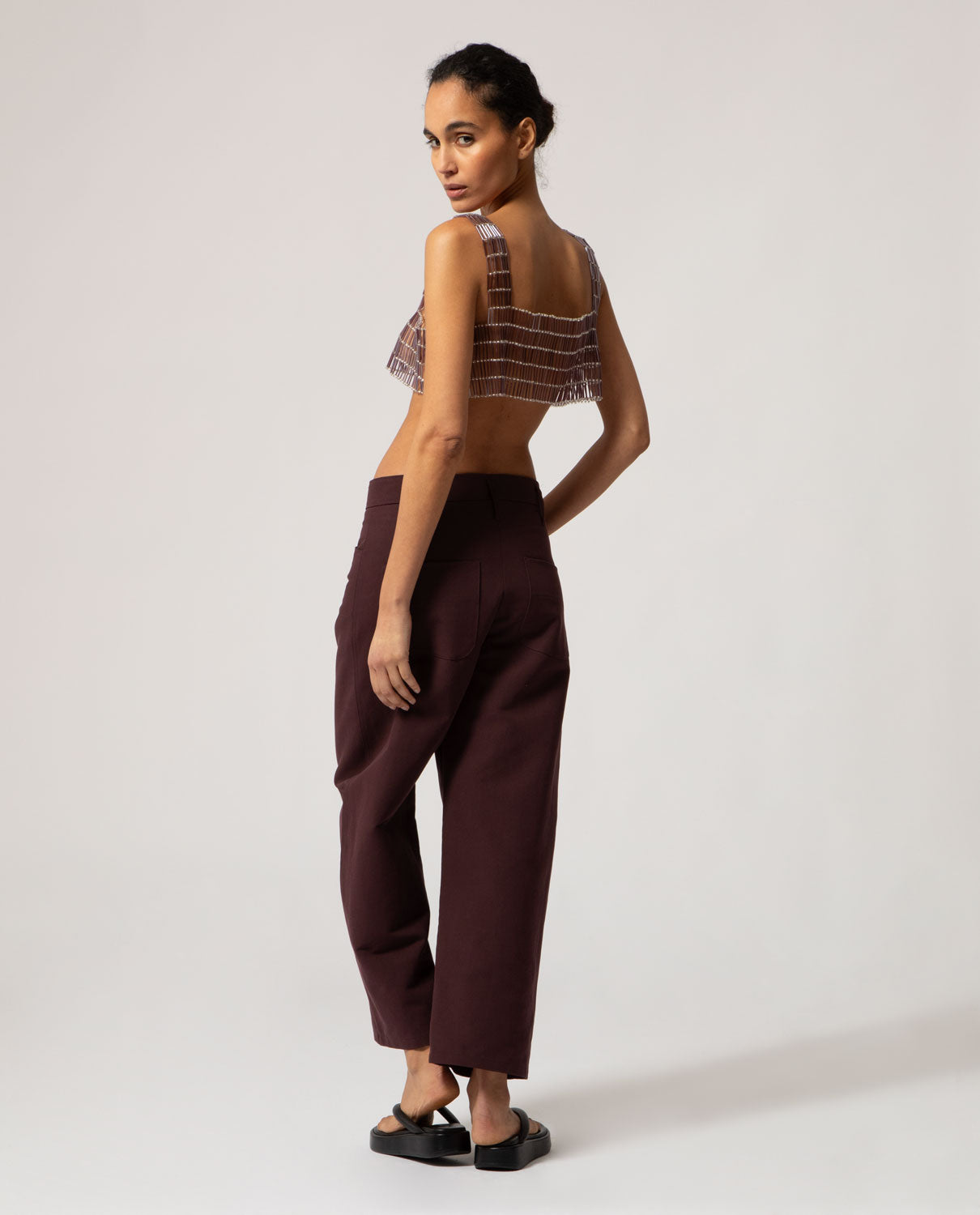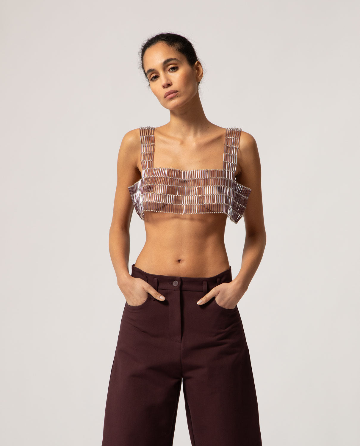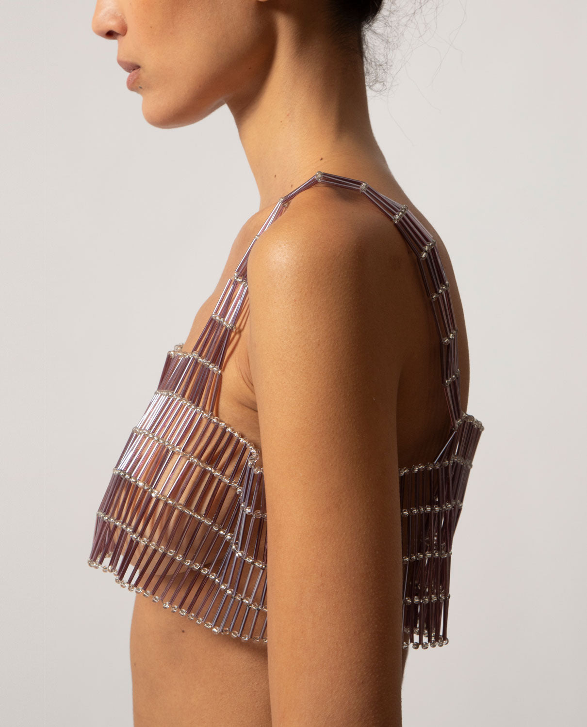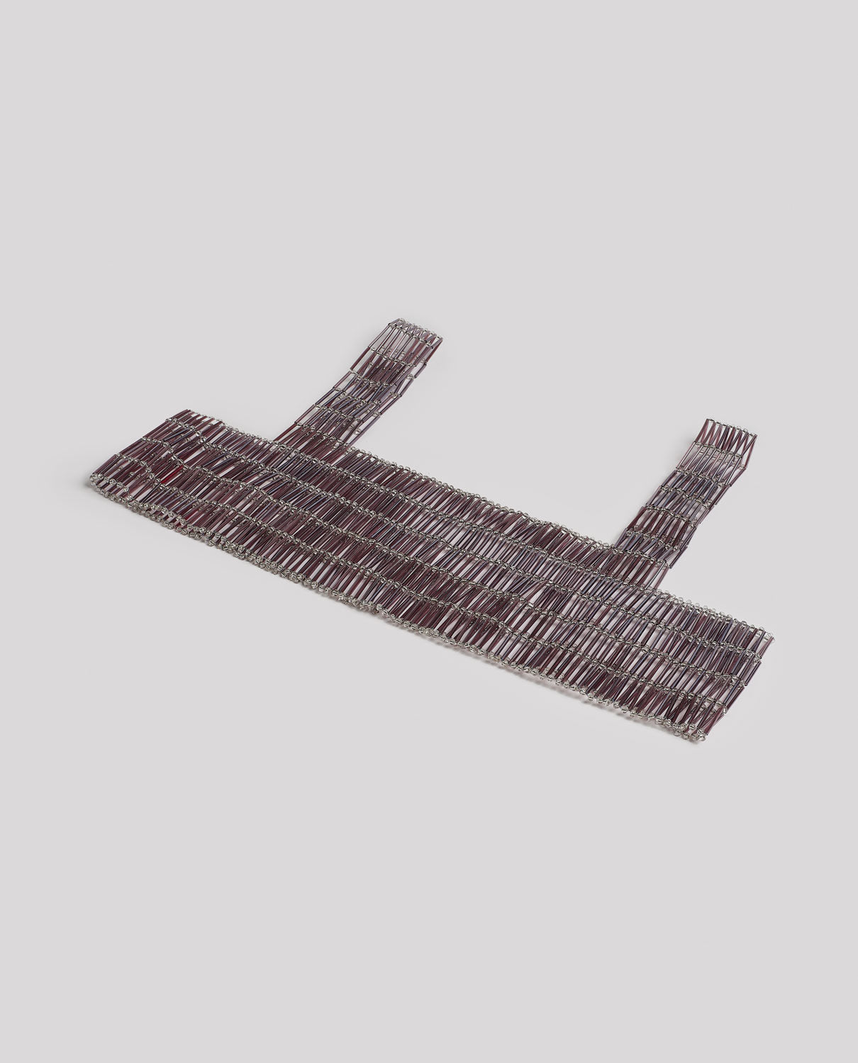 Artisanal decorative garment featuring tubular and spherical glass beads with a silver interior, designed to be worn over your favourite top. Custom-fitted apparel. Made to order. Production time: 10 to 15 days.