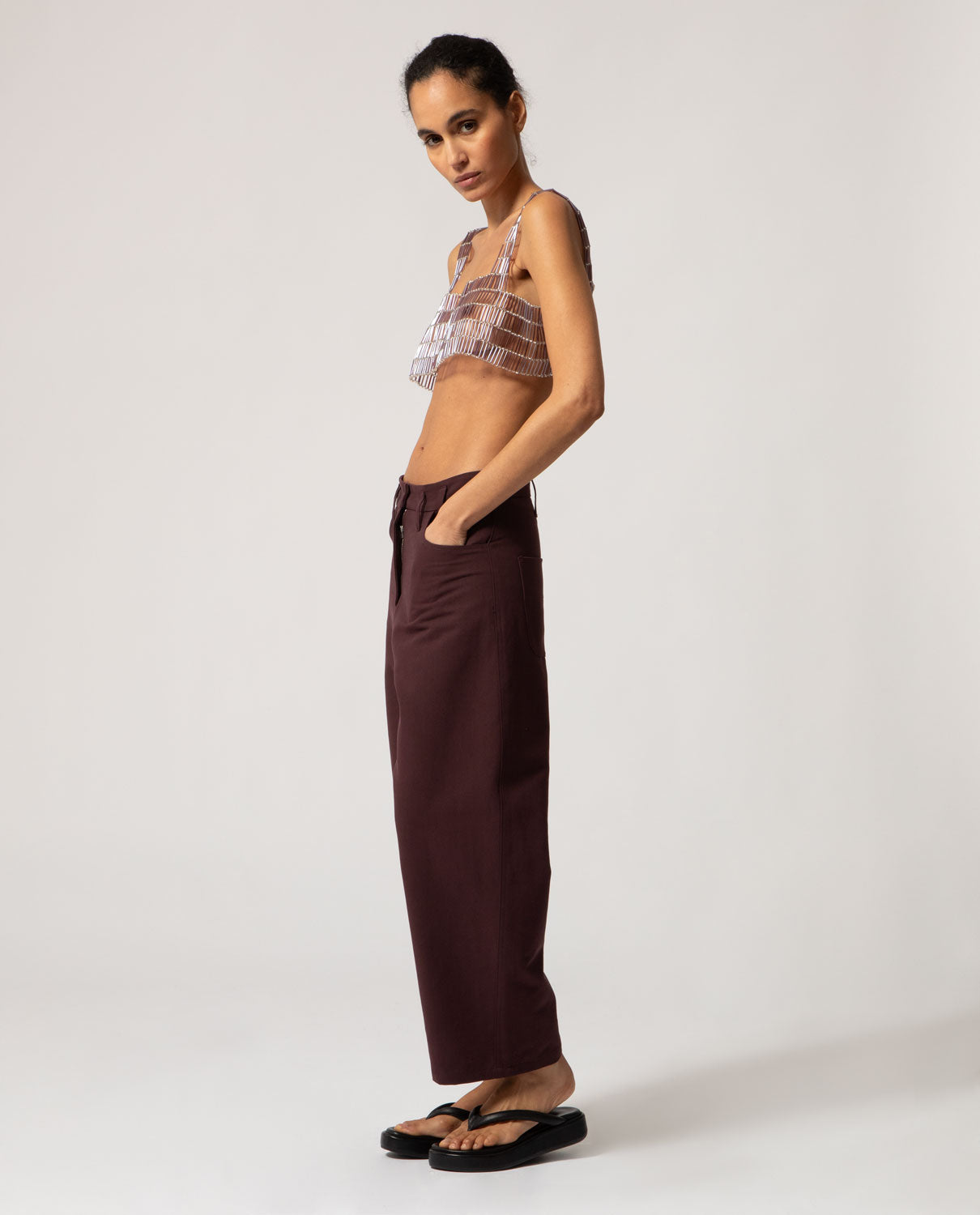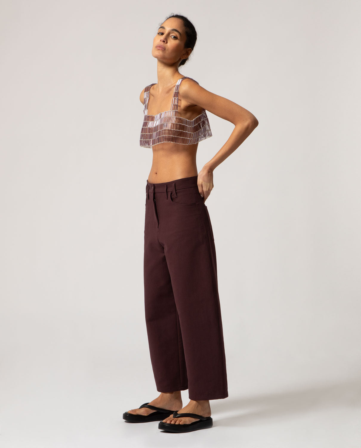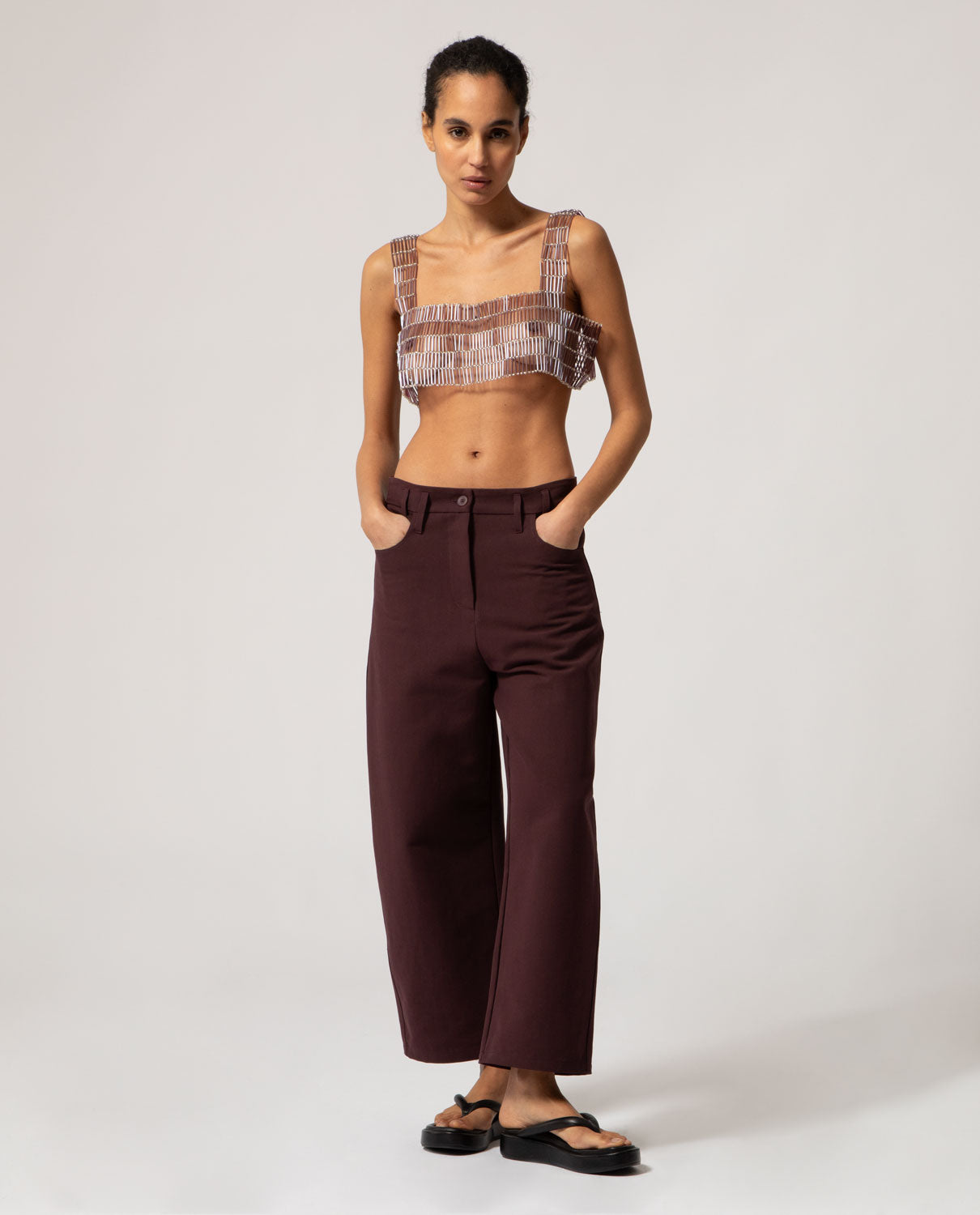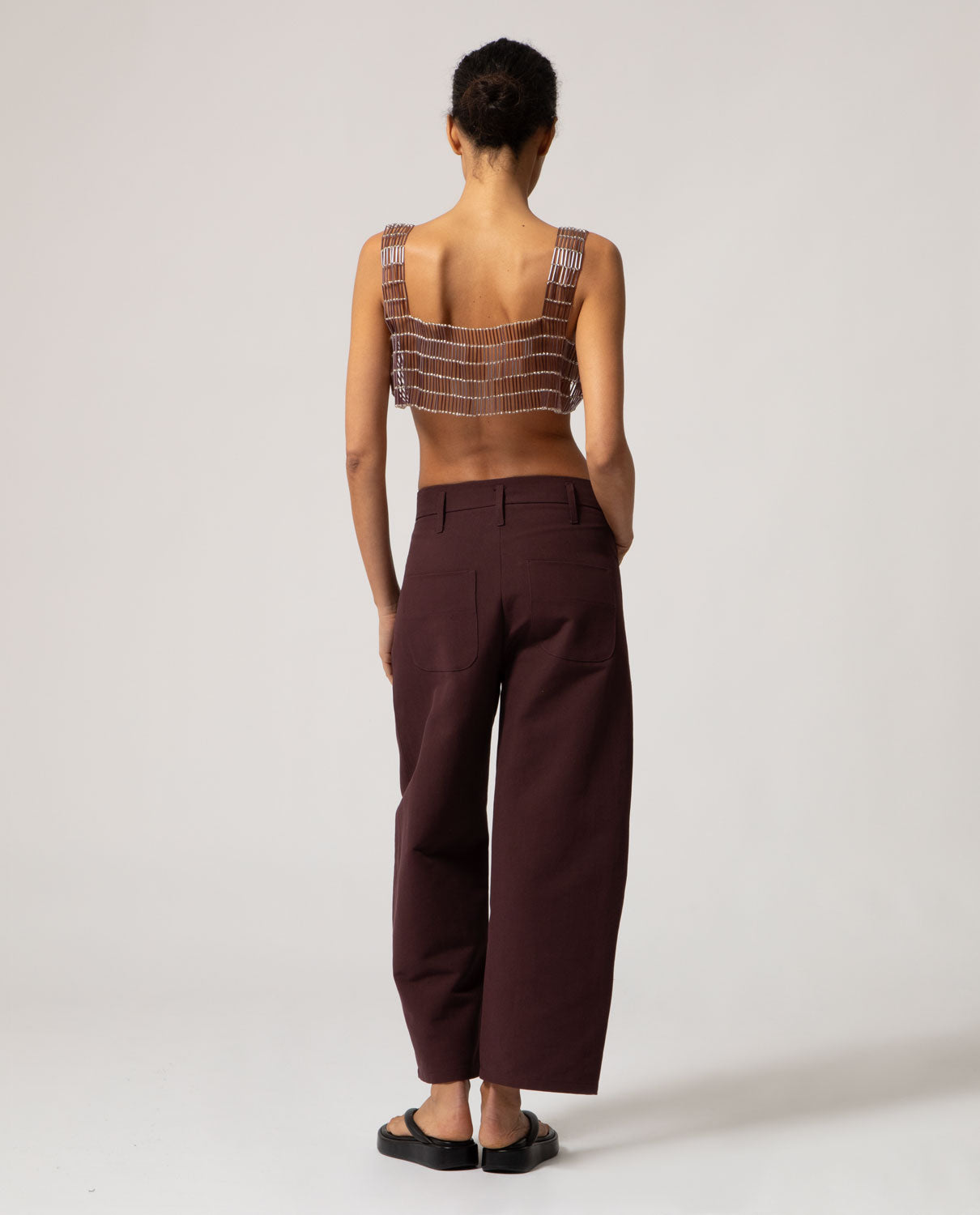 Artisanal decorative garment featuring tubular and spherical glass beads with a silver interior, designed to be worn over your favourite top. Custom-fitted apparel. Made to order. Production time: 10 to 15 days.