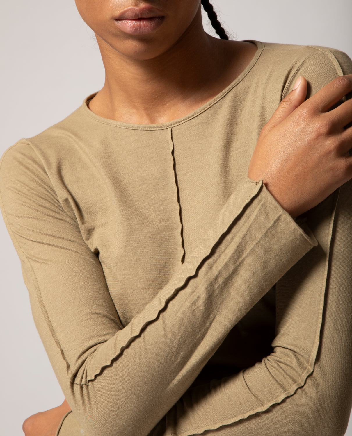 Designed with a slim fit, this piece is crafted in a piqué-effect cotton-cashmere blend. A pinched cloth traces a central spine detail that continues seamlessly along the sleeve, while the hand is supple, featherlight, and enveloping, offering both ease and refinement.