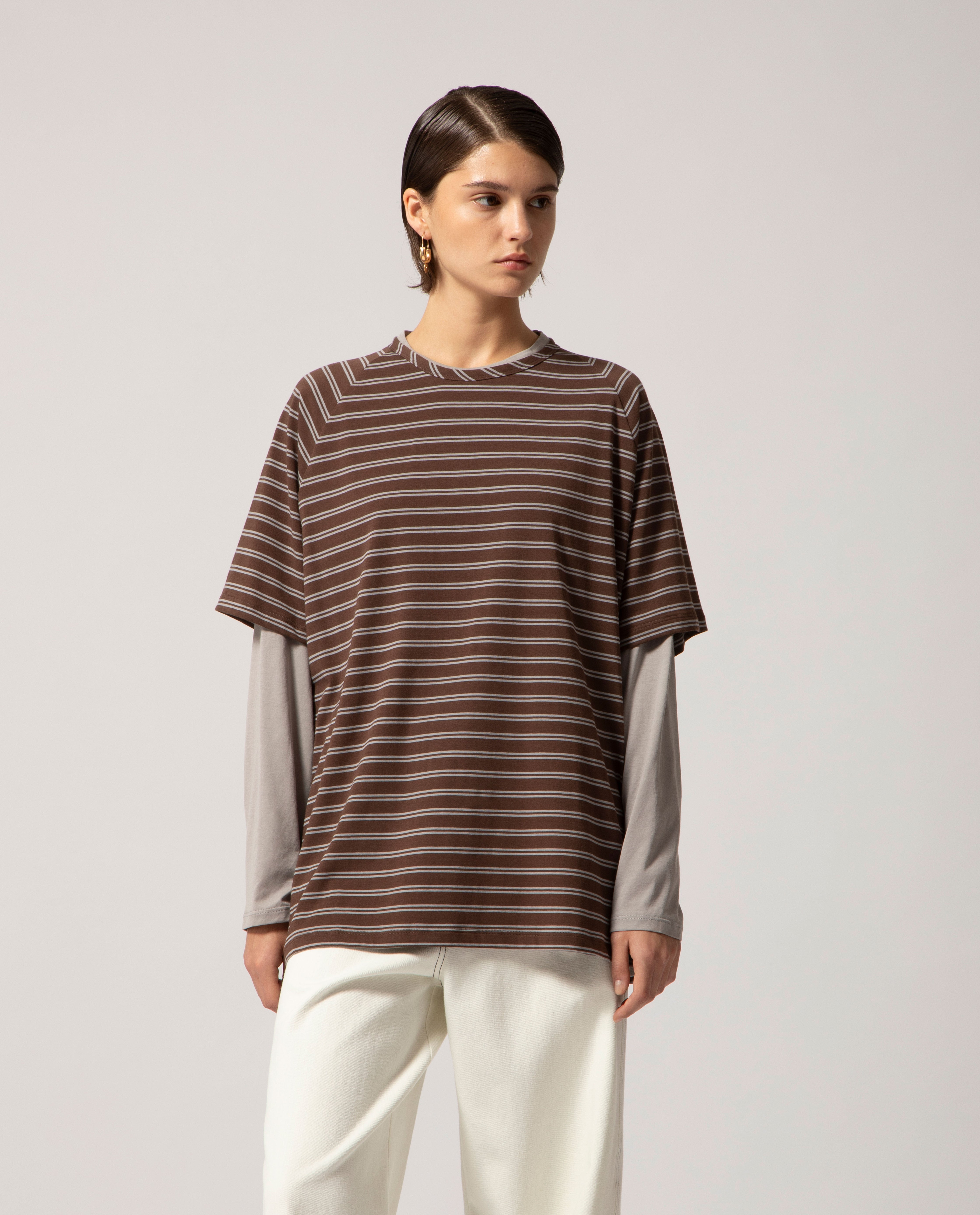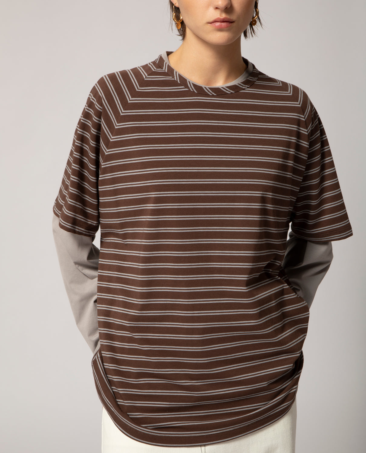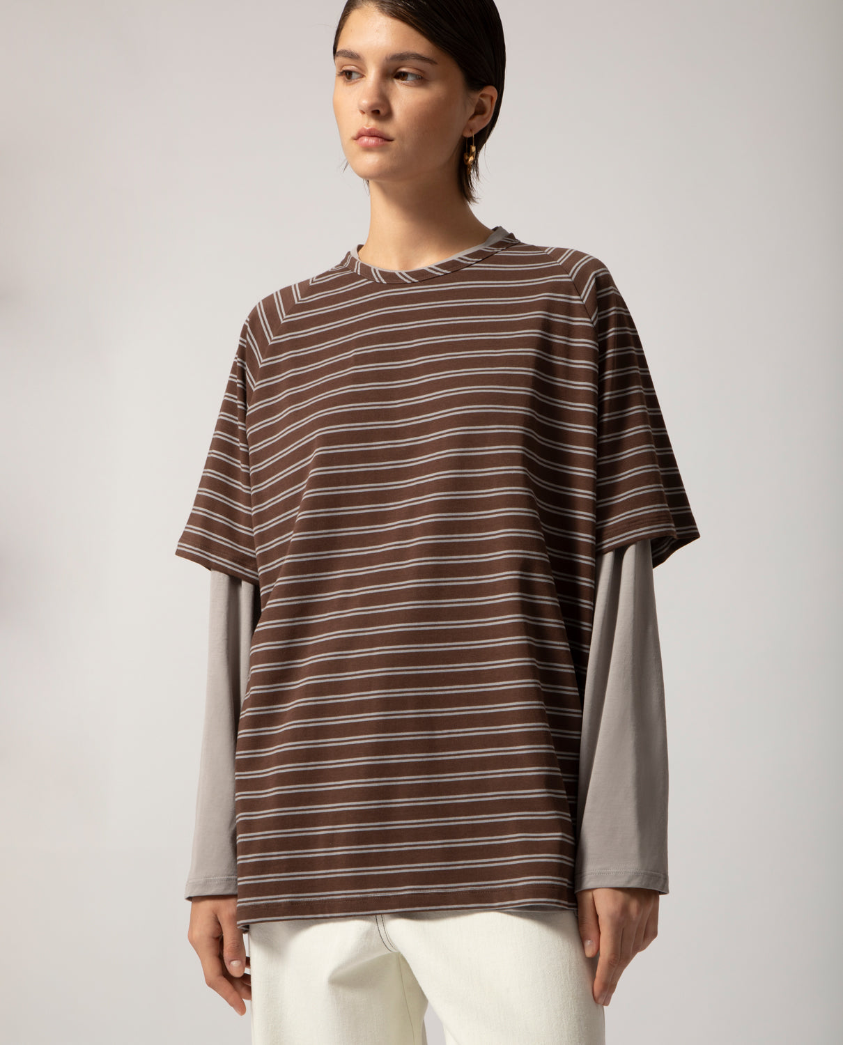 A two-in-one style composed of two contrasting cotton T-shirts, layered together yet fully separable. Designed with raglan sleeves and cut to an oversized silhouette, it comfortably fits sizes S to L.