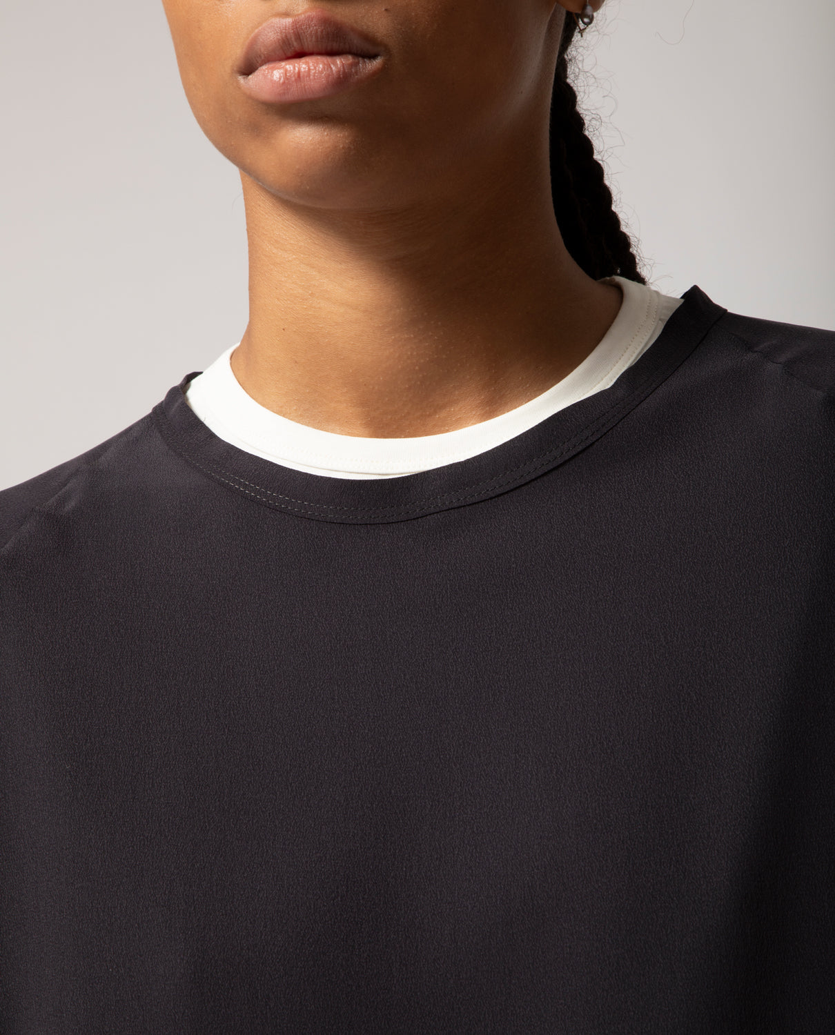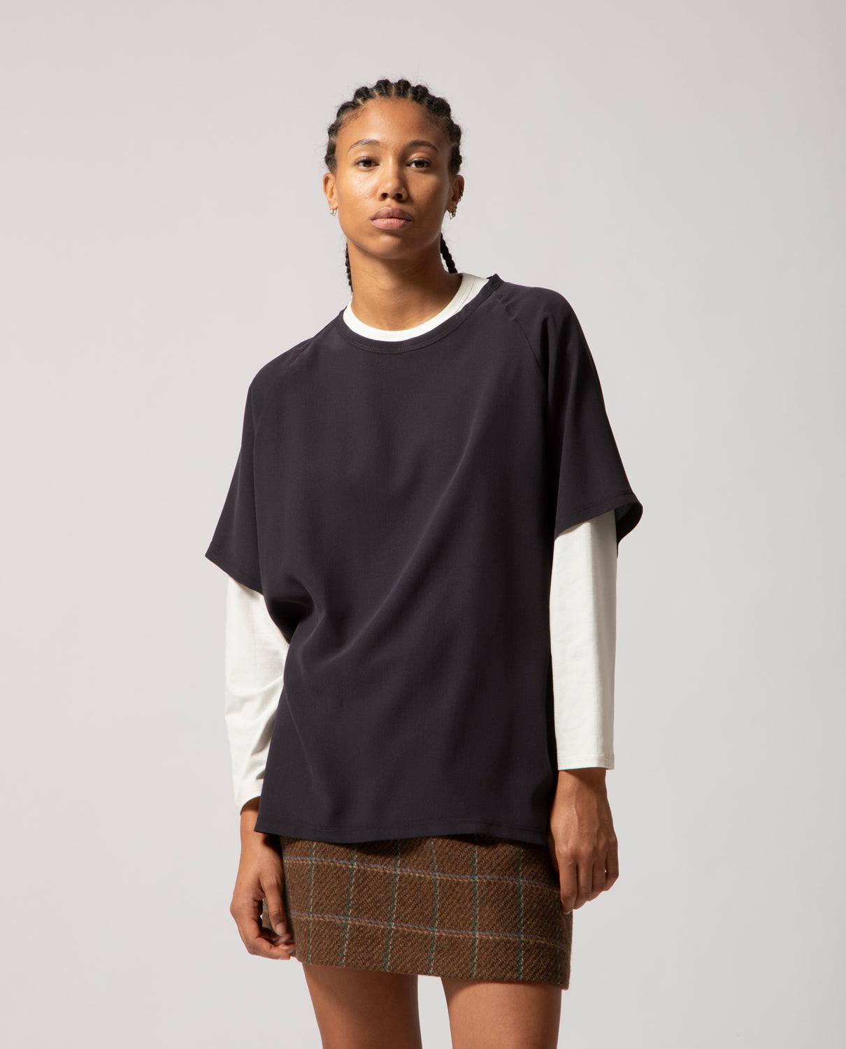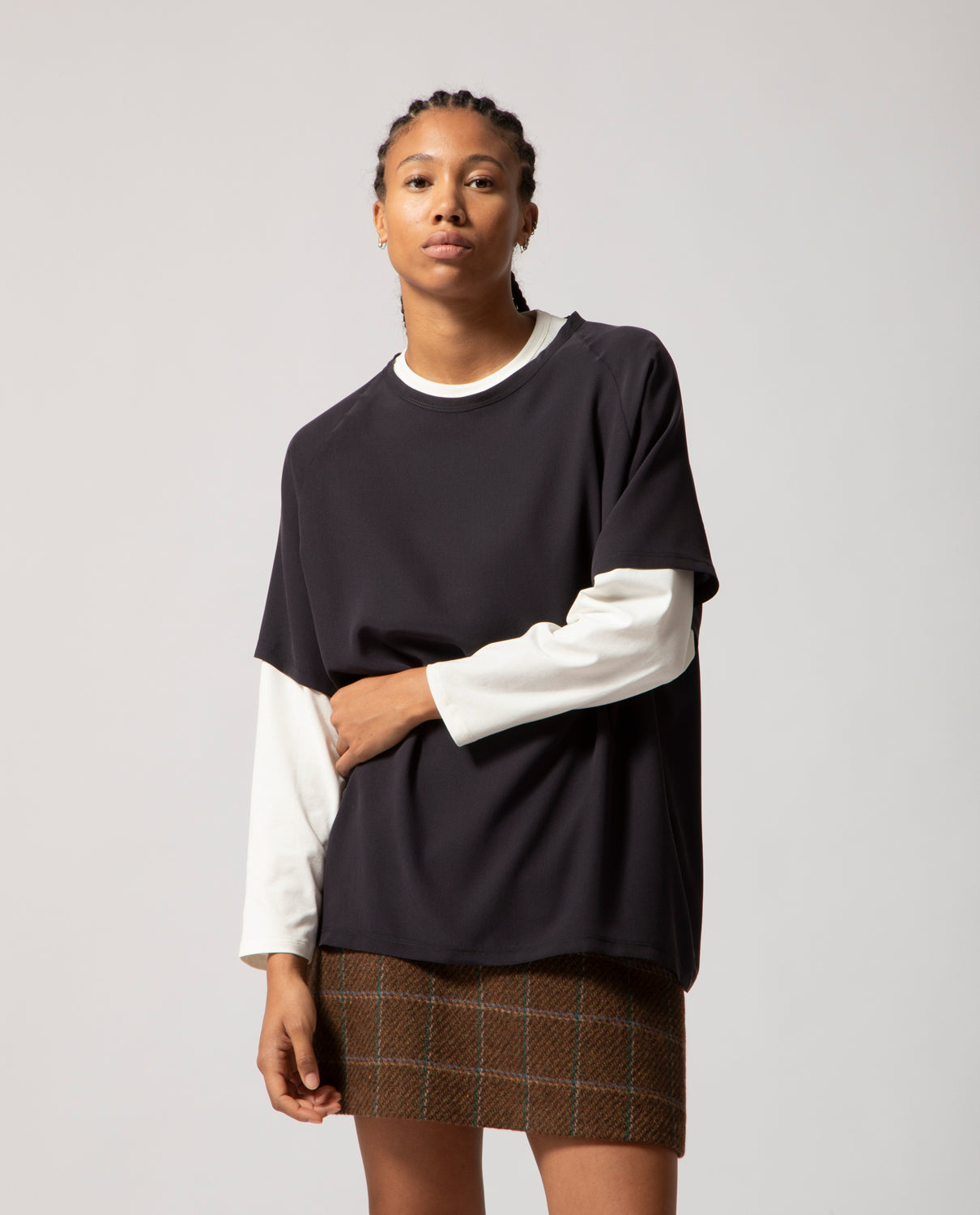 A two-in-one style, composed of a long-sleeved white cotton jersey T-shirt and a short-sleeved silk T-shirt in charcoal, layered together yet fully separable. Designed with raglan sleeves and cut to an oversized silhouette, it comfortably fits sizes S to L.