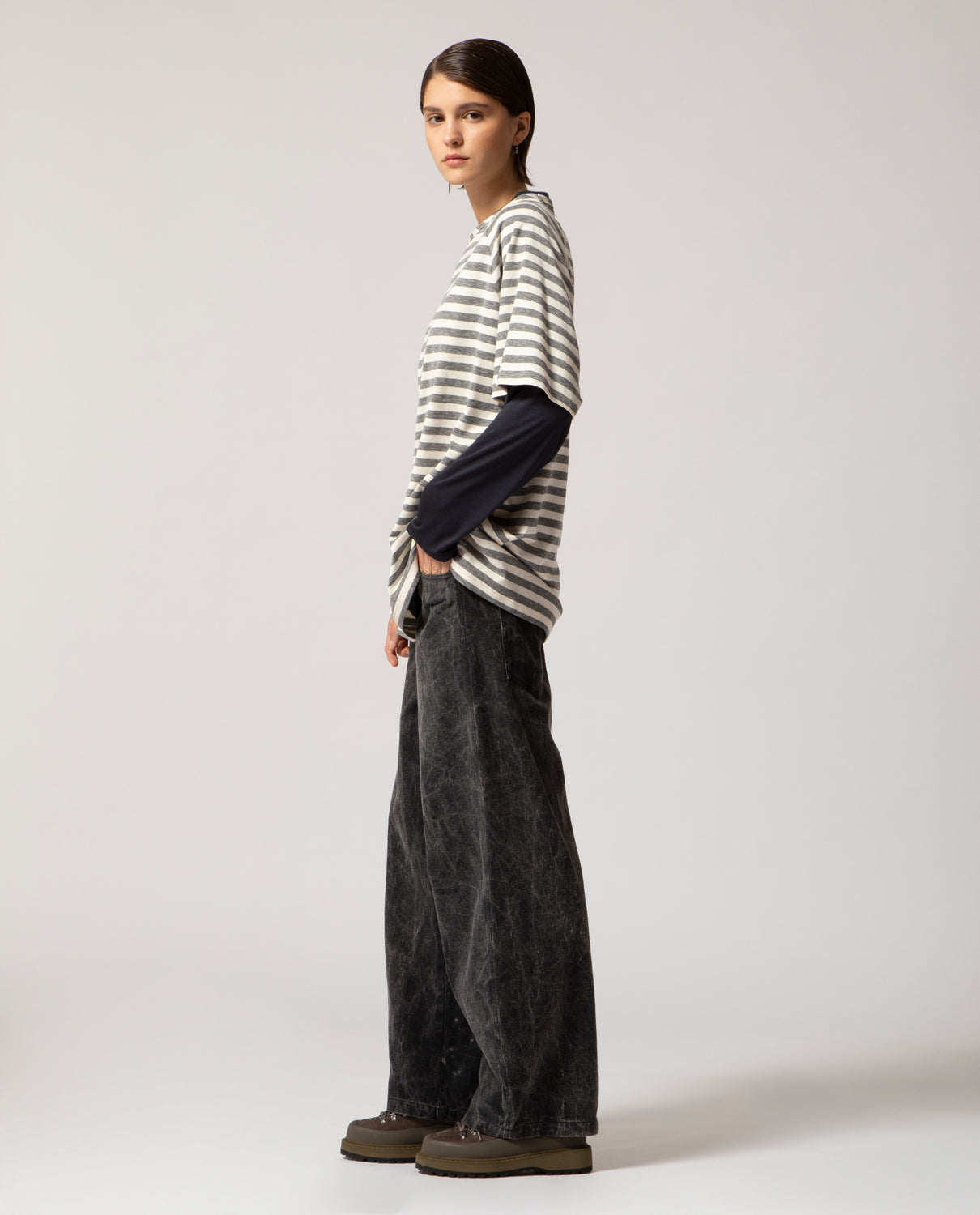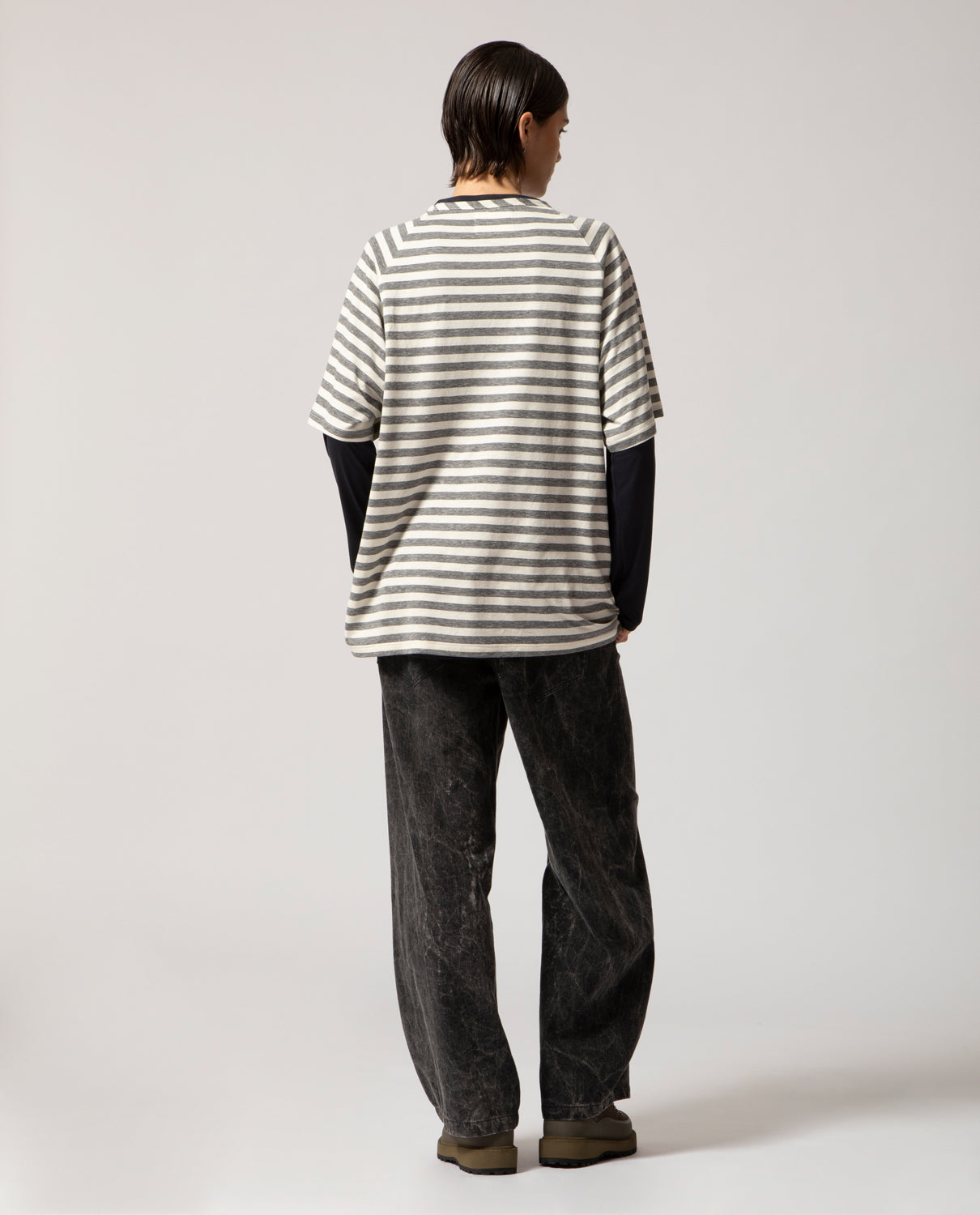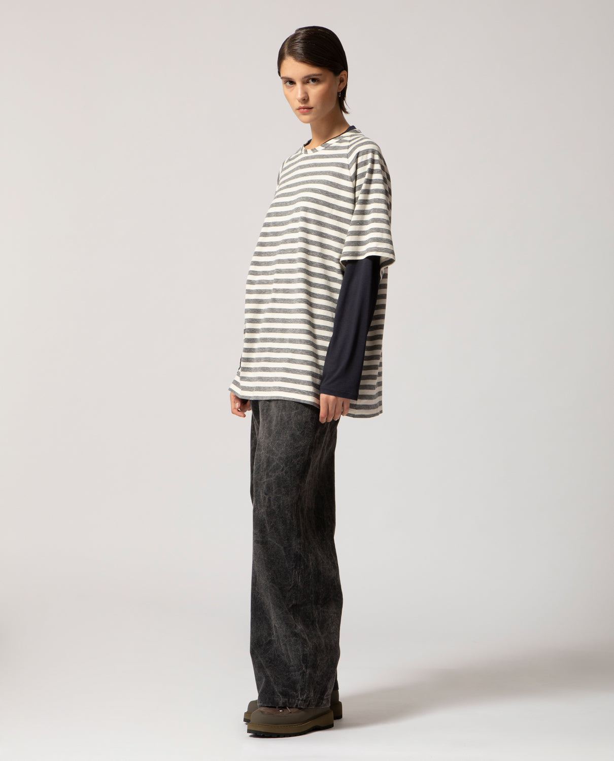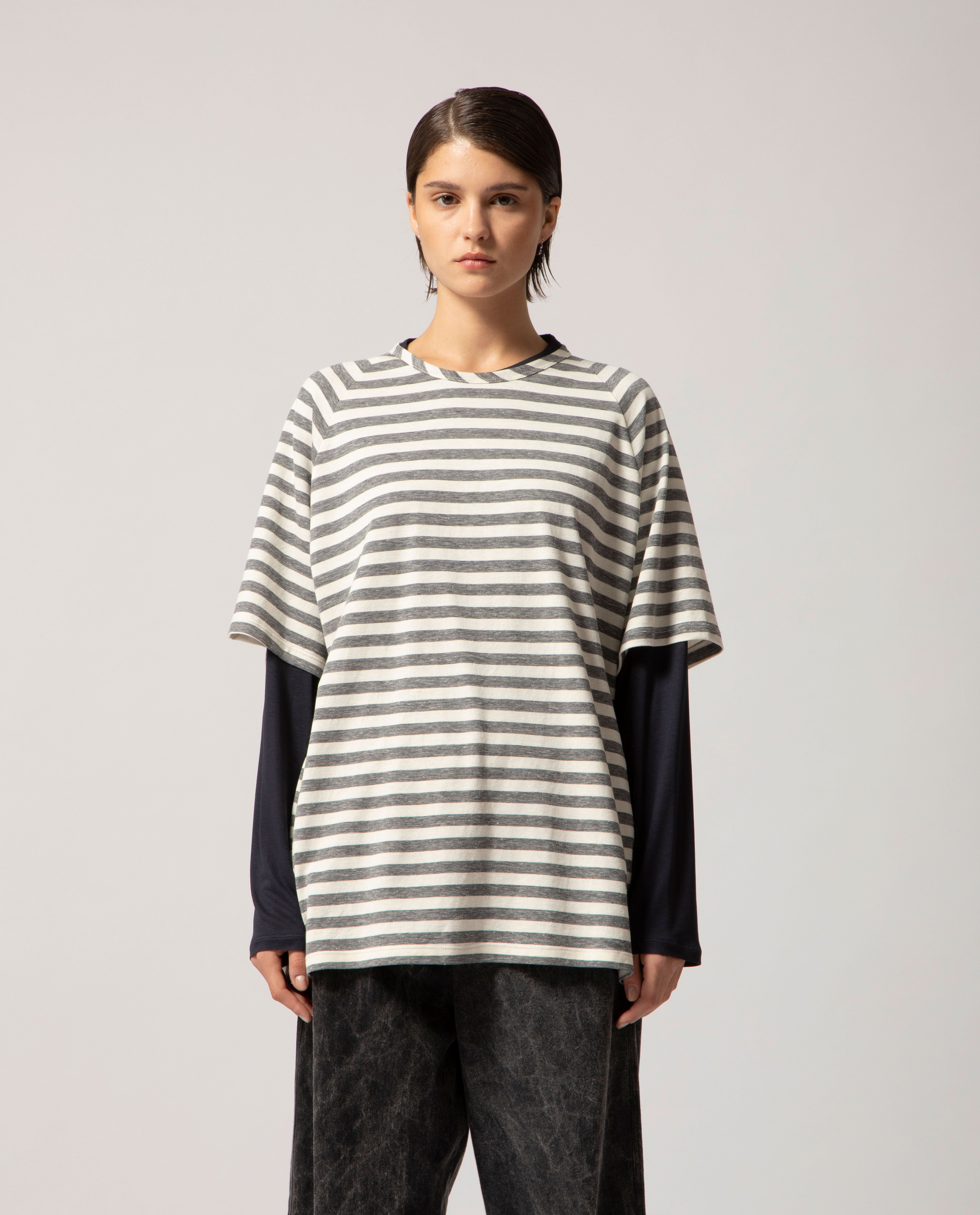 A two-in-one style composed of two contrasting cotton T-shirts, layered together yet fully separable. Designed with raglan sleeves and cut to an oversized silhouette, it comfortably fits sizes S to L.