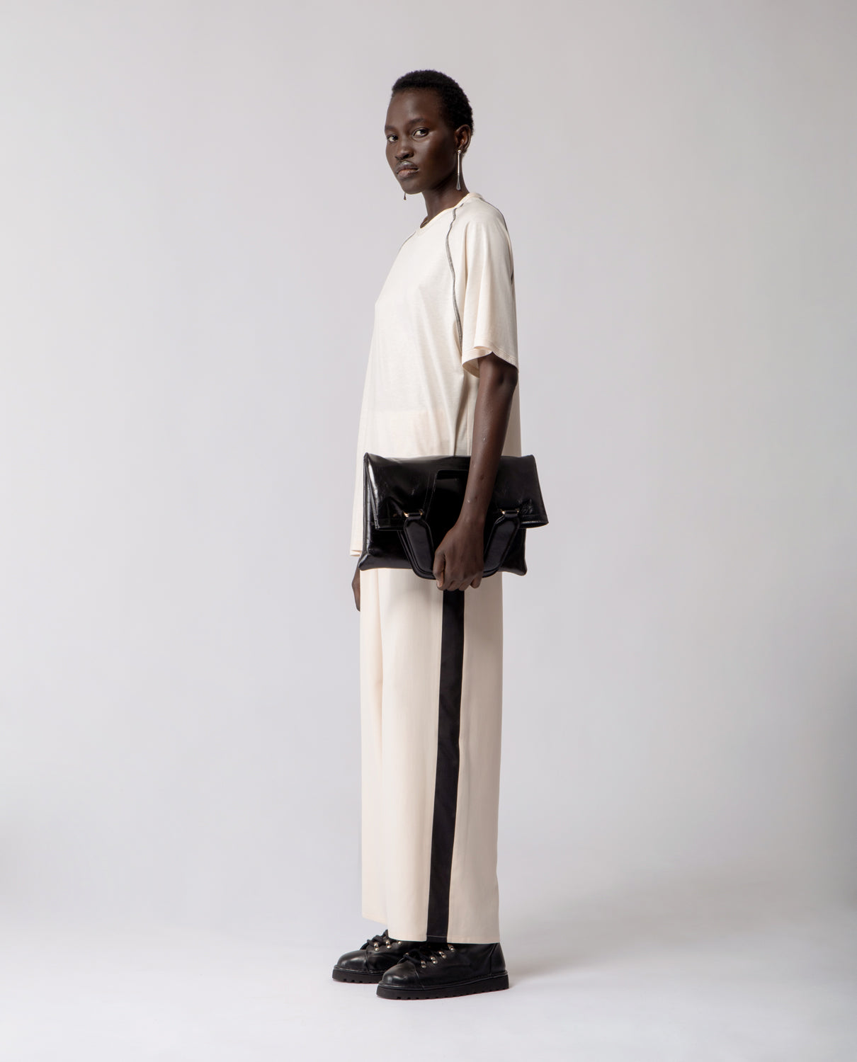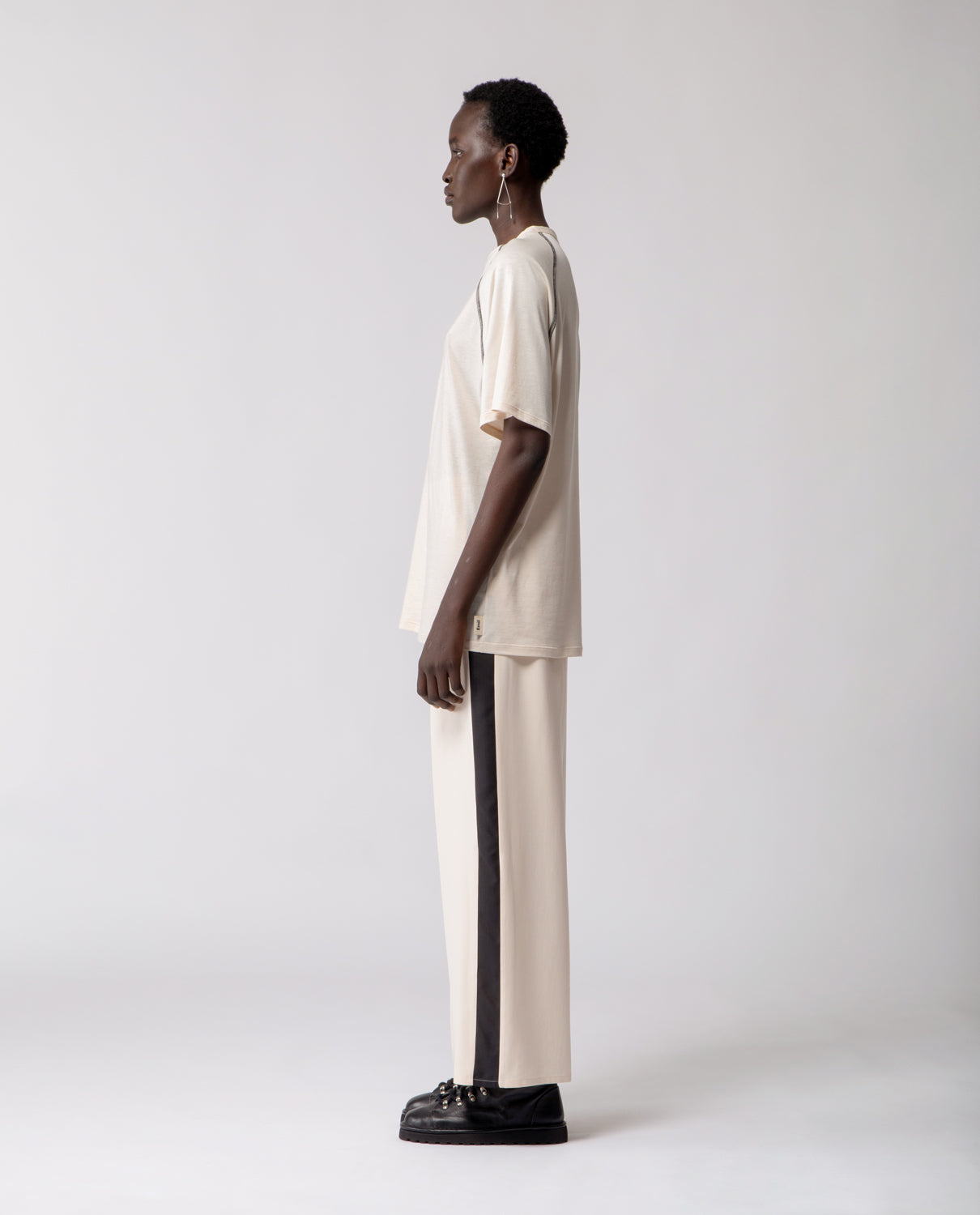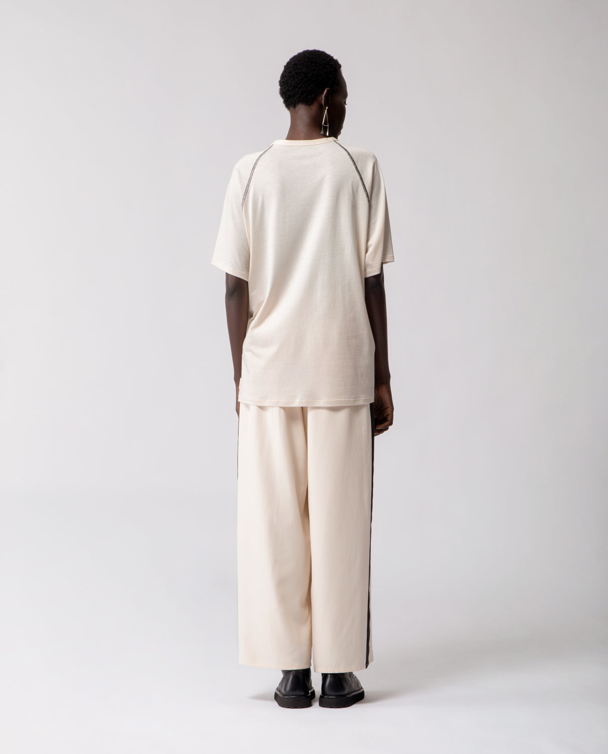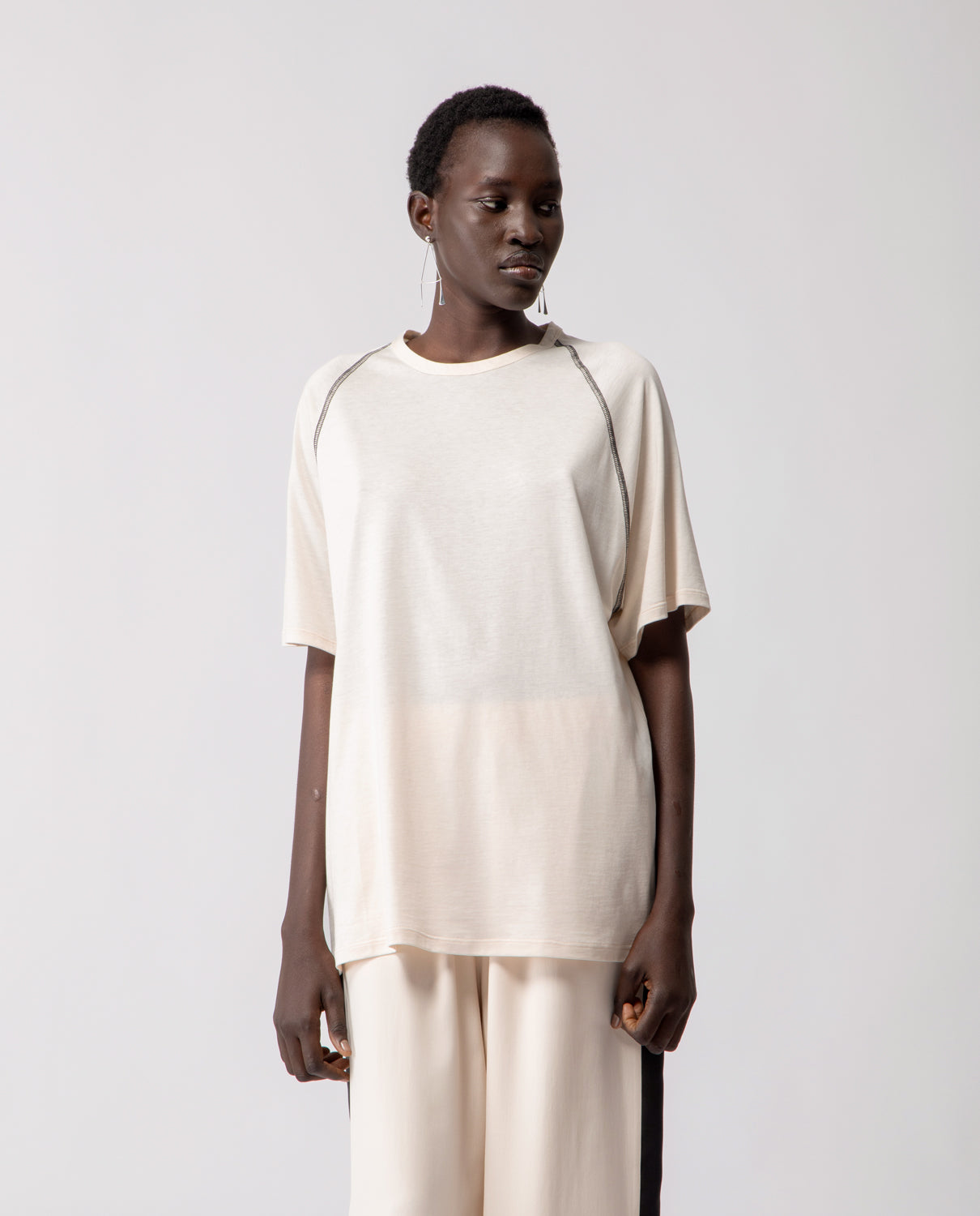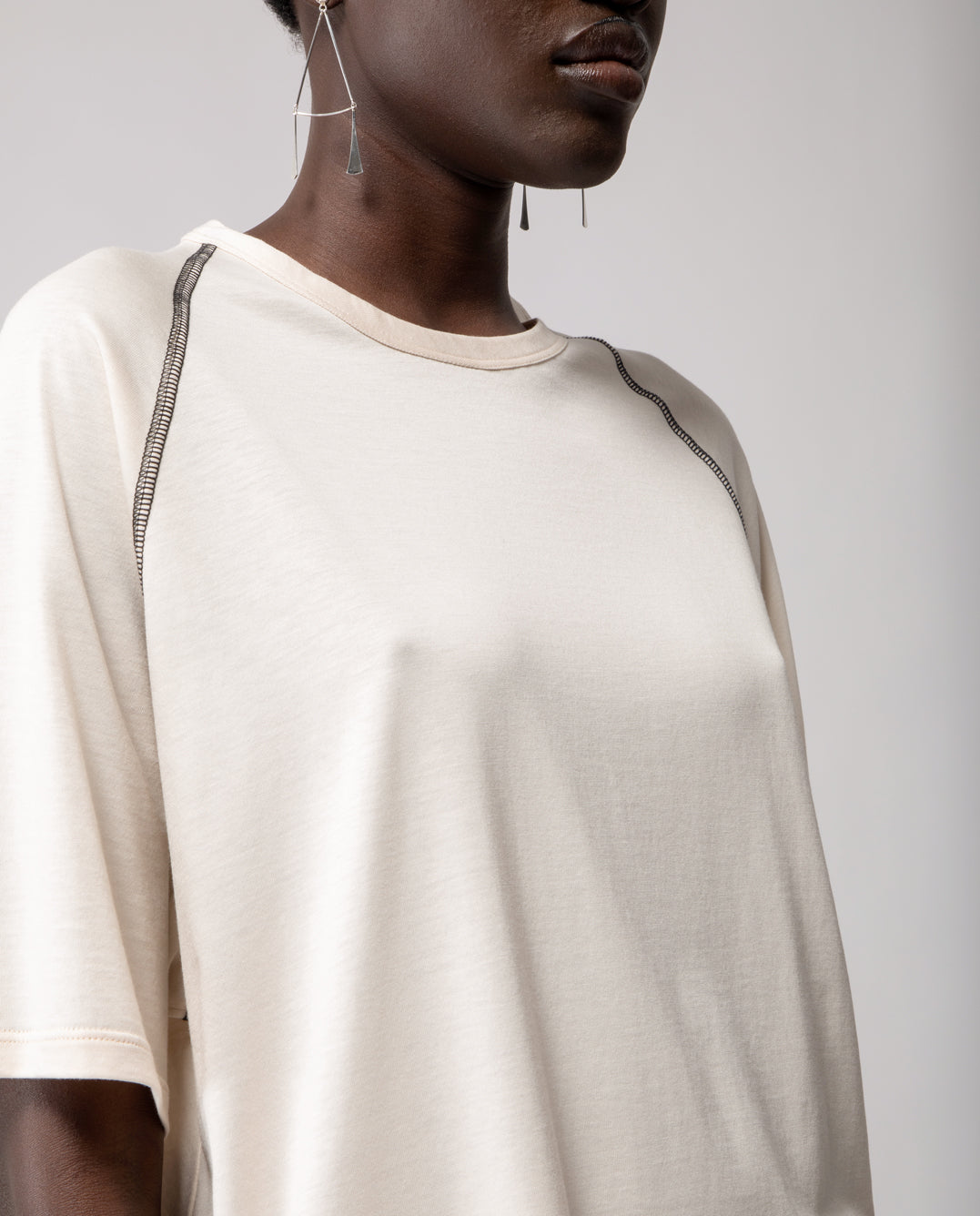 A soft everyday essential shirt, featuring raglan sleeves with contrasting stitching and an oversized silhouette designed to fit comfortably from size S to L.
