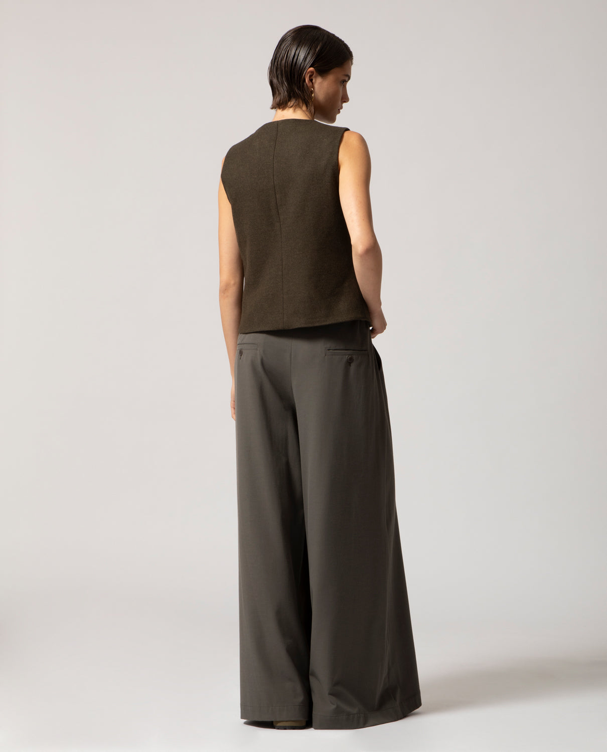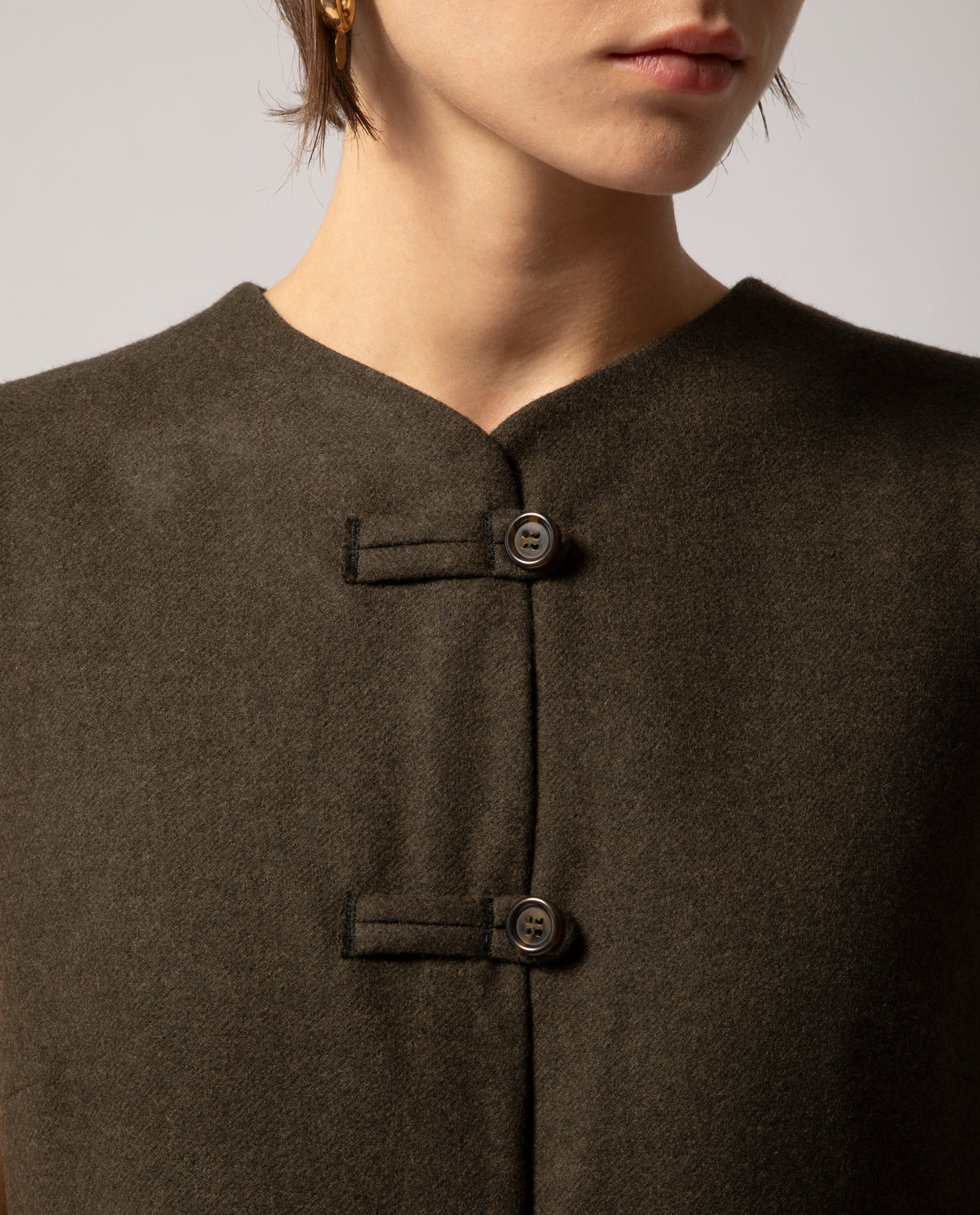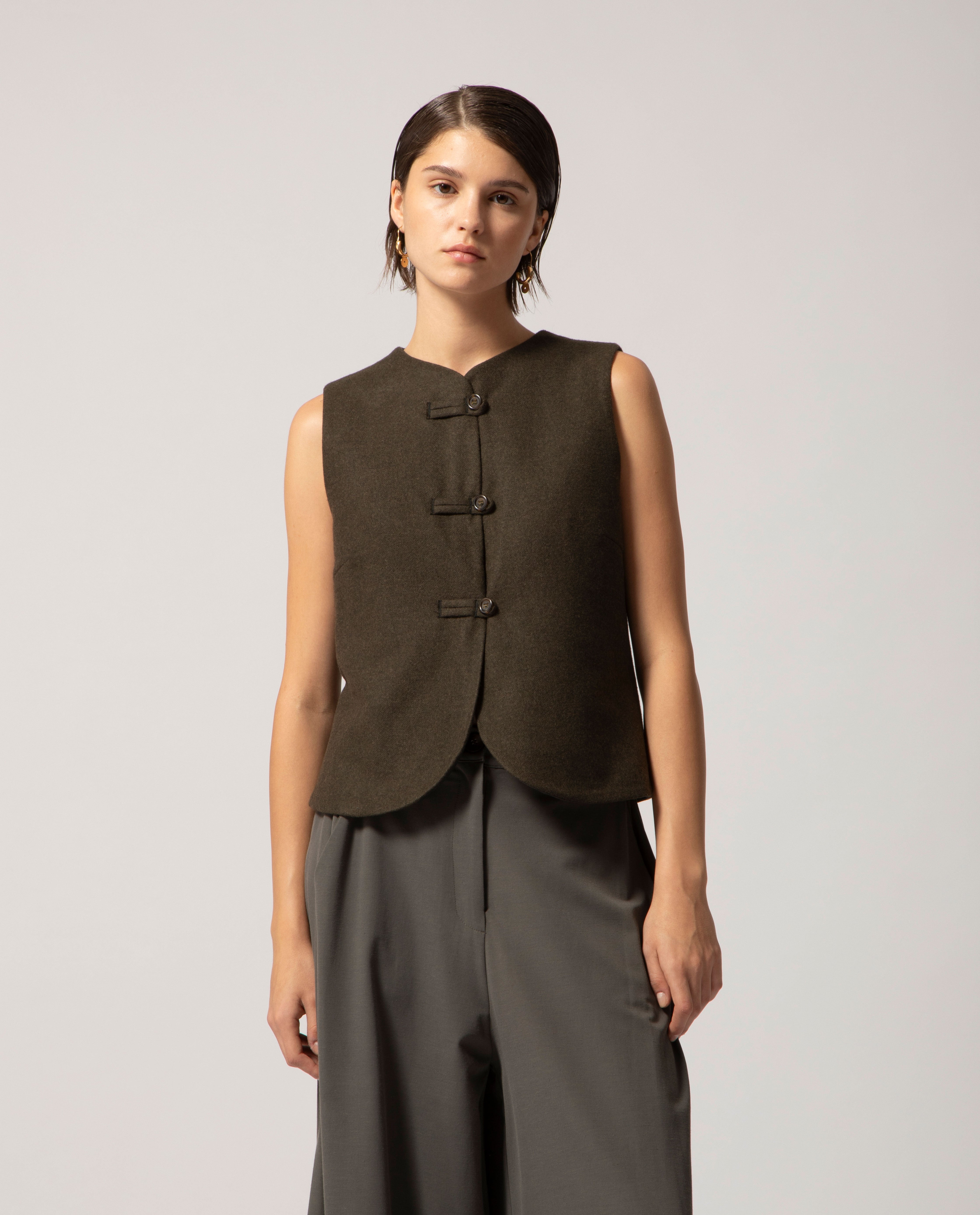 Tailored from 100% wool, this gilet is cut to a slim, fitted silhouette and offered in three sizes. The front is detailed with hand-applied fastenings inspired by traditional Chinese closures, adding an artisanal touch to its clean design.