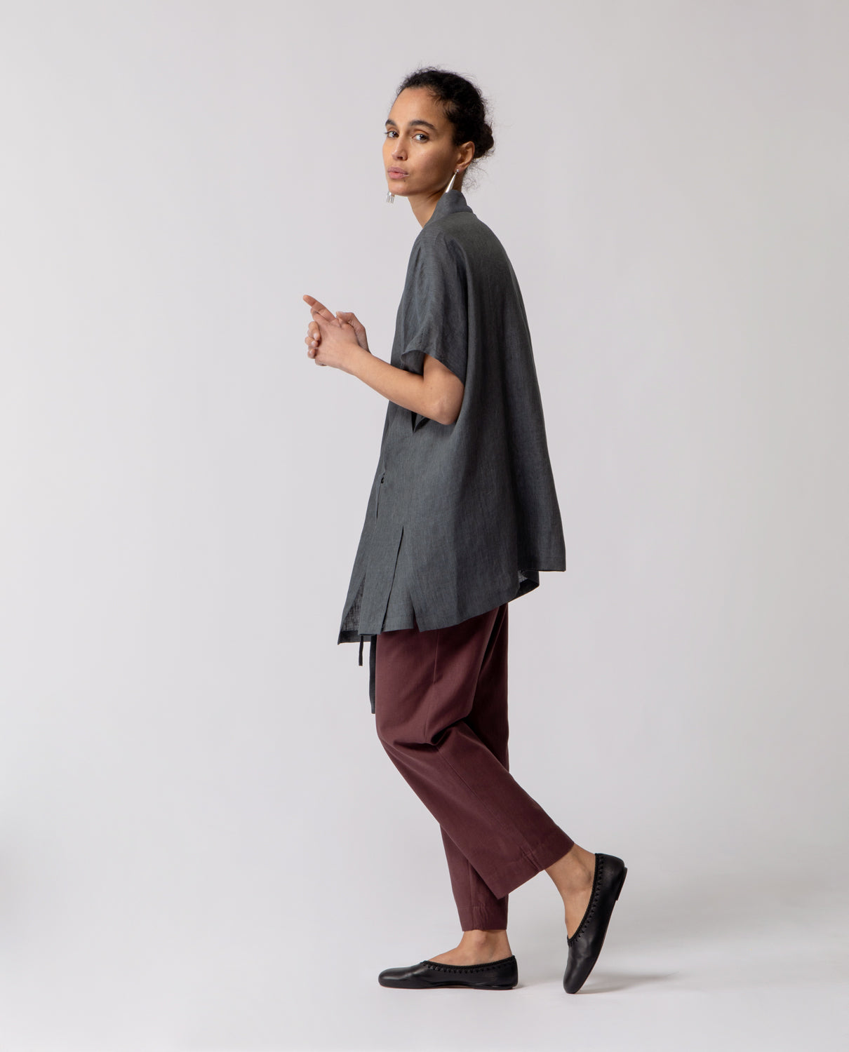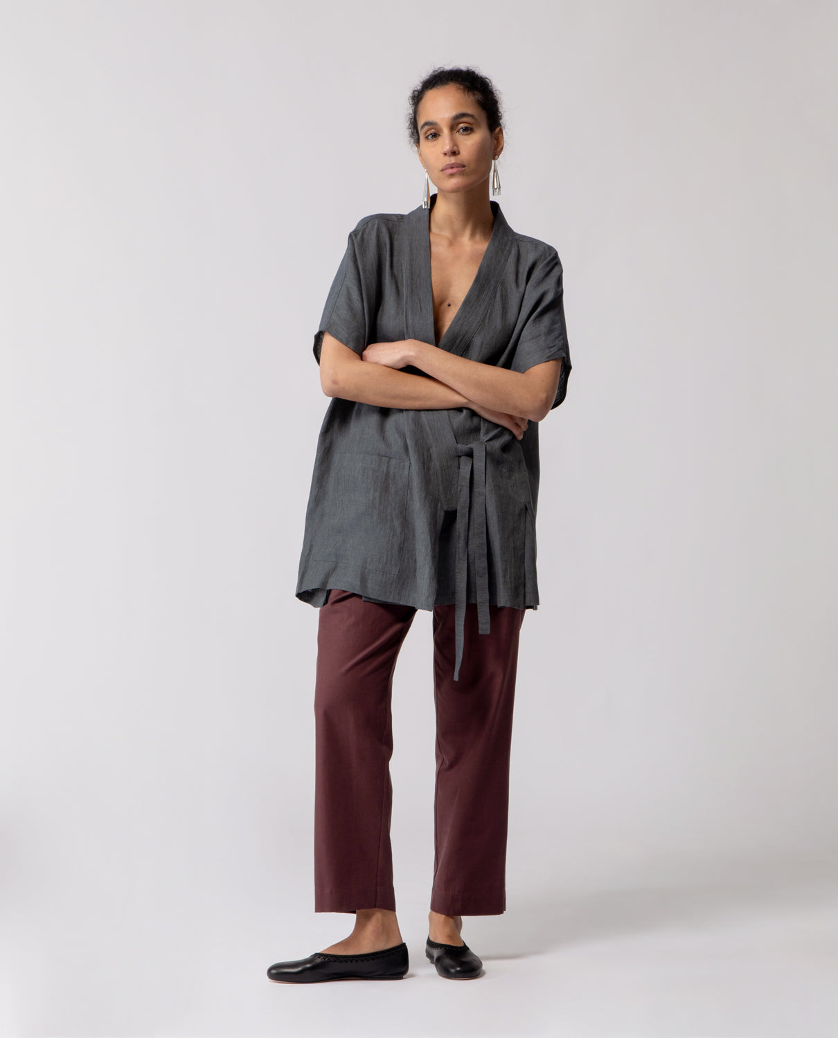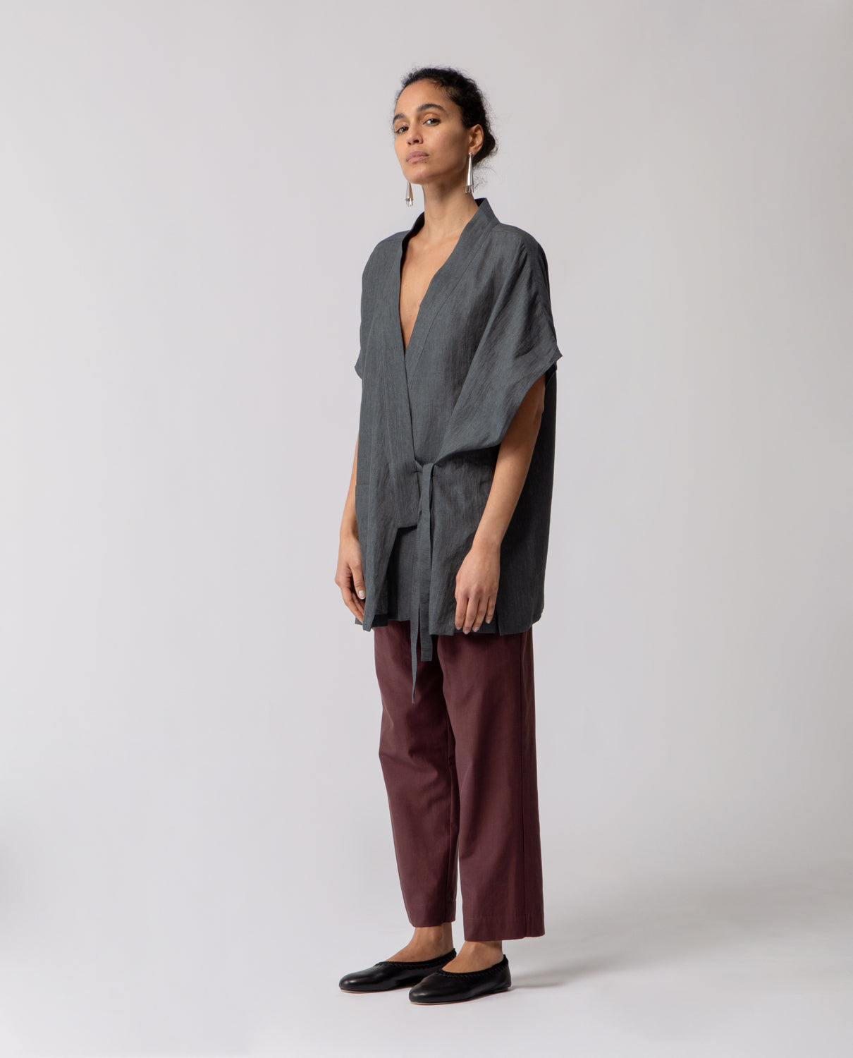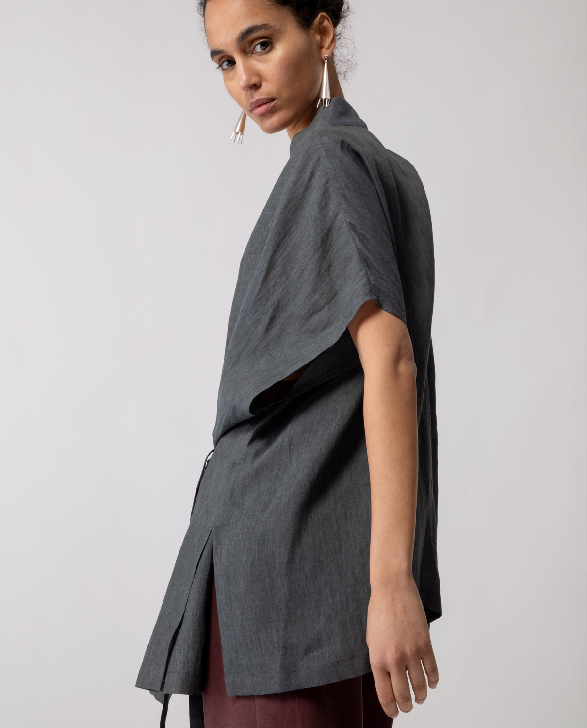 One-size kimono with an oversized, sleeveless silhouette and a relaxed fit. Designed with a patch pocket on the left side and a neckline inspired by the traditional kimono cut. The garment can be fastened with a self-tie belt crafted from the same fabric.