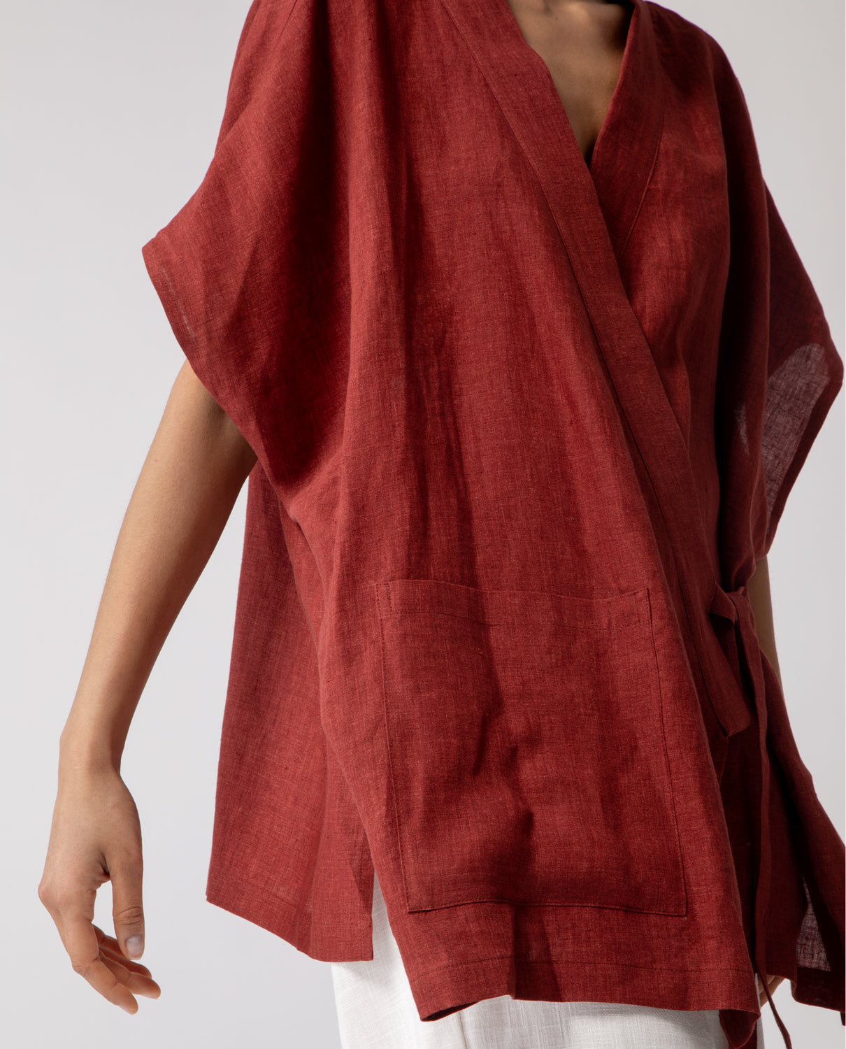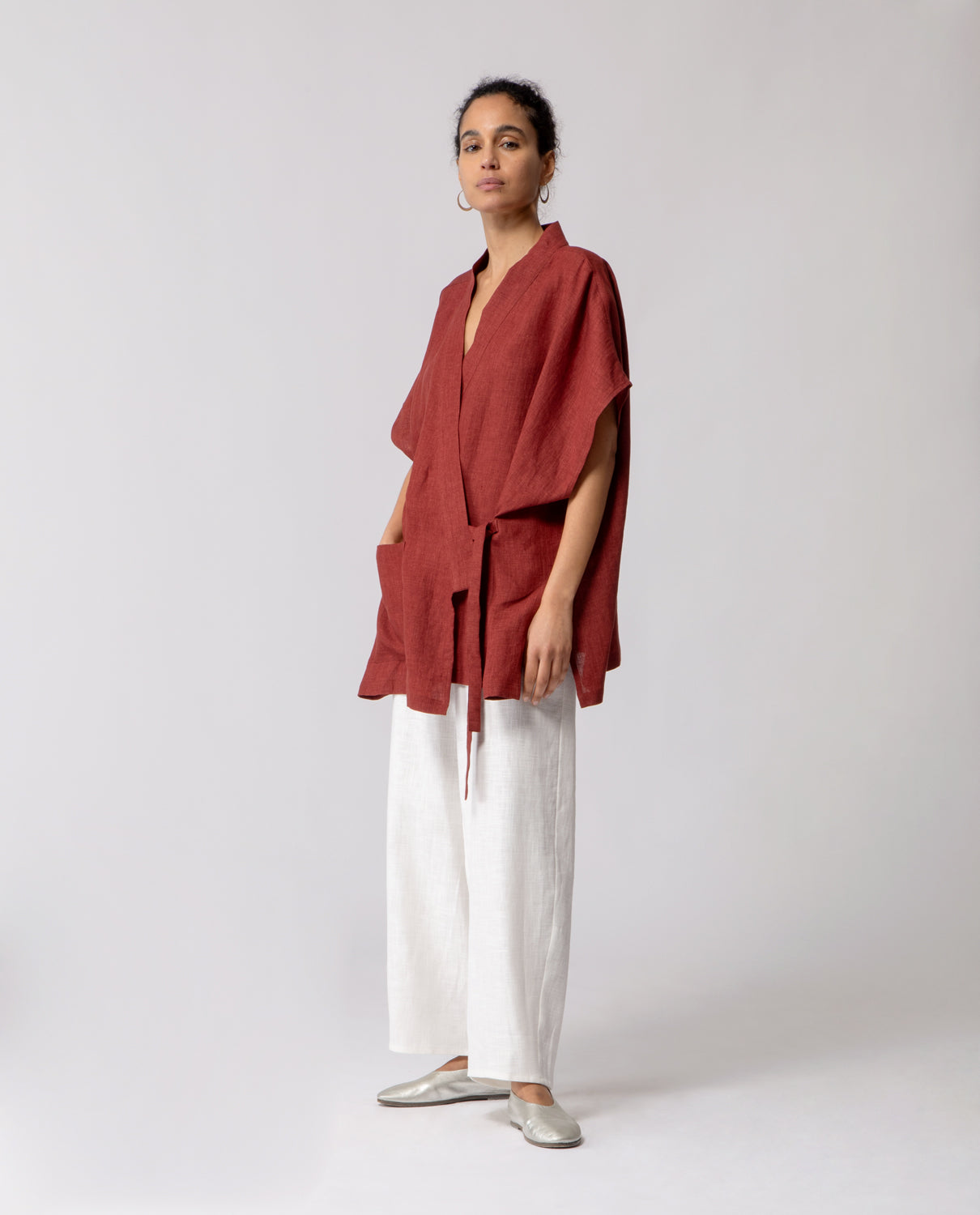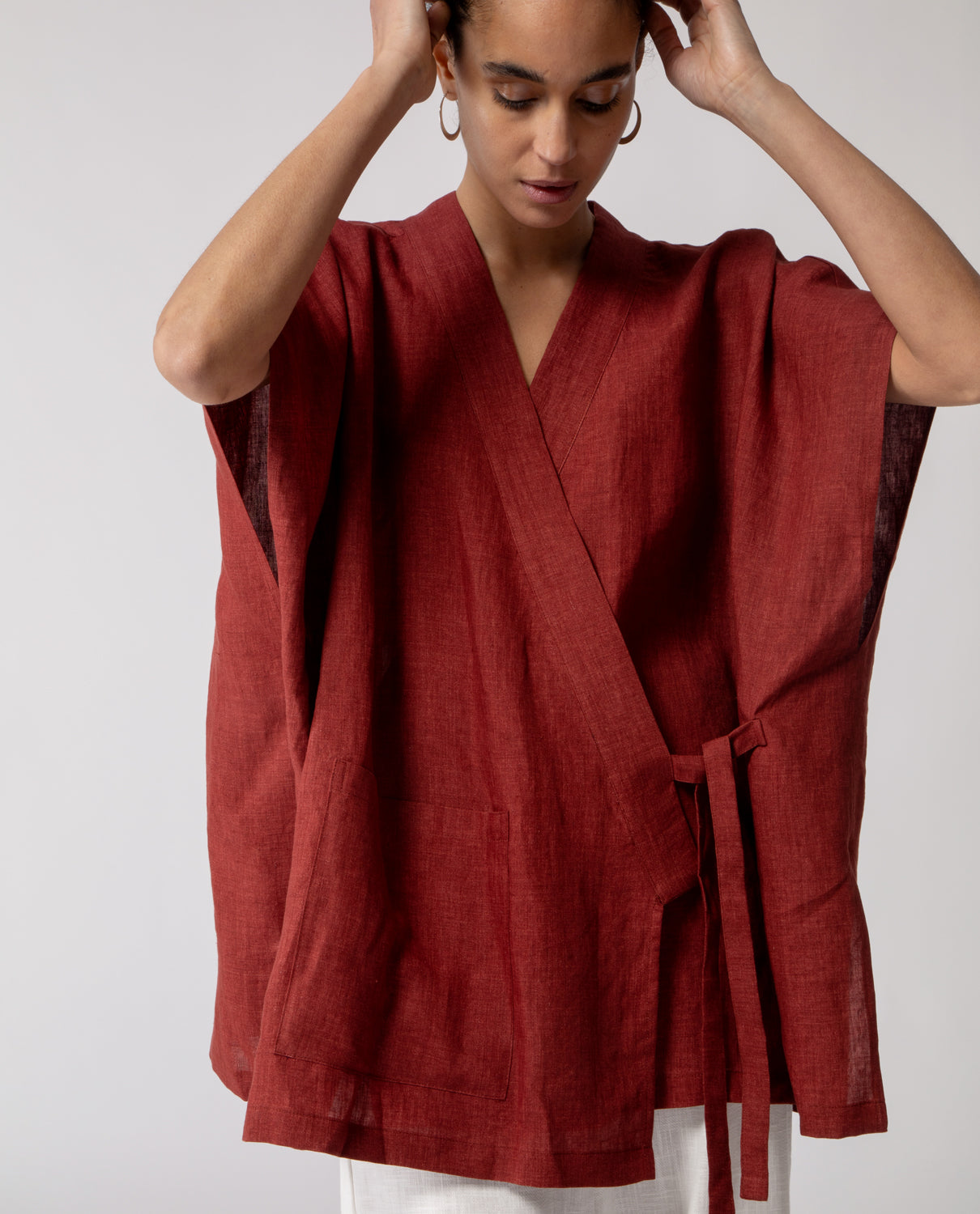 One-size kimono with an oversized, sleeveless silhouette and a relaxed fit. Designed with a patch pocket on the left side and a neckline inspired by the traditional kimono cut. The garment can be fastened with a self-tie belt crafted from the same fabric.