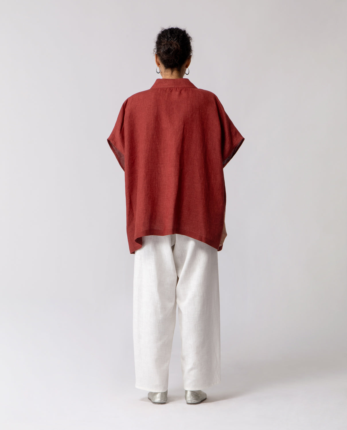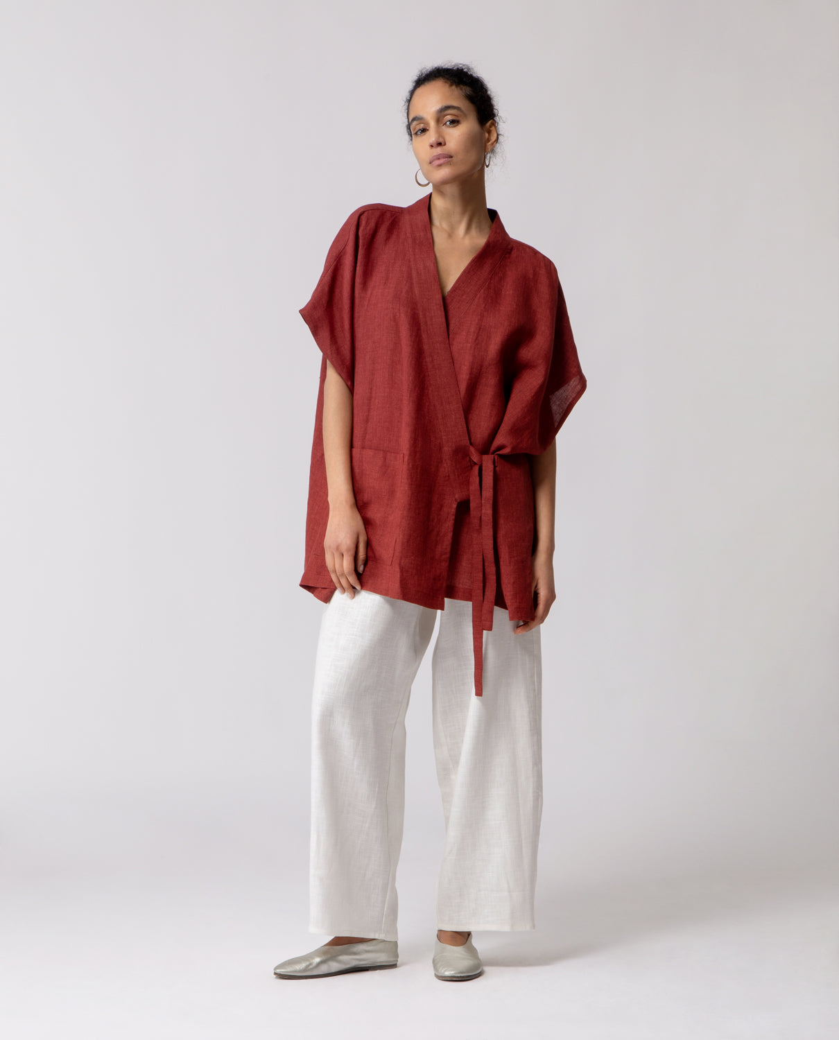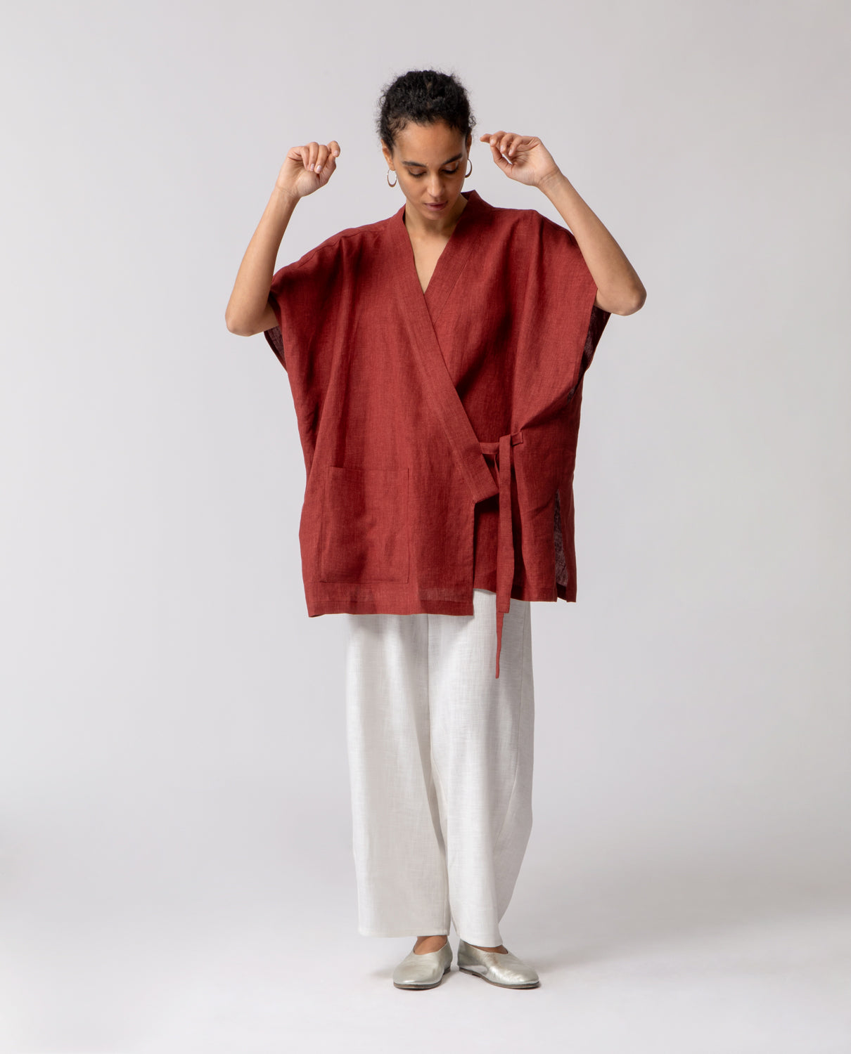 One-size kimono with an oversized, sleeveless silhouette and a relaxed fit. Designed with a patch pocket on the left side and a neckline inspired by the traditional kimono cut. The garment can be fastened with a self-tie belt crafted from the same fabric.