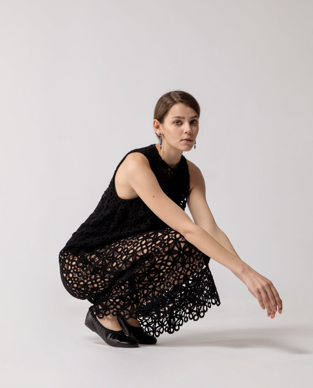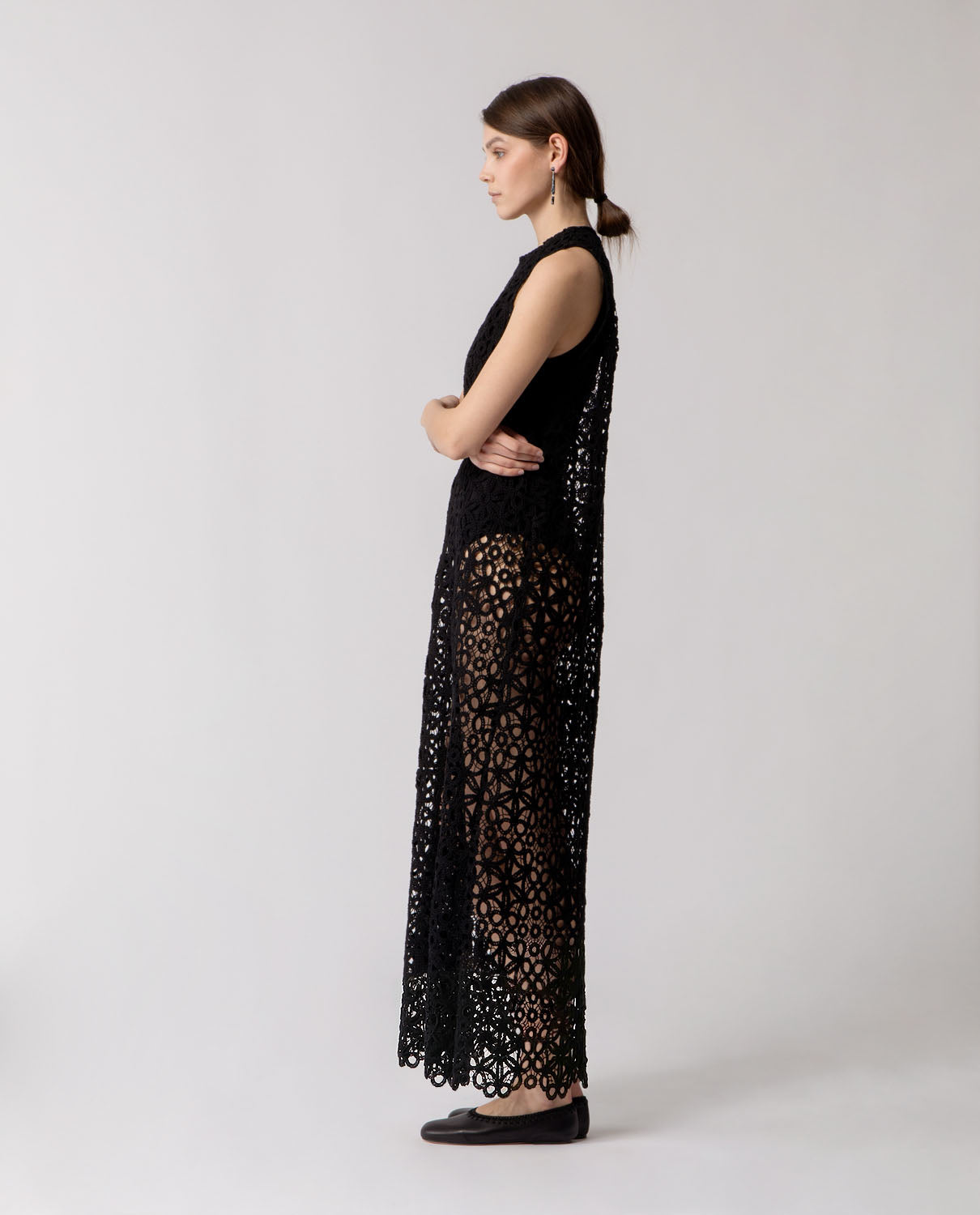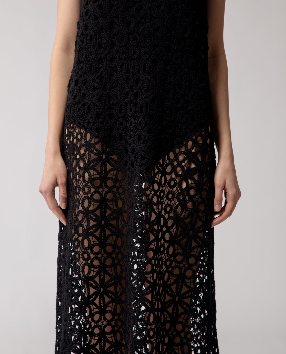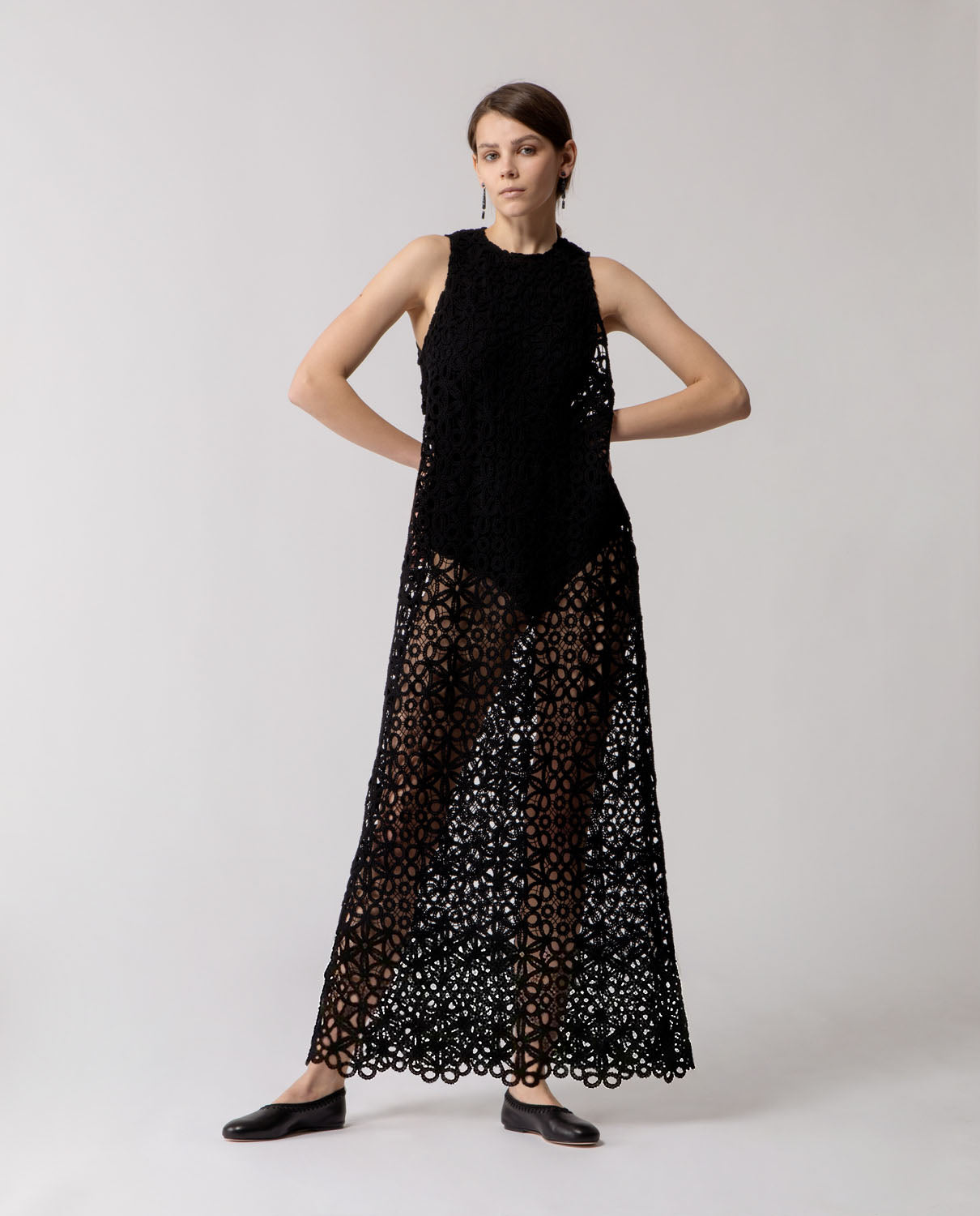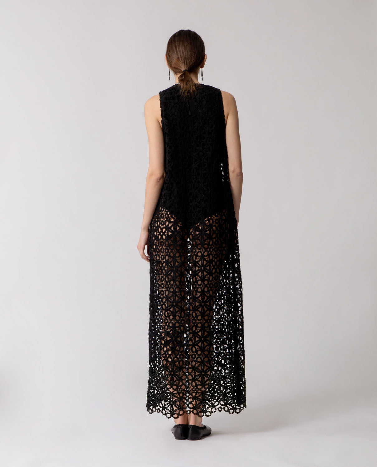 Long trapeze dress crafted from patterned floral cotton lace, defined by a fluid, airy silhouette. It is paired with a cotton crew-neck bodysuit featuring a tone-on-tone snap closure at the crotch, offering coverage while preserving the lightness and transparency of the lace.