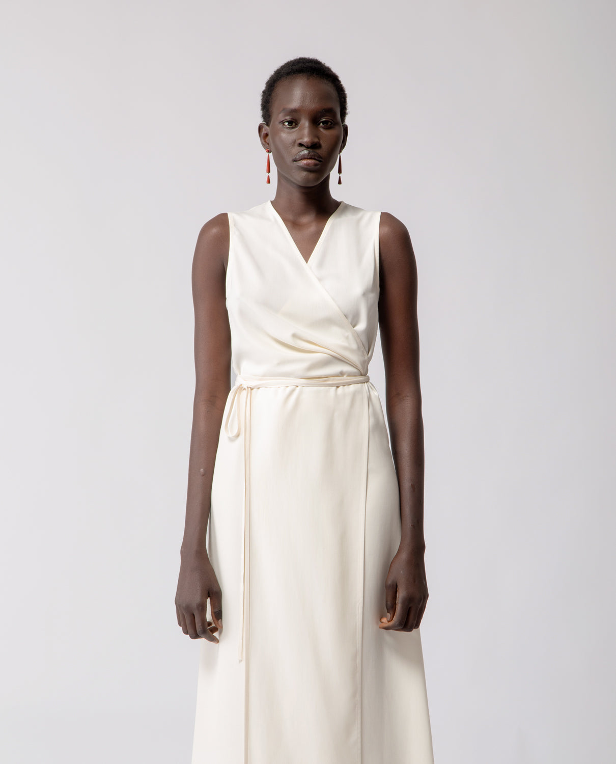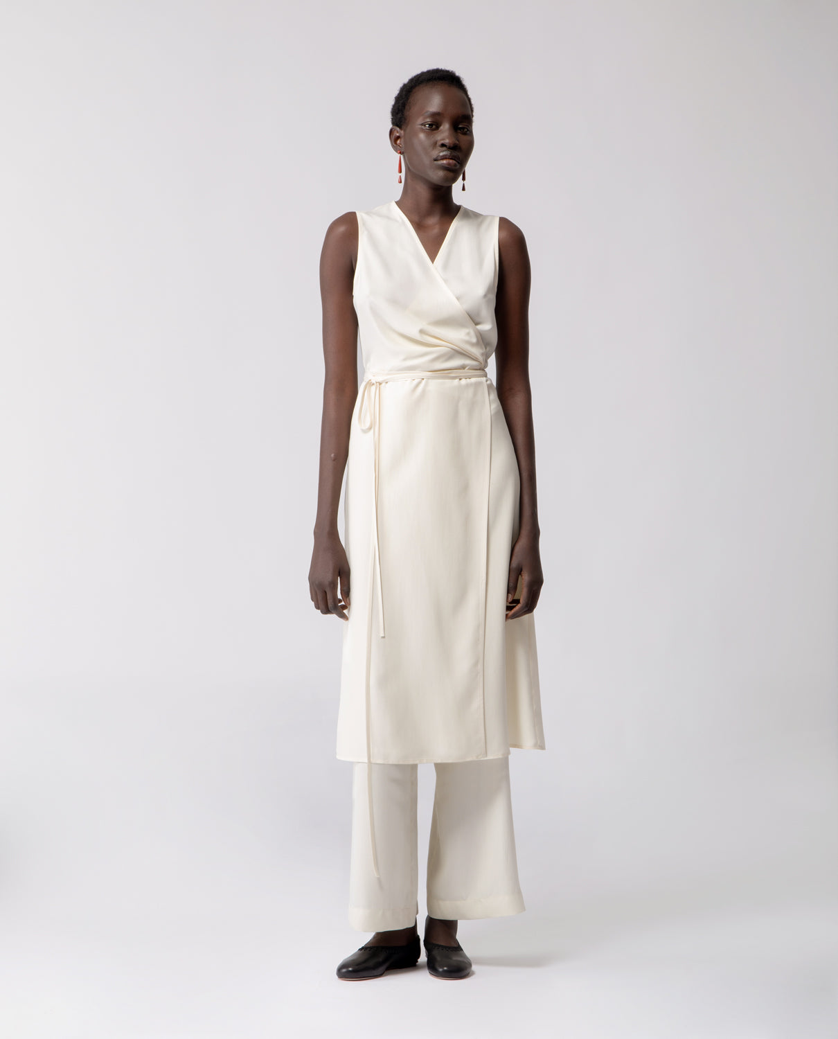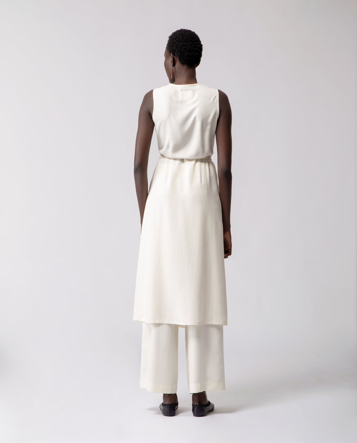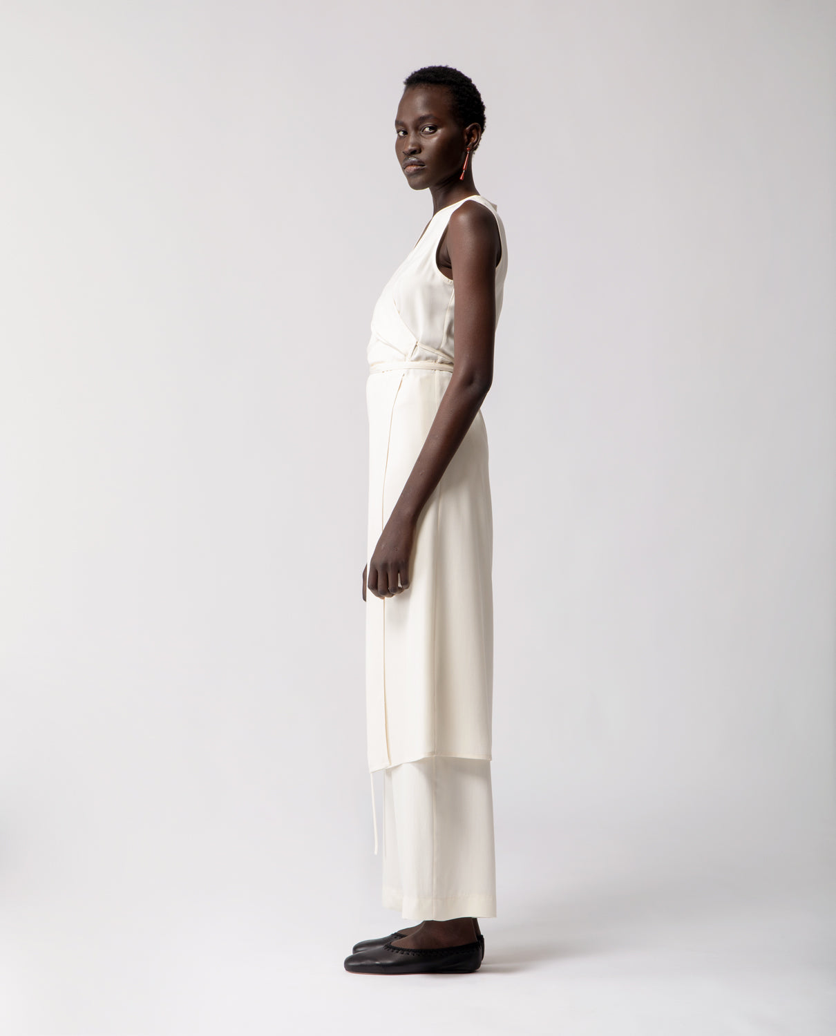 A study in balance and restraint, this set draws from the quiet elegance of East Asian wrap silhouettes. A sleeveless silk dress fastens with a delicate tie, softly tracing the body, and is paired with matching trousers to create a fluid, elongated line.