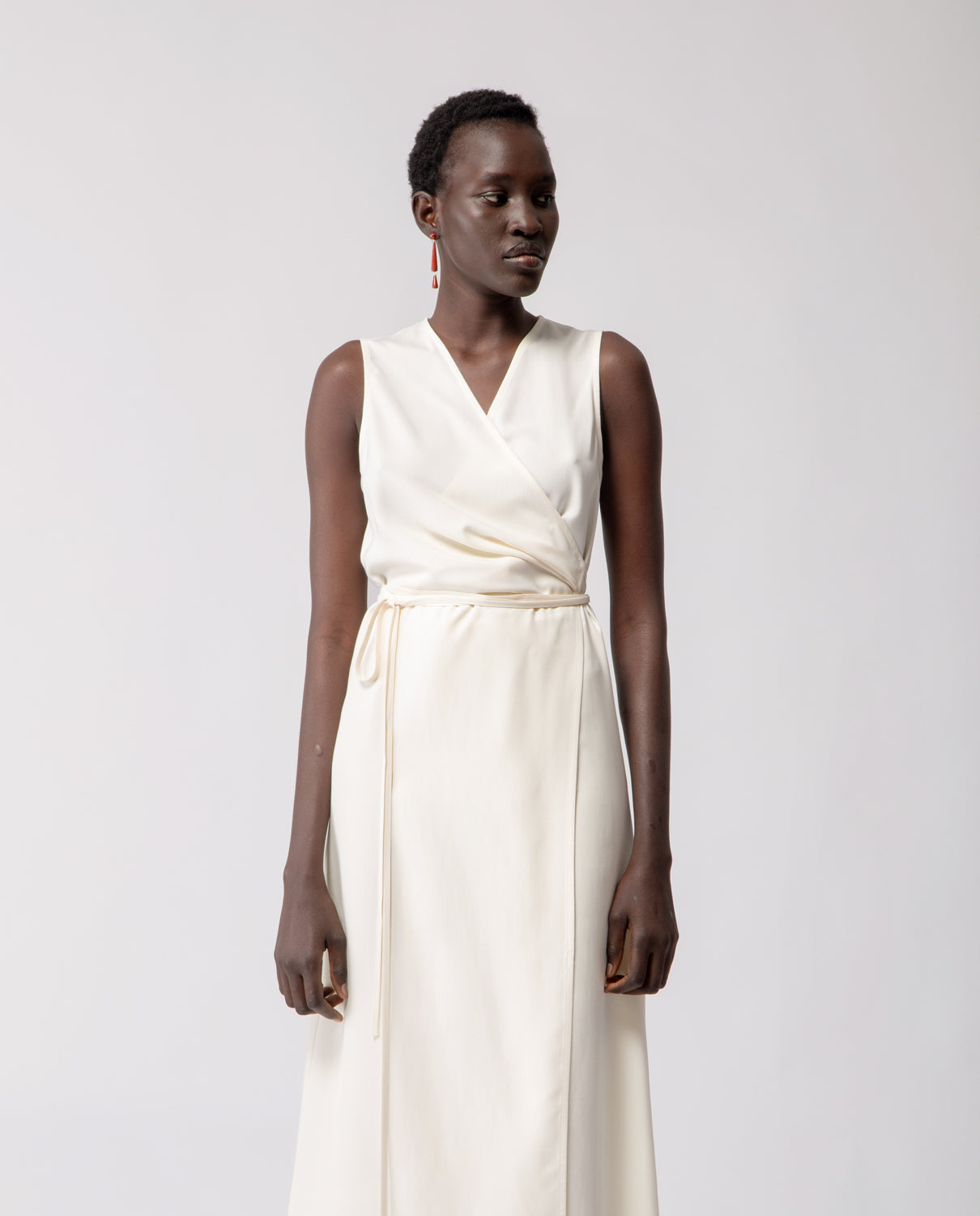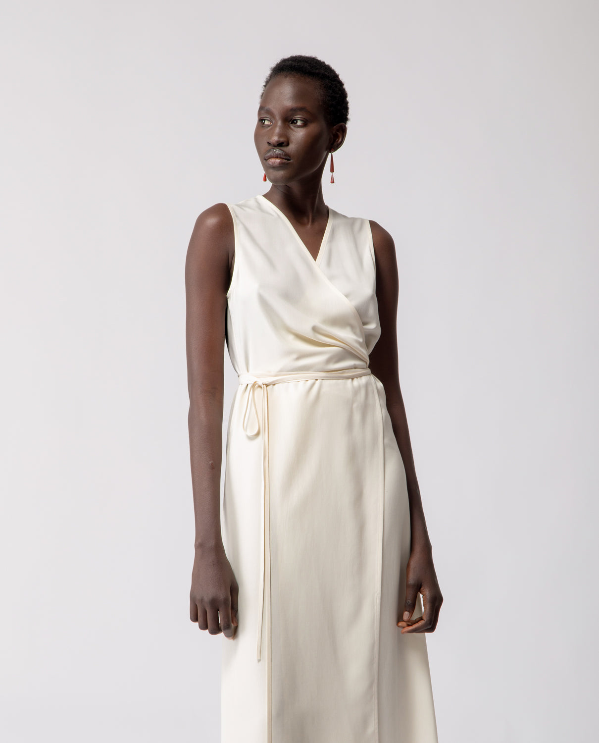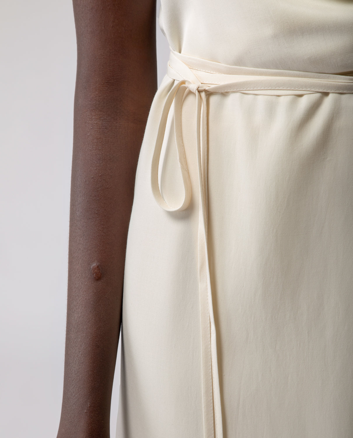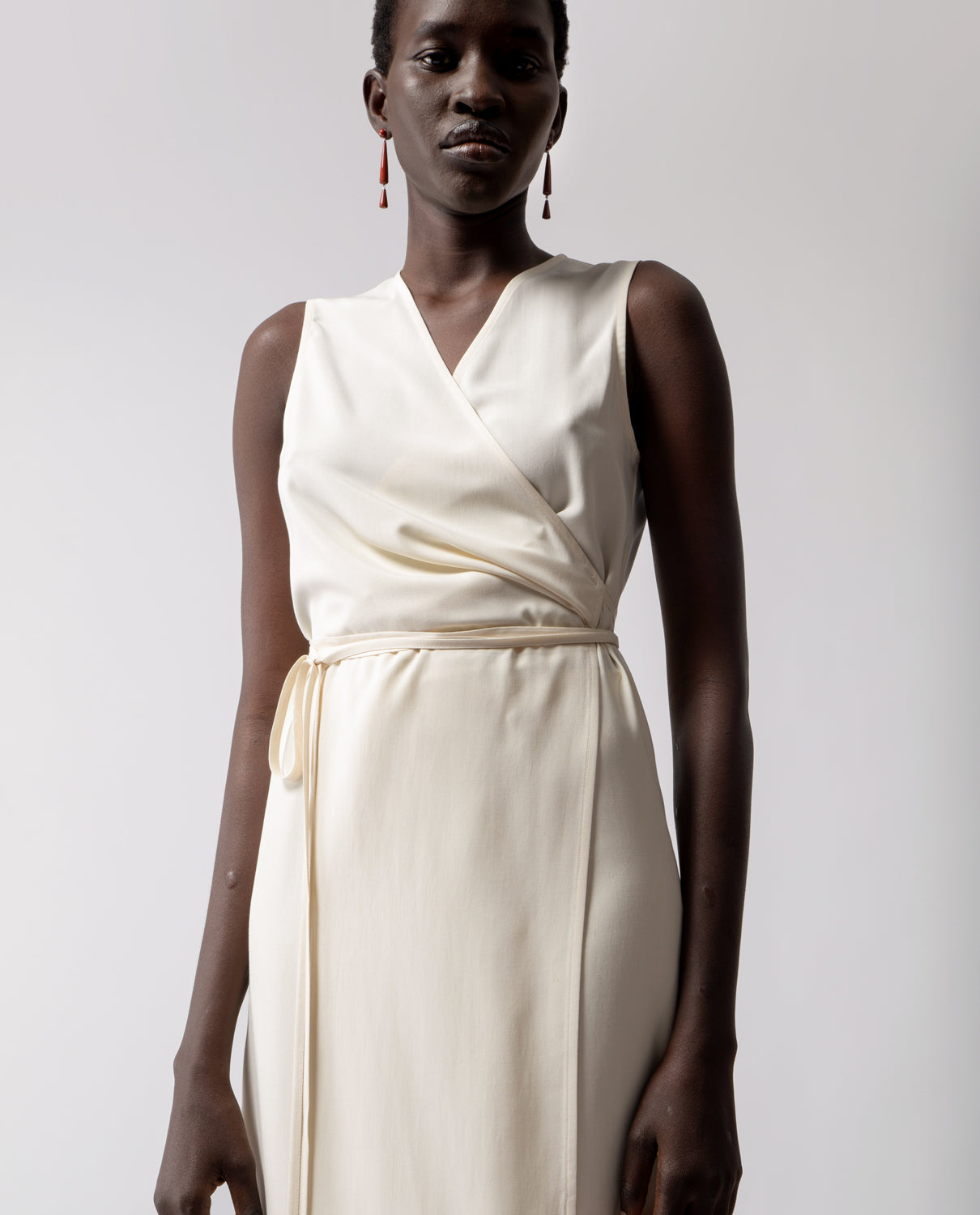 A study in balance and restraint, this set draws from the quiet elegance of East Asian wrap silhouettes. A sleeveless silk dress fastens with a delicate tie, softly tracing the body, and is paired with matching trousers to create a fluid, elongated line.