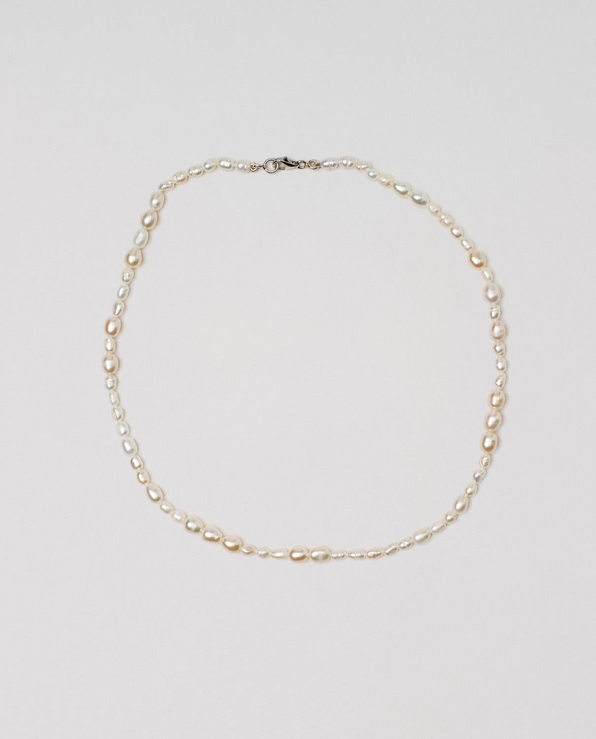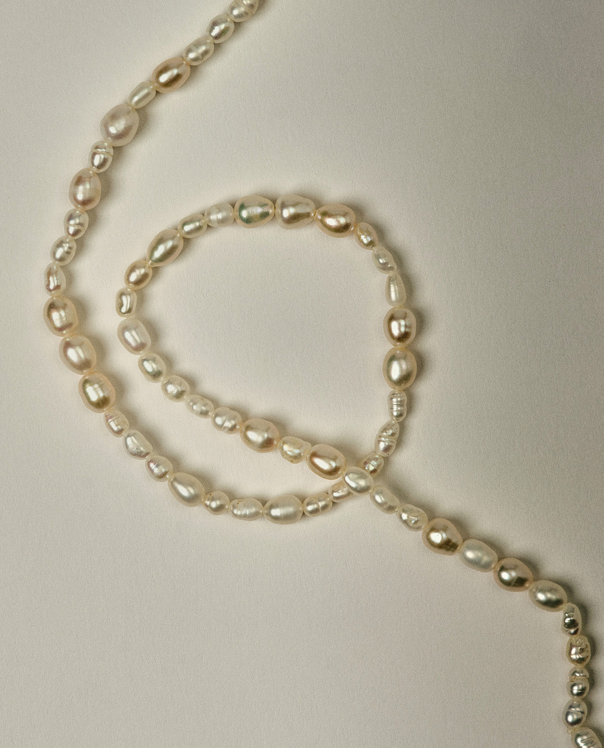A delicate necklace composed of small natural freshwater pearls, celebrated for their natural beauty and unique shade. Each pearl’s shape and subtle tones make every piece singular and distinctive.