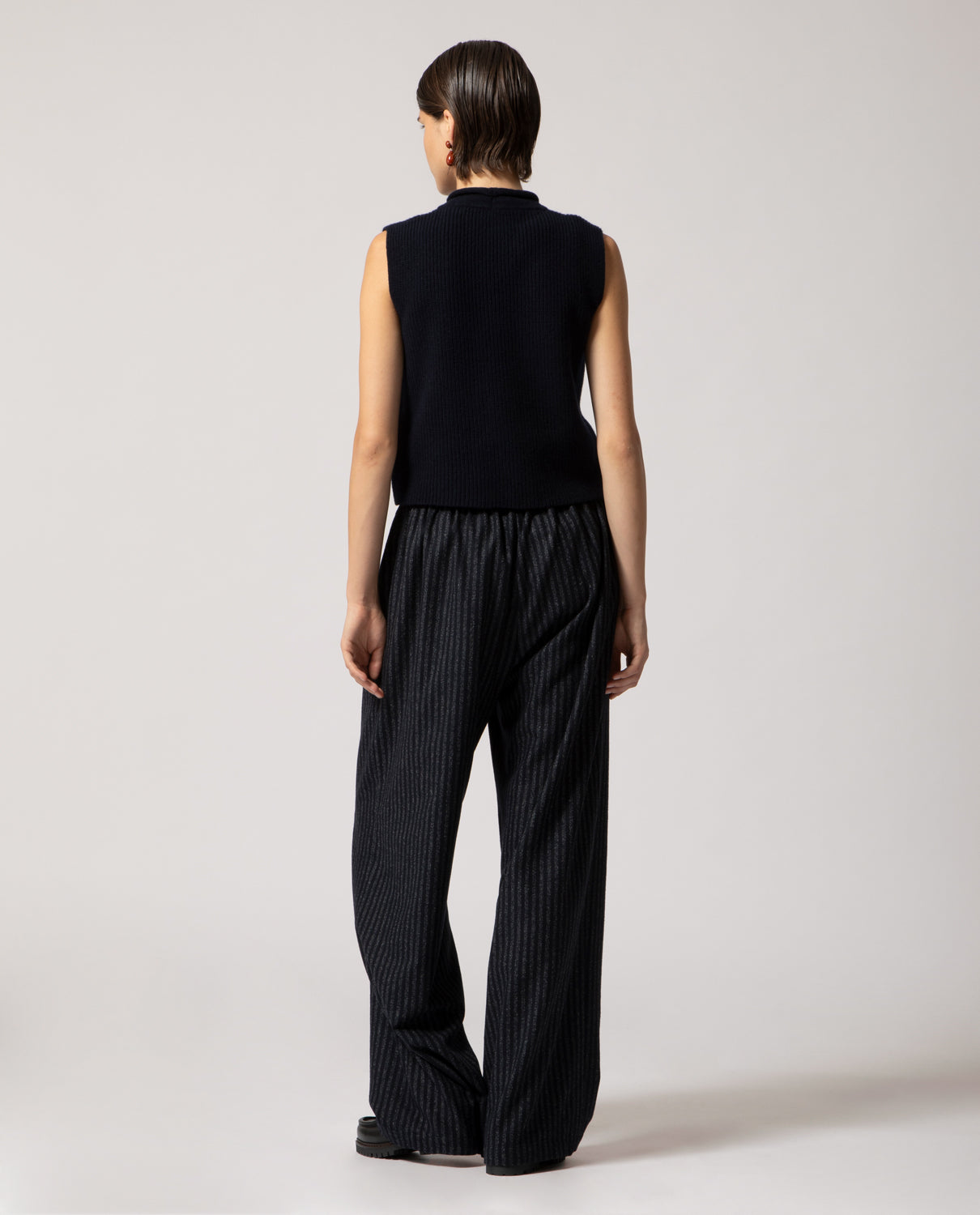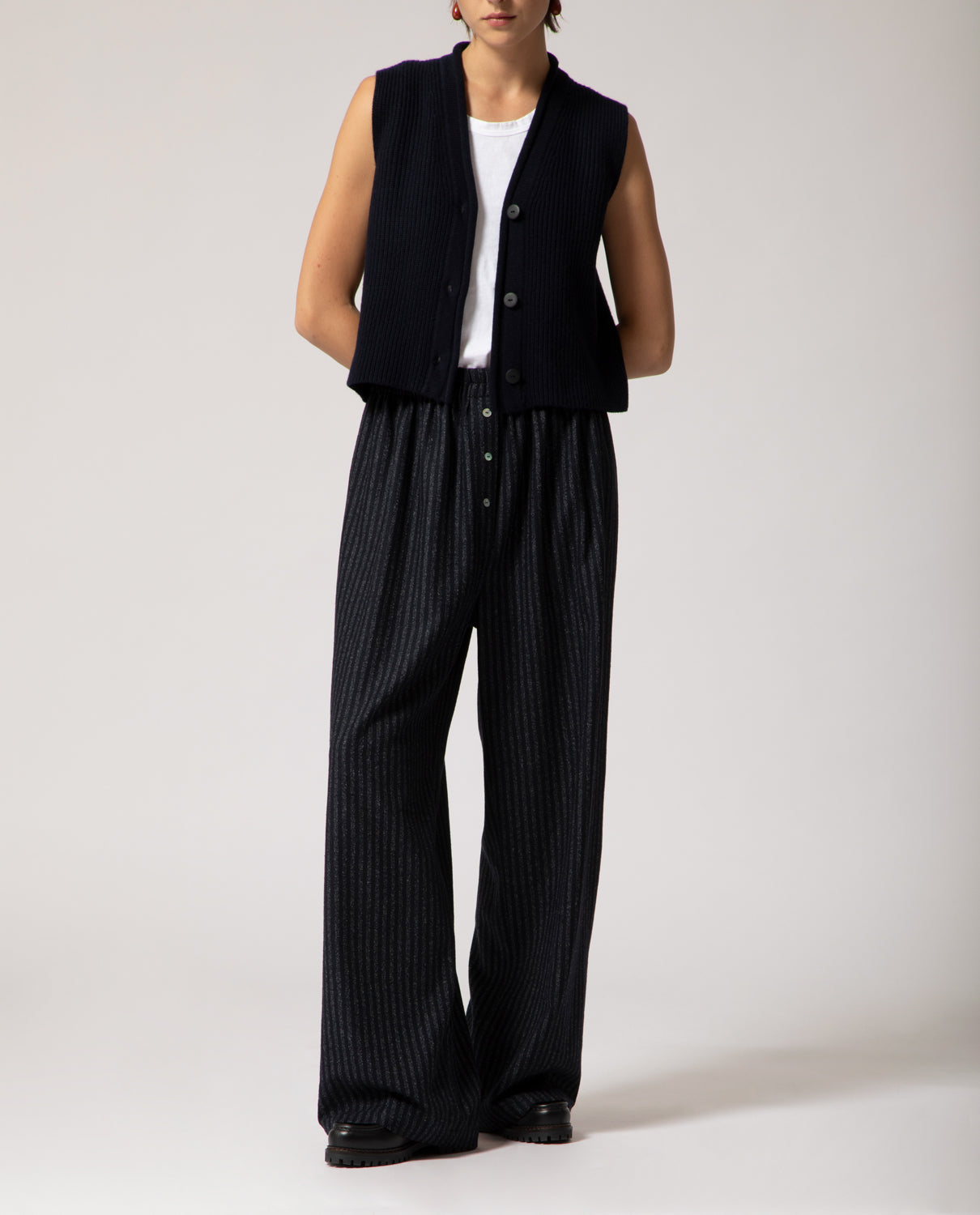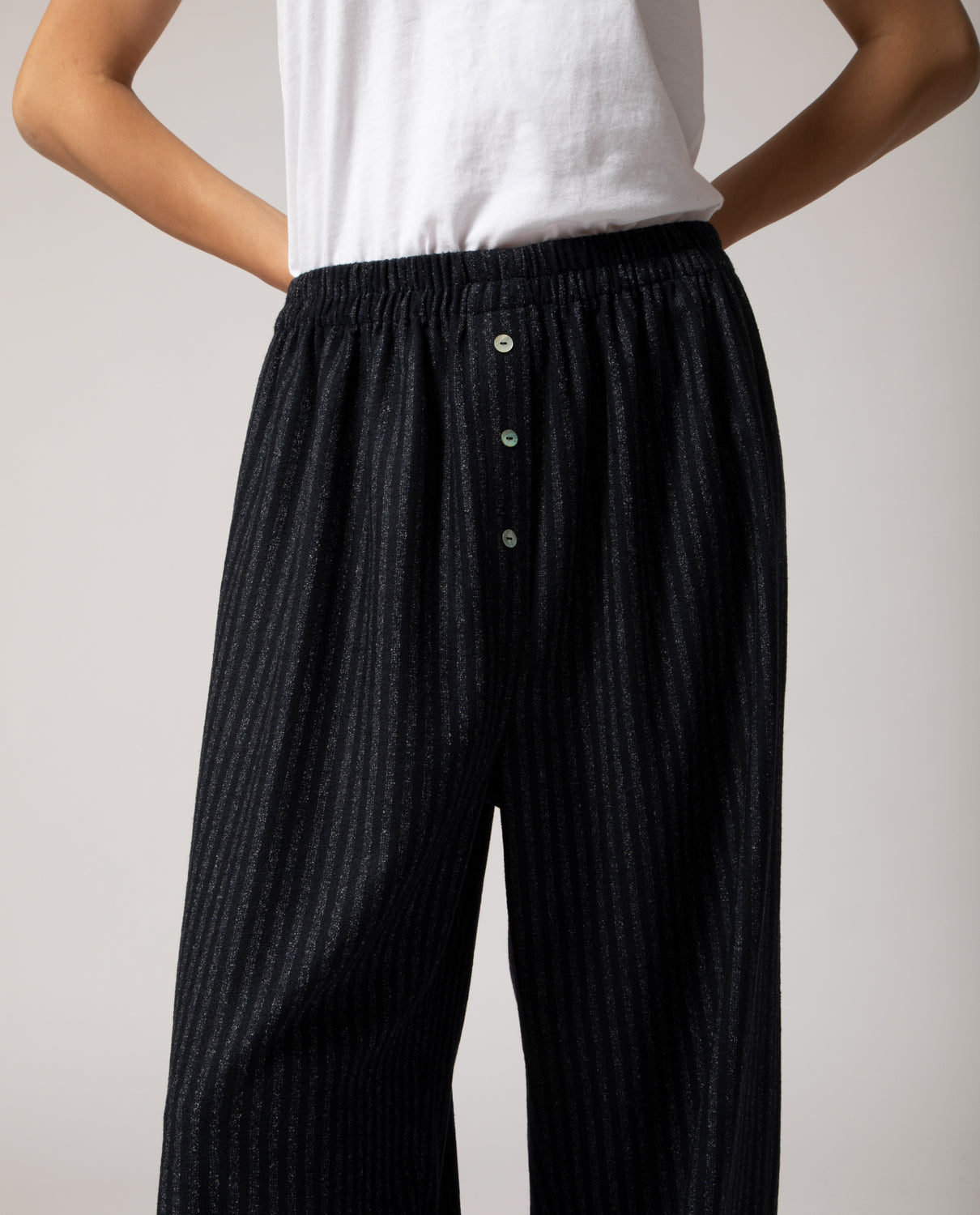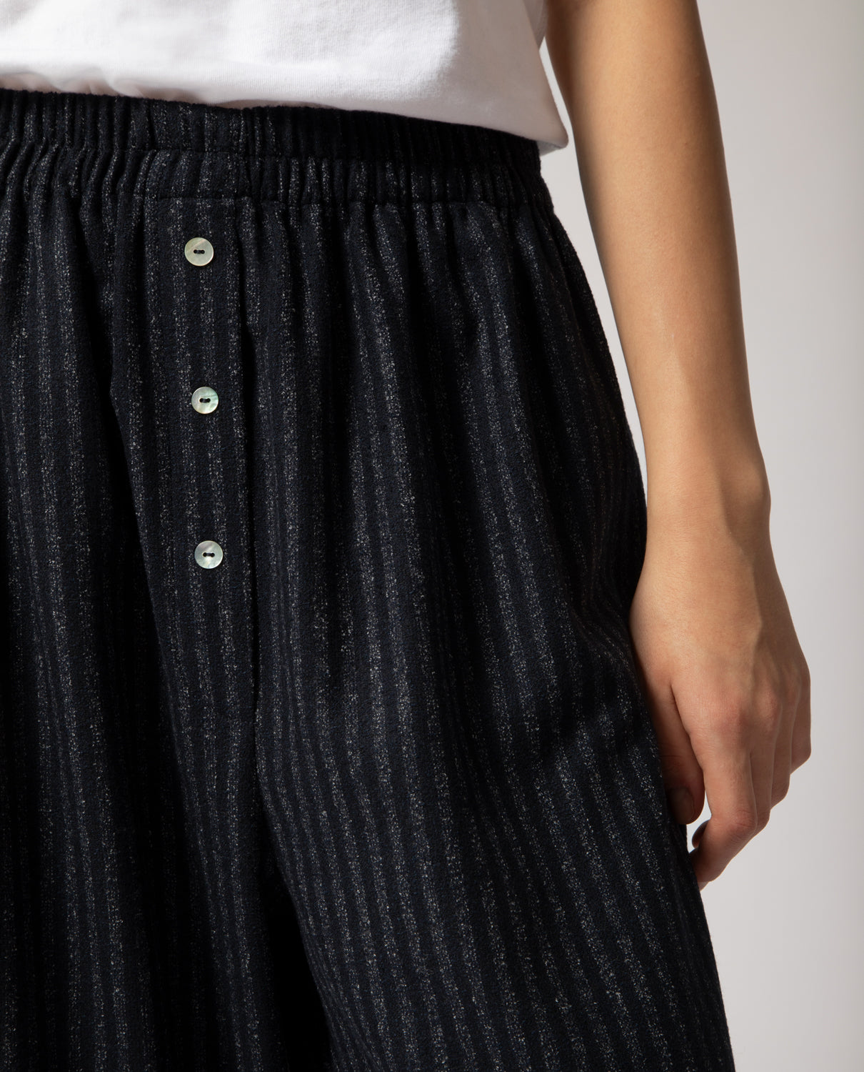 Everyday boxer pants crafted in stripped lightweight wool. These pants feature an elasticated waistband and three mother-of-pearl buttons at the front.