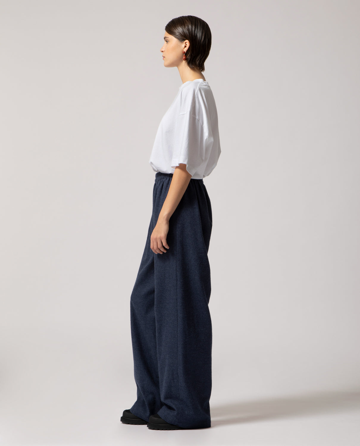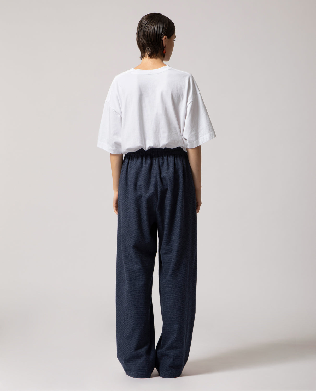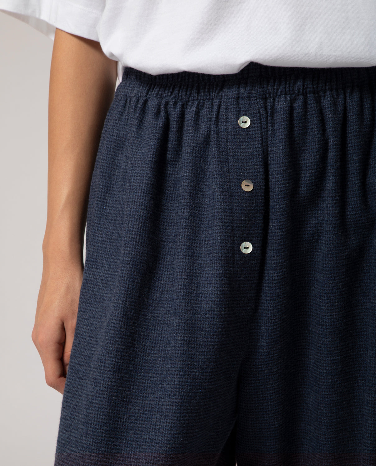 Everyday boxer pants crafted in lightweight wool with a pied-de-poule pattern. These pants feature an elasticated waistband and three mother-of-pearl buttons at the front.