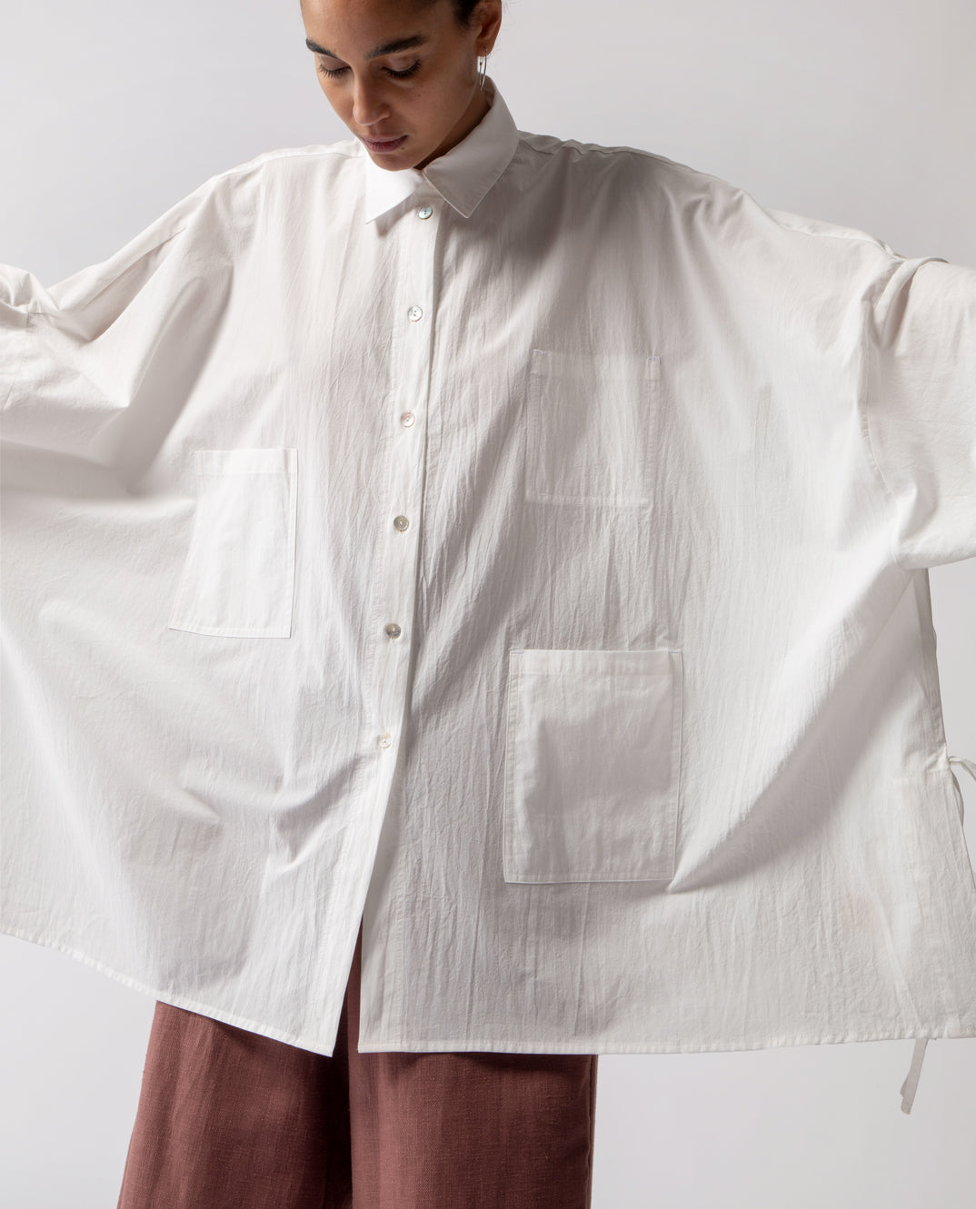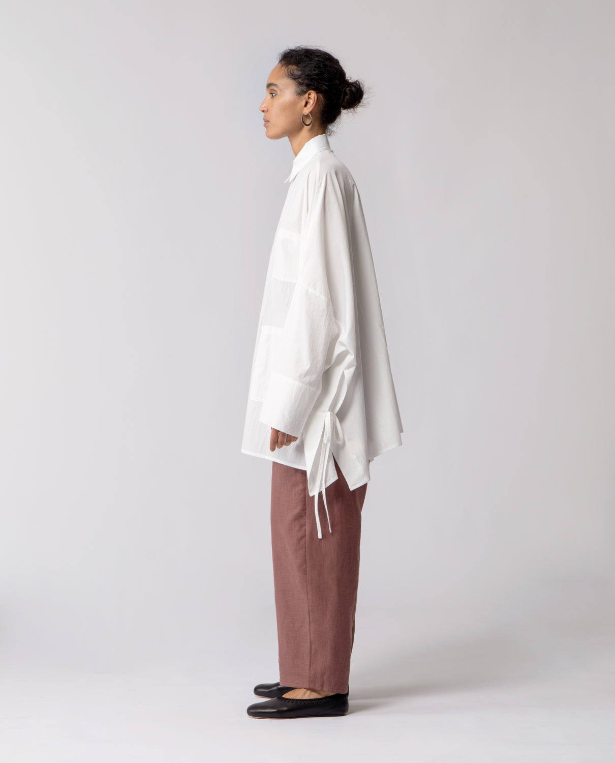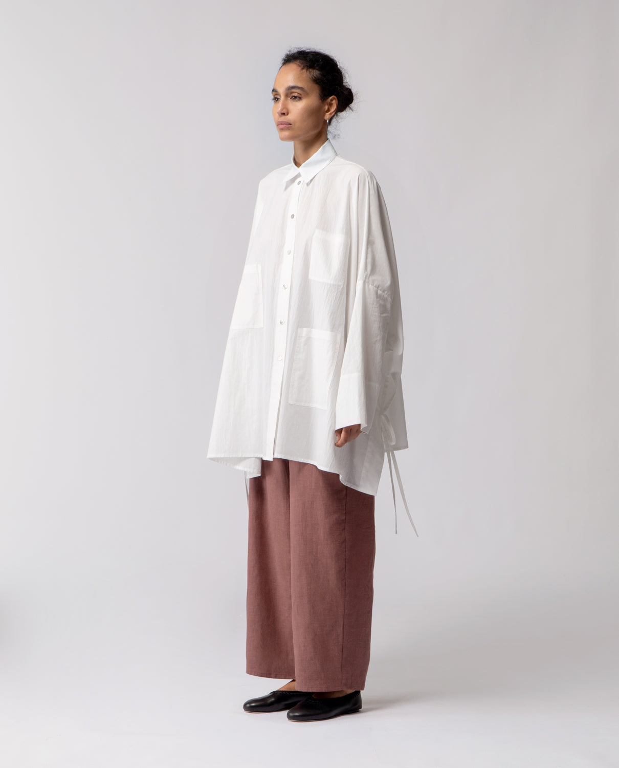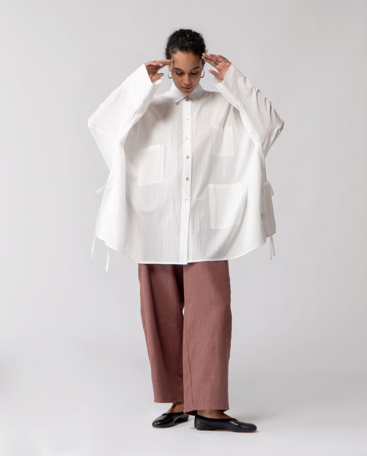 Oversized shirt with side slits accented by decorative ties and three patch pockets, including one internal pocket for added functionality.