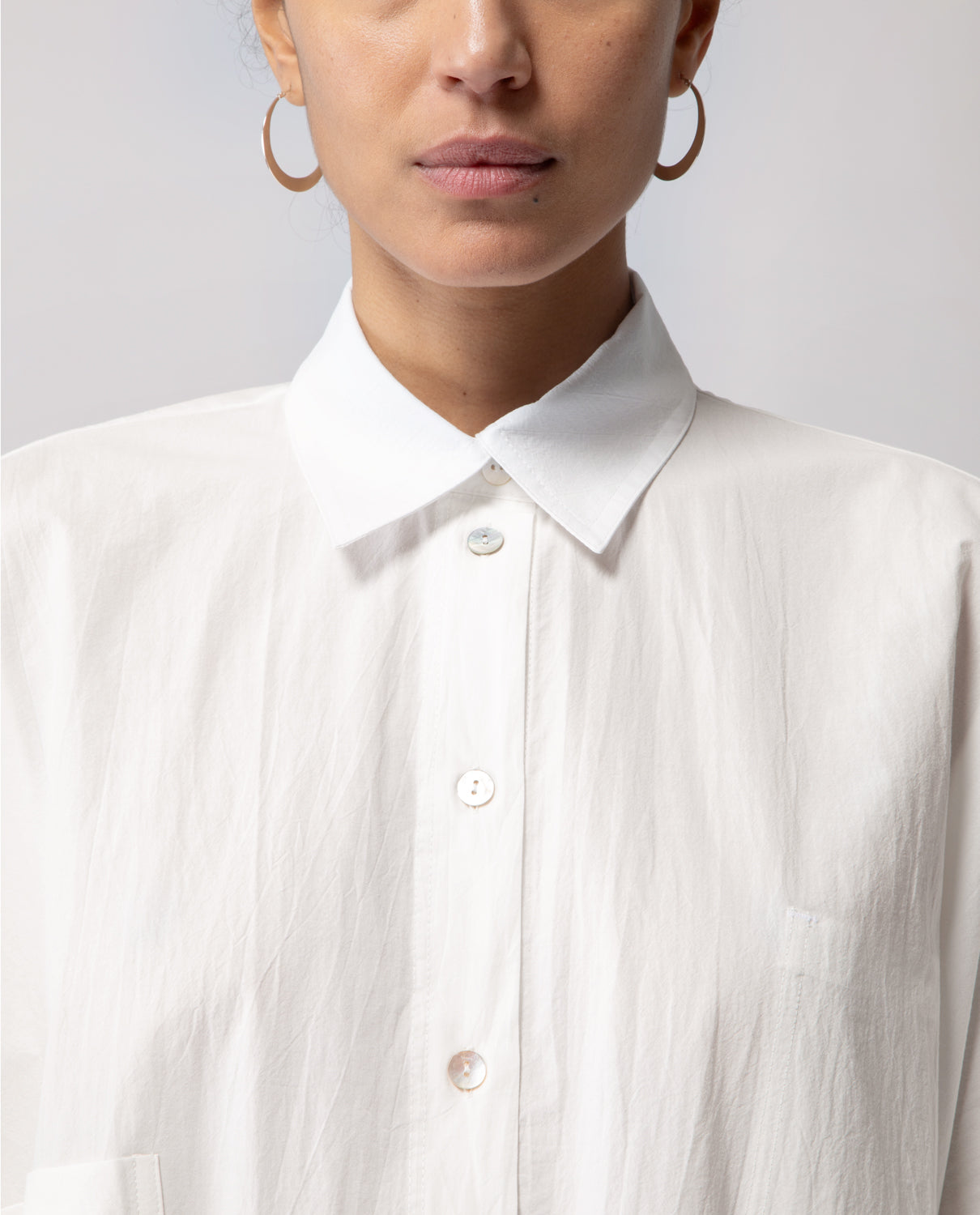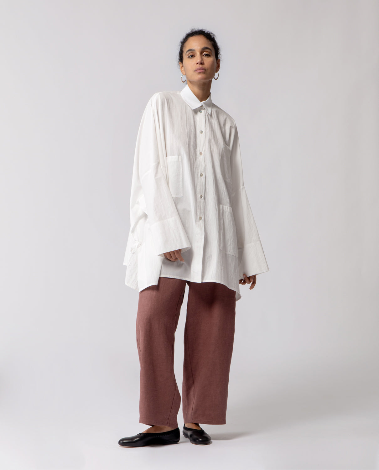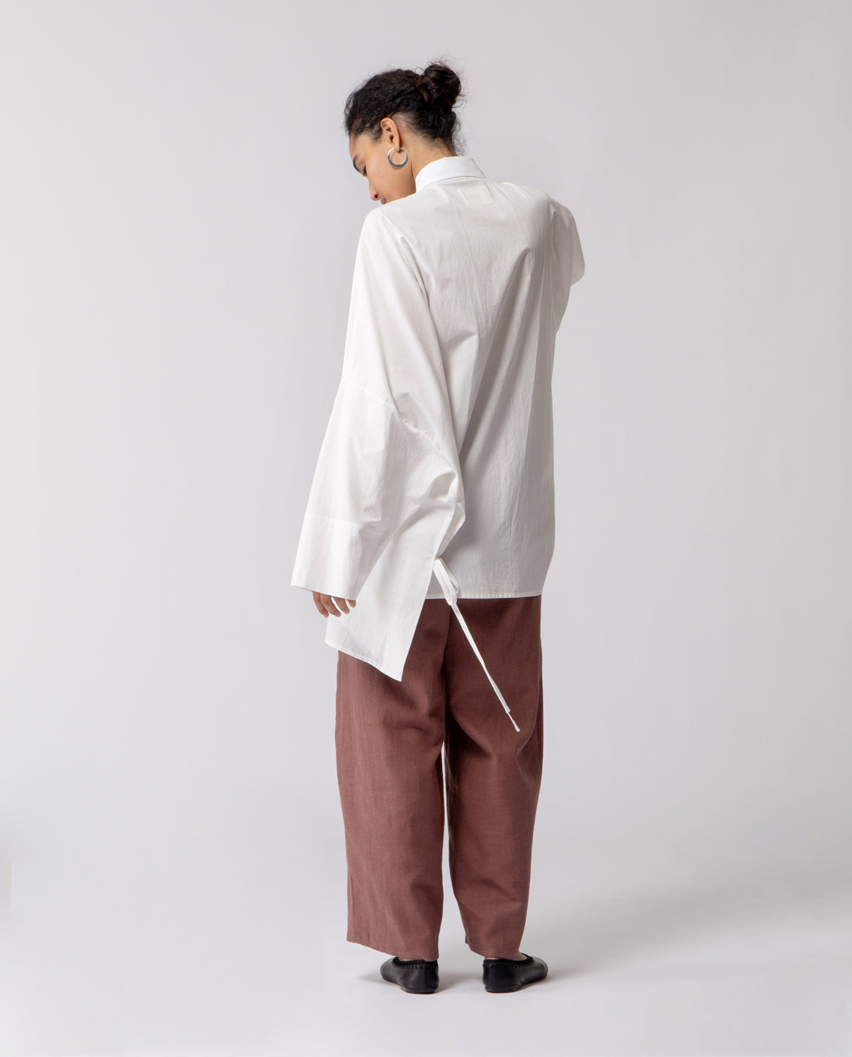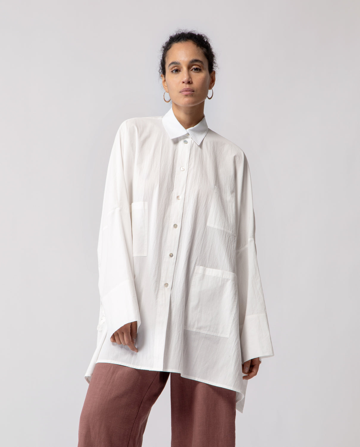 Oversized shirt with side slits accented by decorative ties and three patch pockets, including one internal pocket for added functionality.