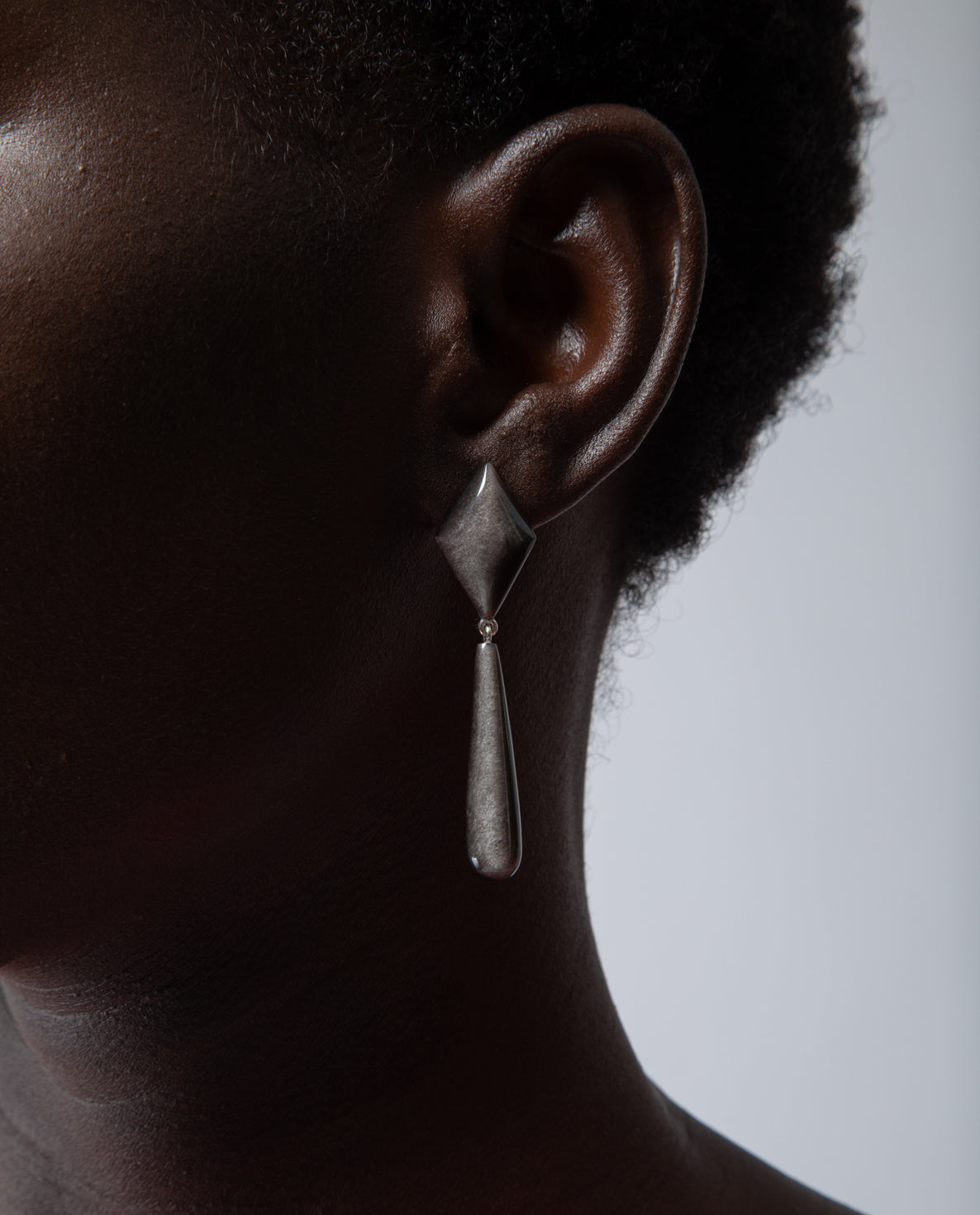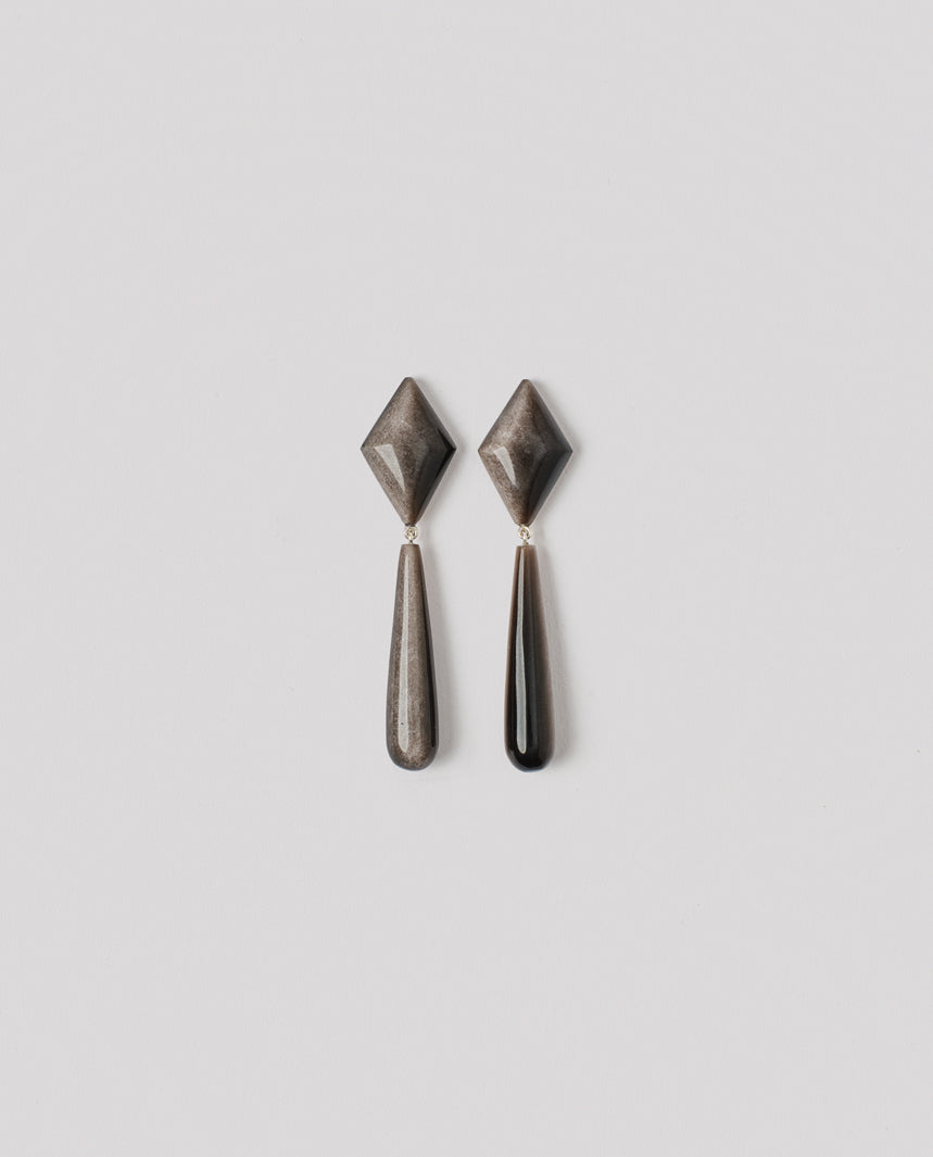 Diamond-shaped earrings with drop pendant, inspired by 1950s jewellery design. Handcarved in natural silver obsidian, each piece reveals subtle variations in tone and shade — a quiet reminder of its unique origin.