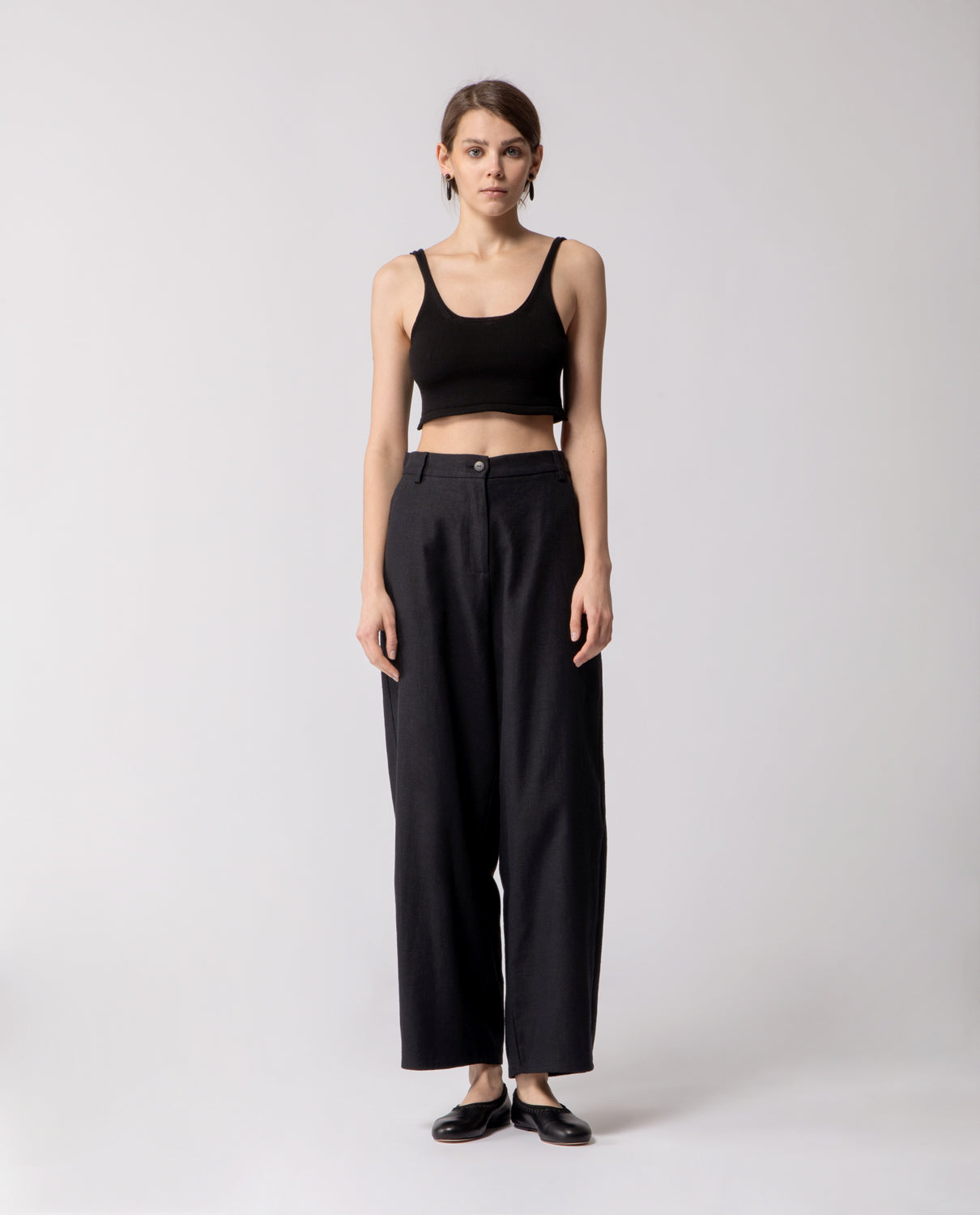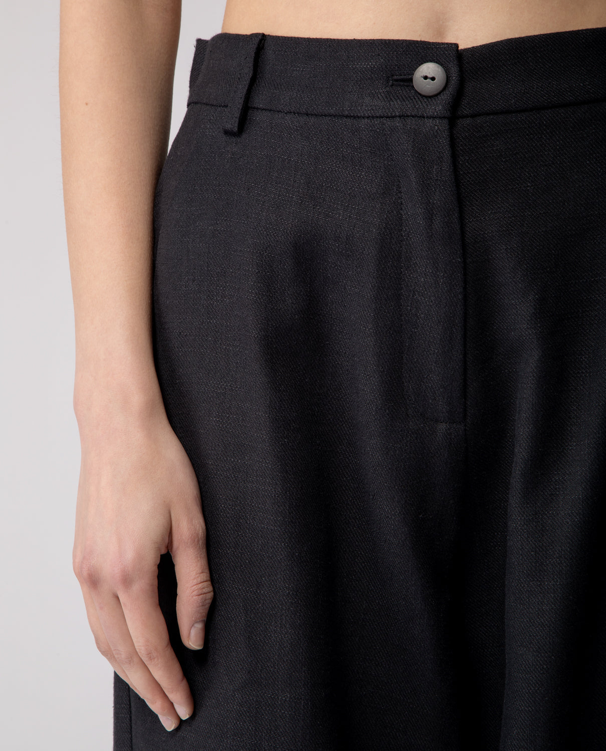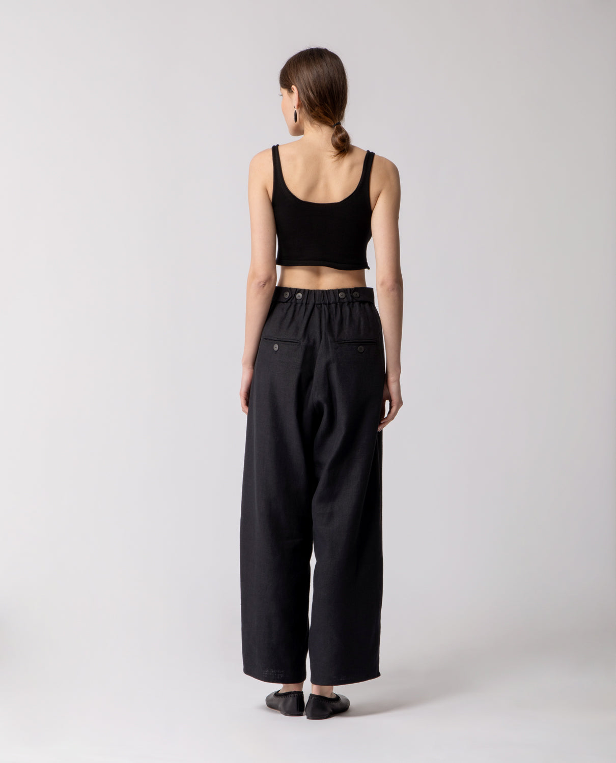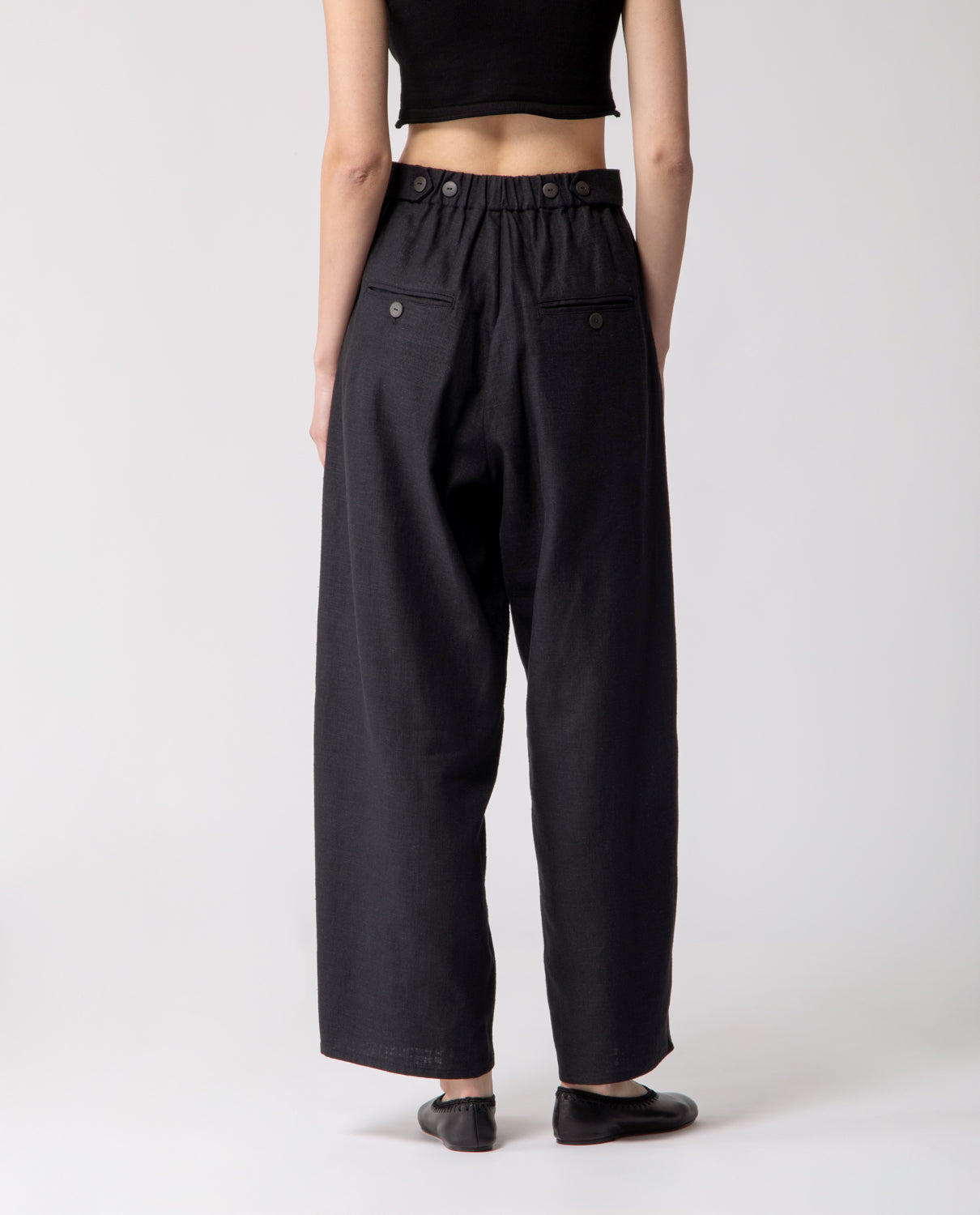 Soft trousers with a relaxed, baggy fit, featuring an elasticated waistband and cuffs with adjustable buttons for a customisable silhouette. Finished with clean welt pockets for a subtle, tailored detail.