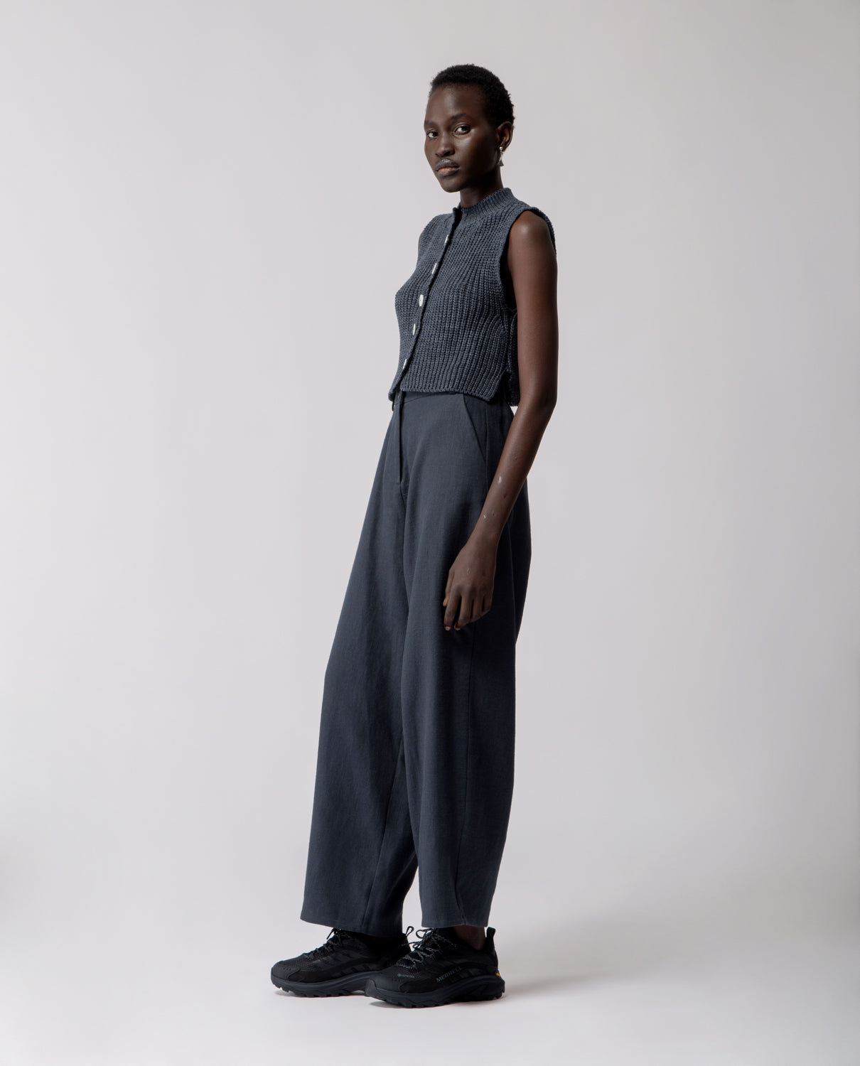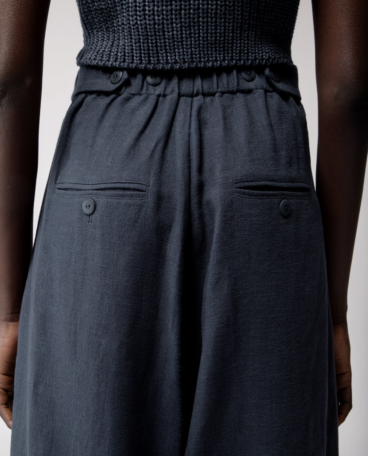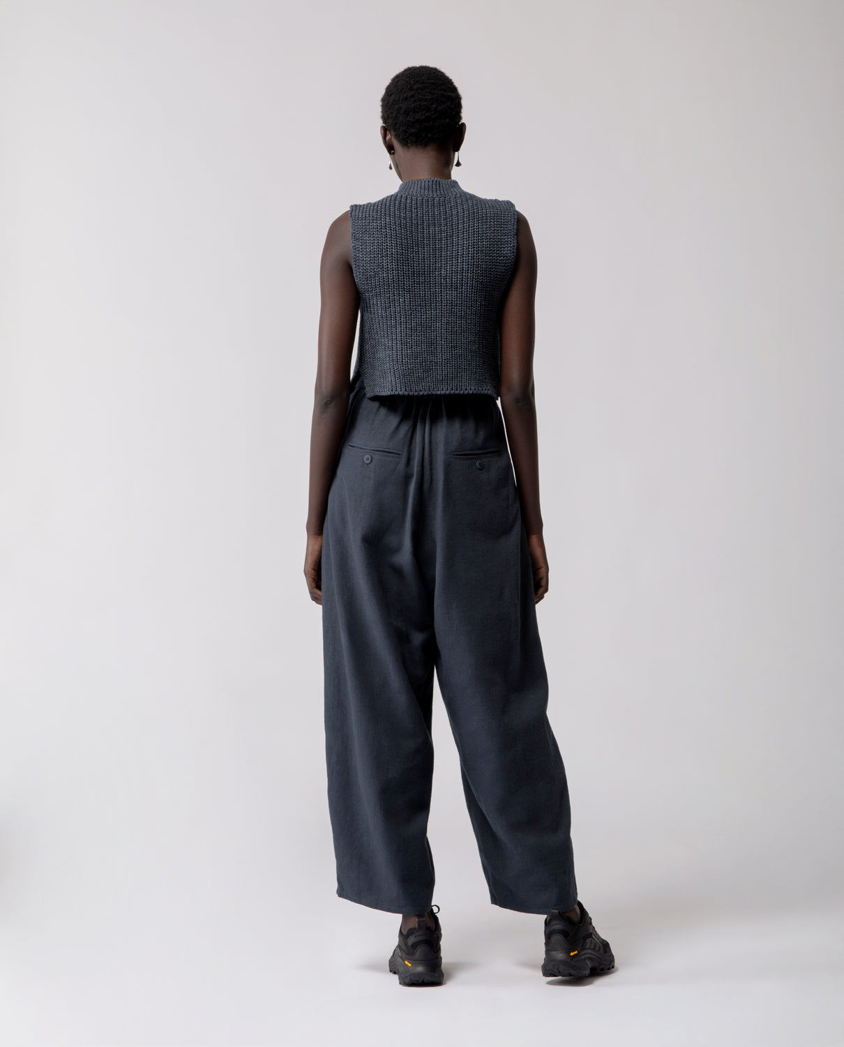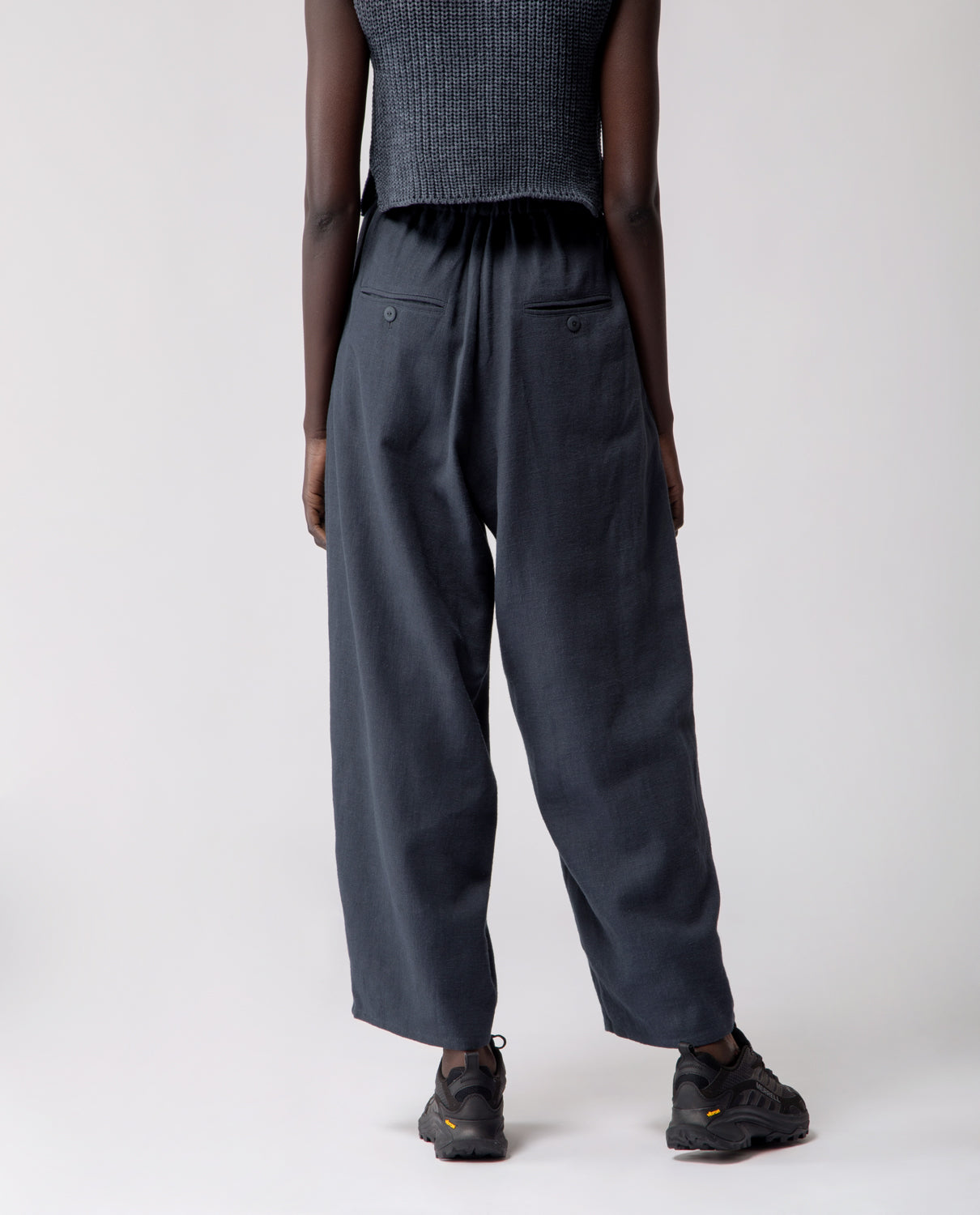 Soft trousers with a relaxed, baggy fit, featuring an elasticated waistband and cuffs with adjustable buttons for a customisable silhouette. Finished with clean welt pockets for a subtle, tailored detail.