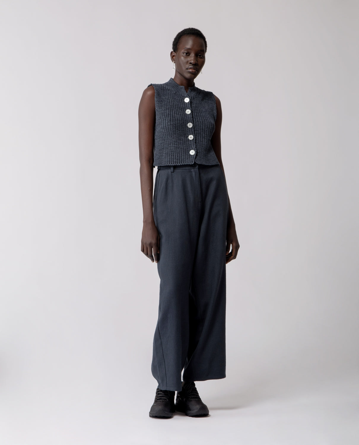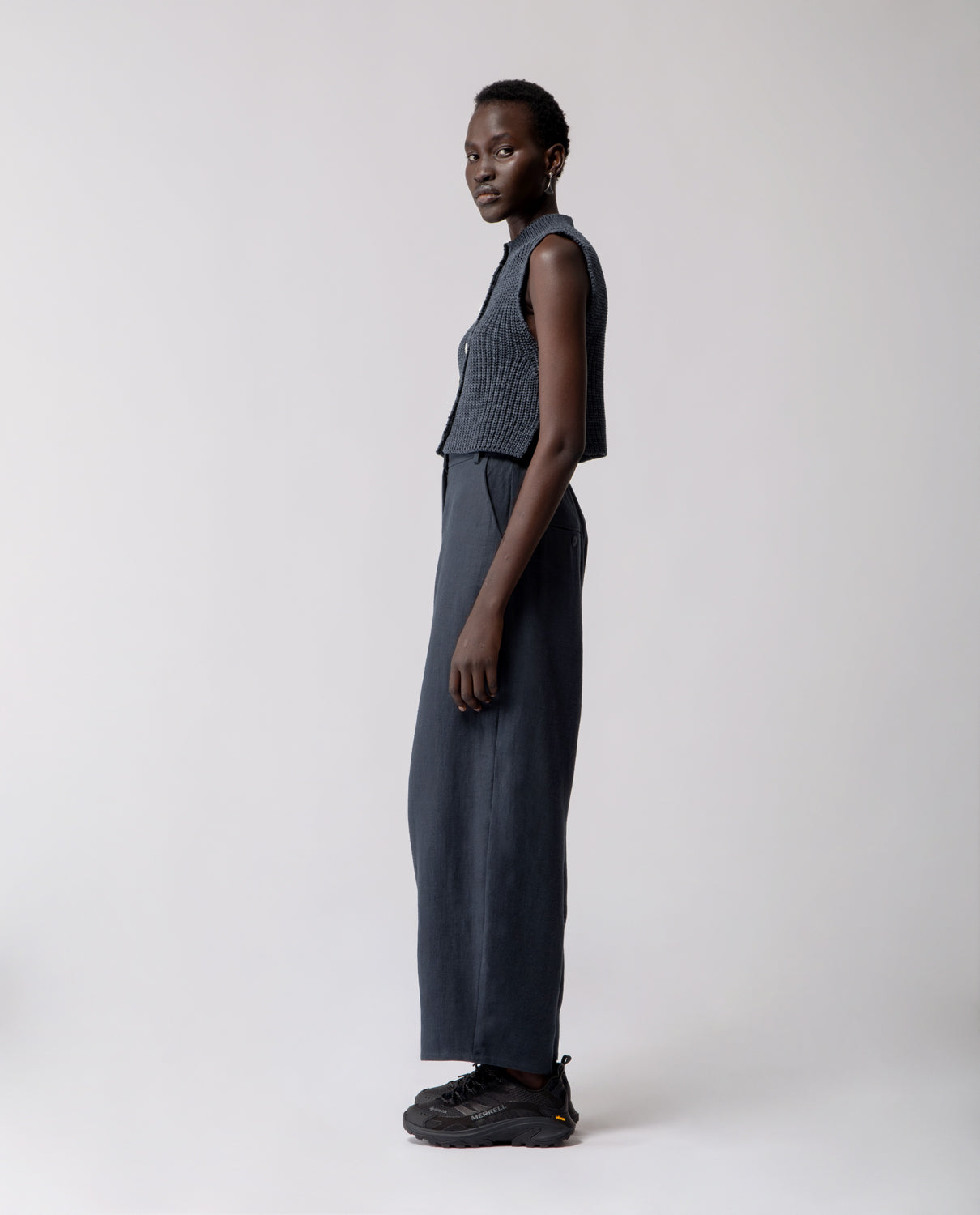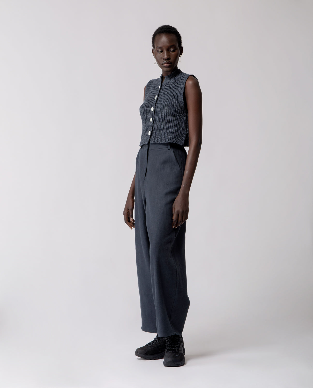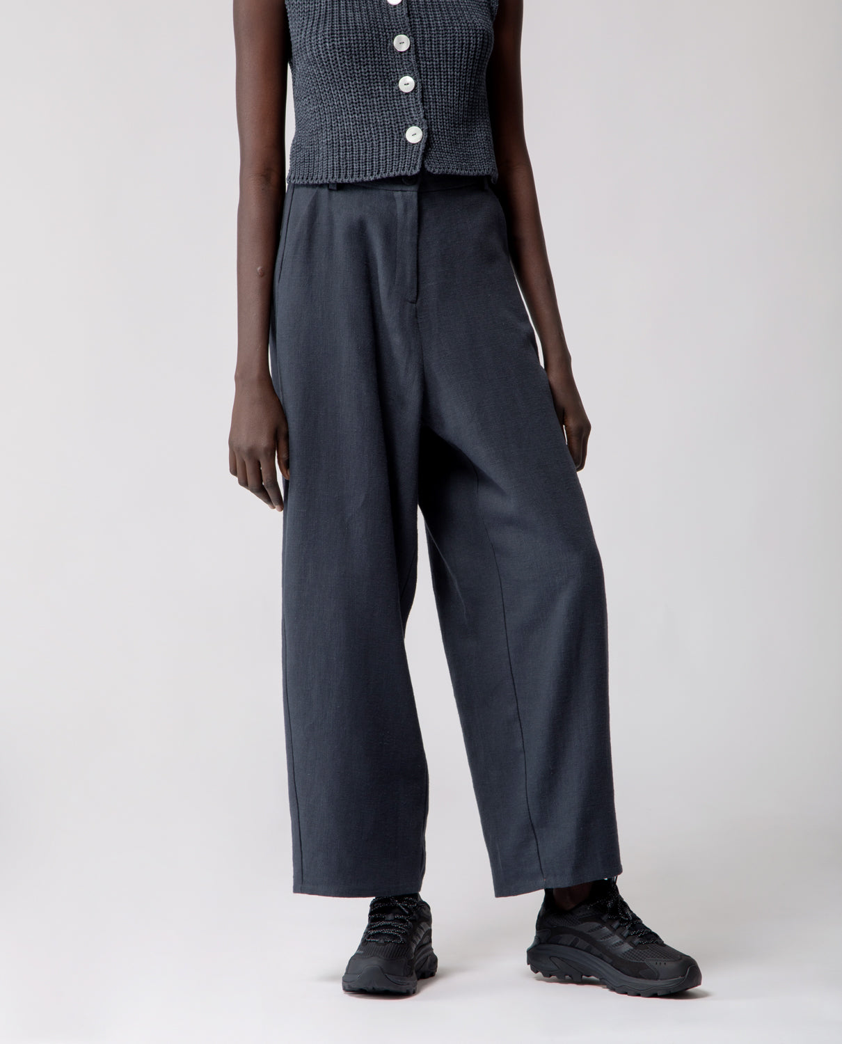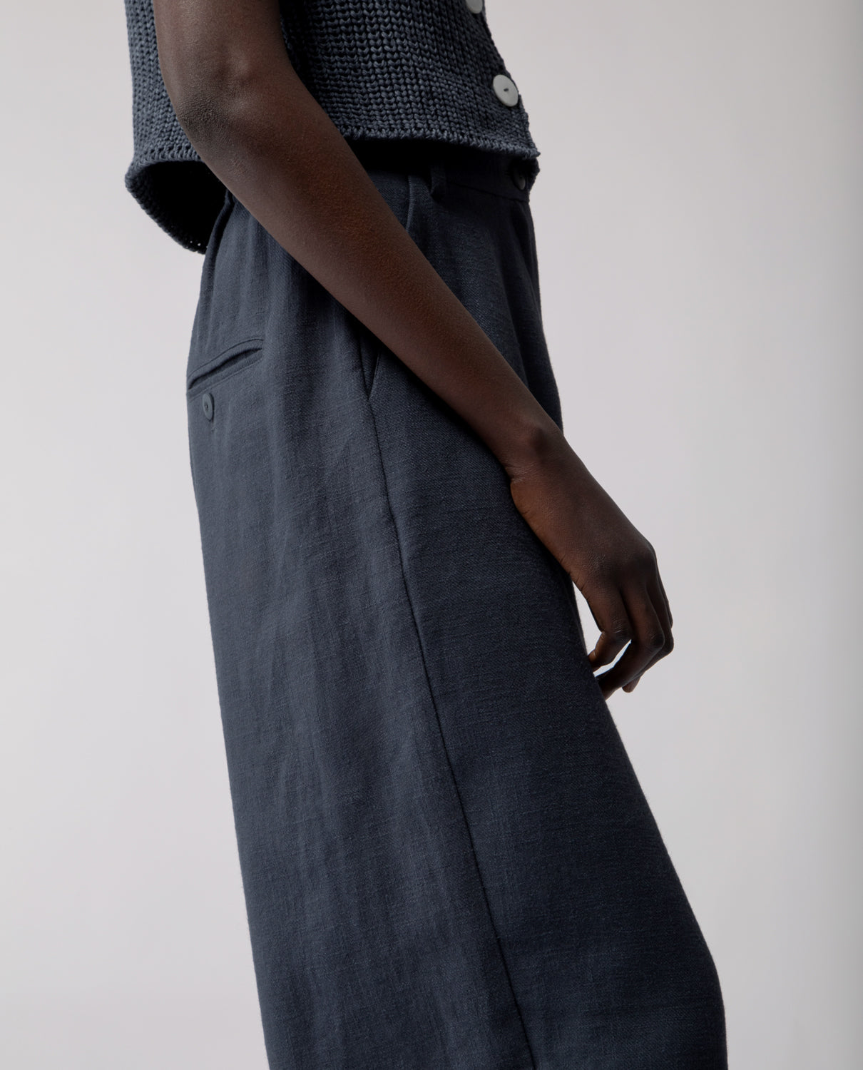 Soft trousers with a relaxed, baggy fit, featuring an elasticated waistband and cuffs with adjustable buttons for a customisable silhouette. Finished with clean welt pockets for a subtle, tailored detail.
