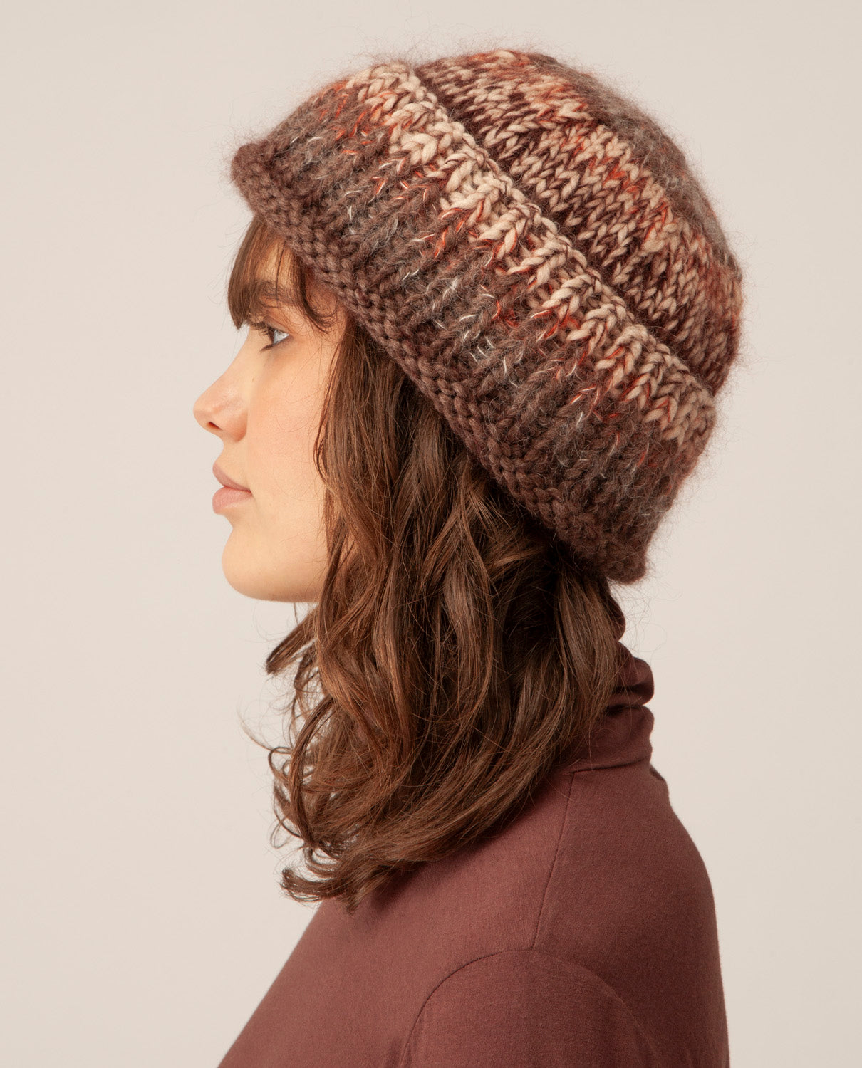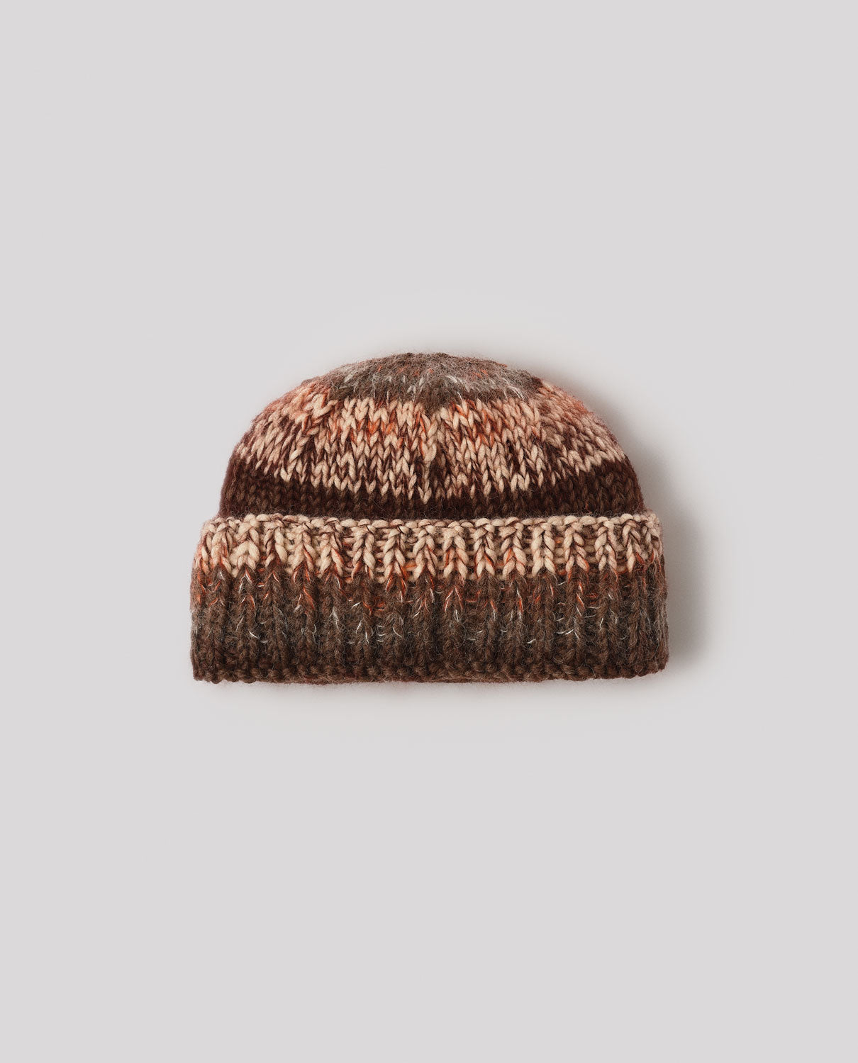 Hand-knitted wool cap showcasing intricate thread embroidery in a palette of warm hues, drawing inspiration from our AW24/25 collection. The meticulous crafting and intertwining of high-quality yarns, combined with the dedication of our beloved knitters, result in a distinctive piece that offers warmth and comfort, perfectly complementing the winter palette.
