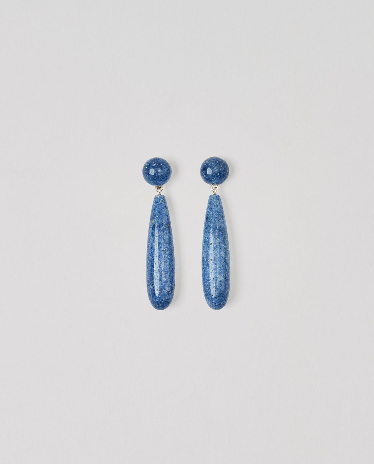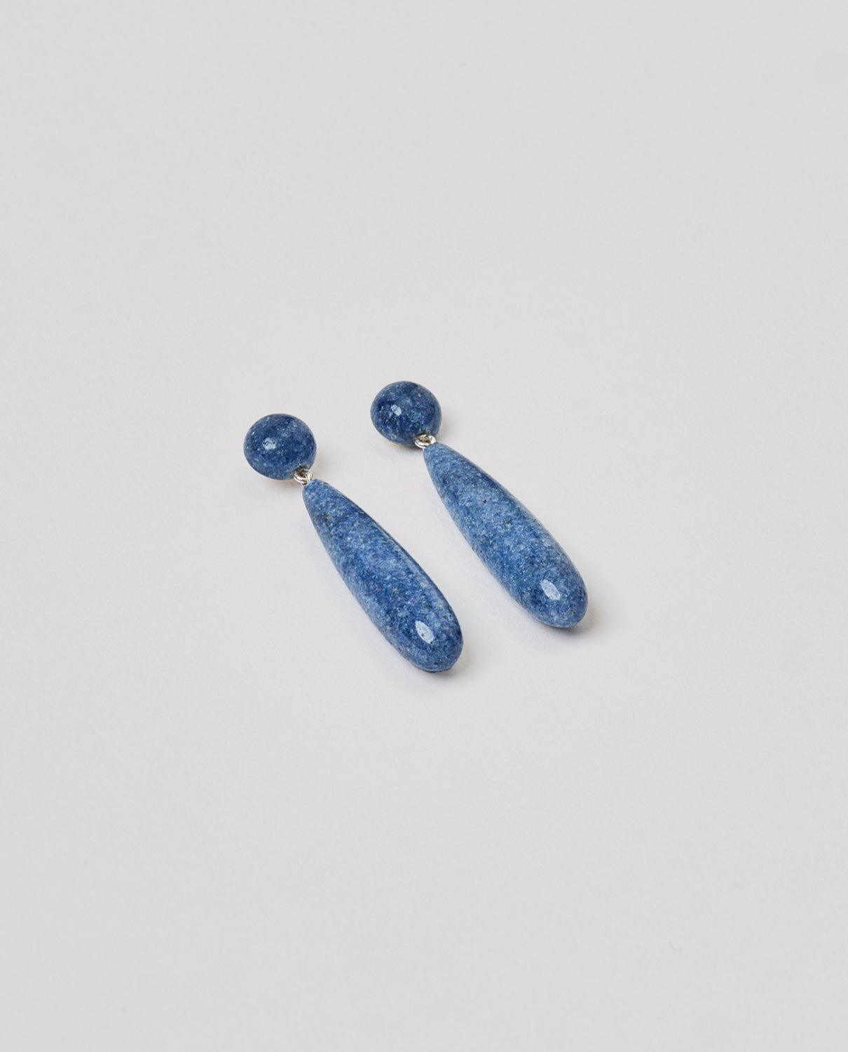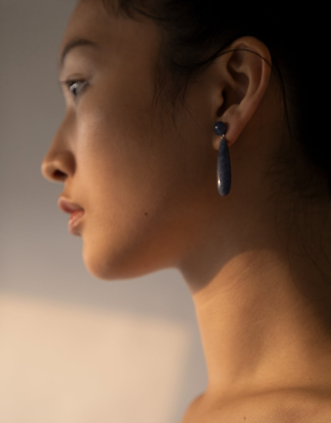 Little, precious sculptures worn on the skin, these earrings are hand-carved in blue aventurine, a stone prized for its depth of color and shimmering inclusions.