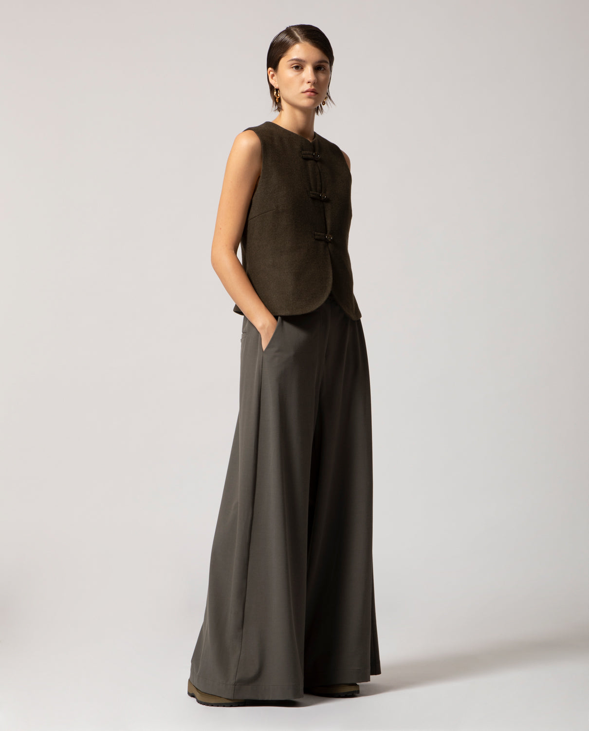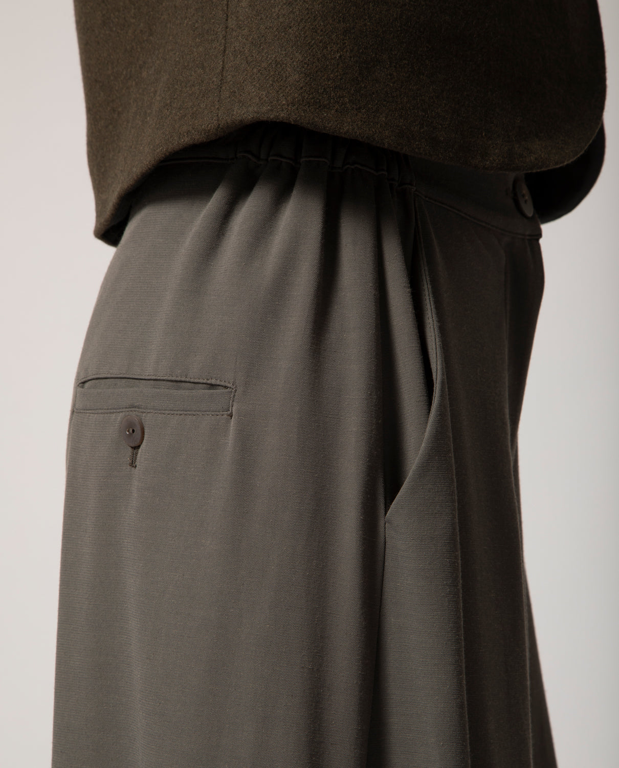 Wool trousers featuring a wide-leg palazzo silhouette with elasticated side panels for ease and comfort. A single welt pocket at the back completes the design.