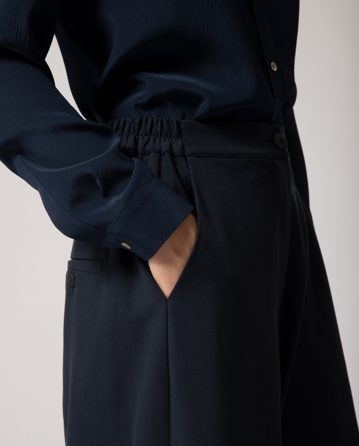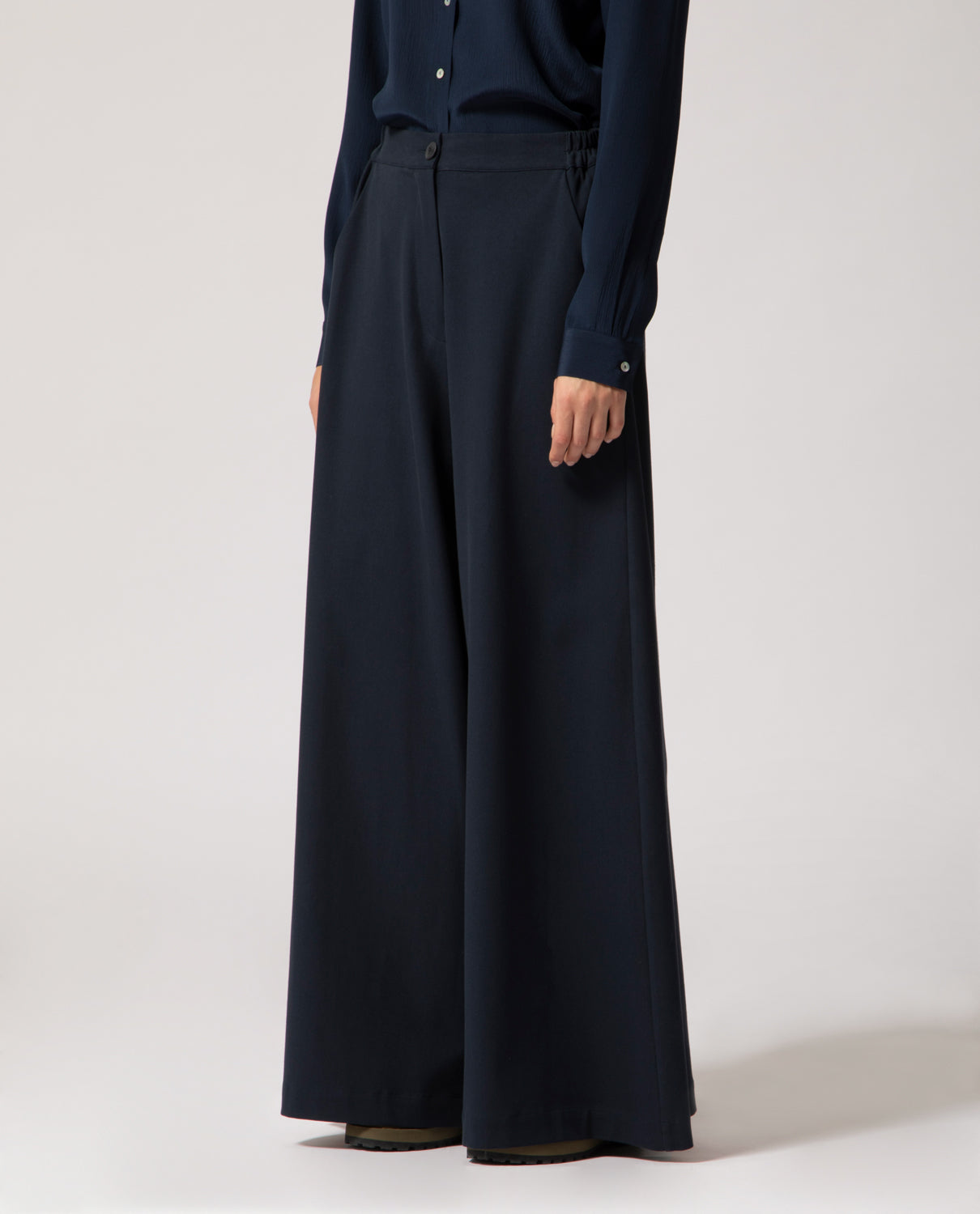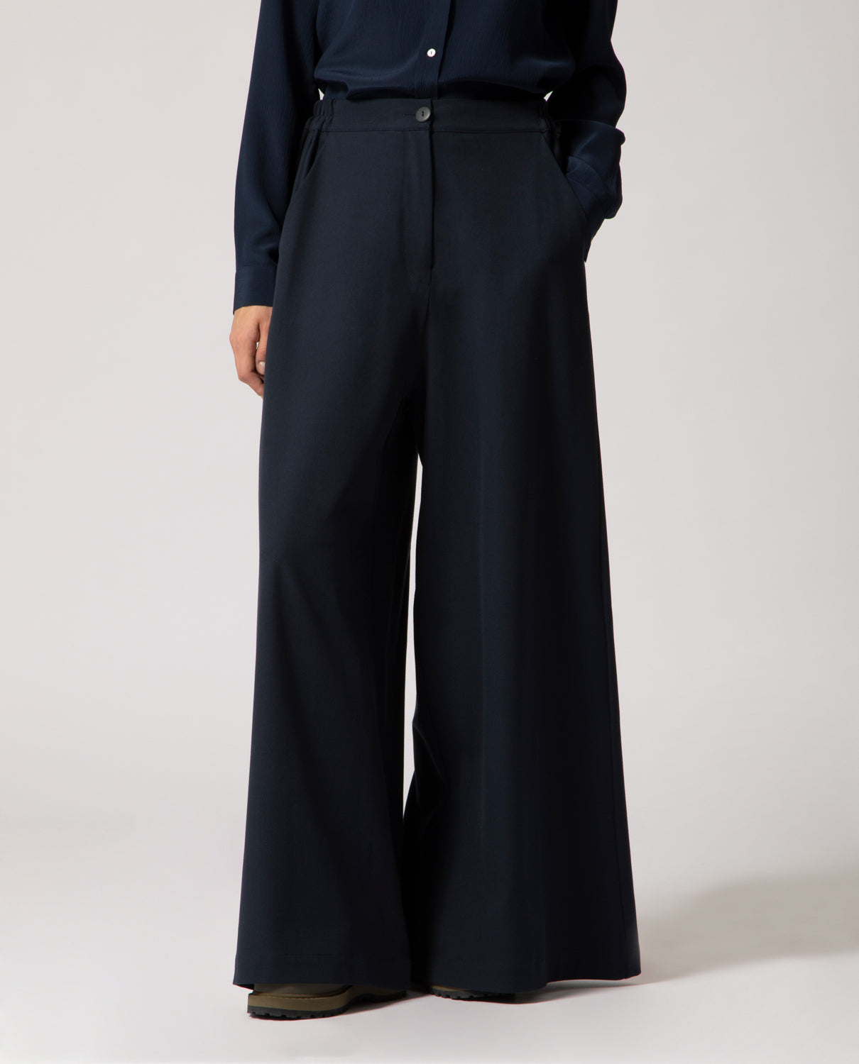 Wool trousers featuring a wide-leg palazzo silhouette with elasticated side panels for ease and comfort. A single welt pocket at the back completes the design.