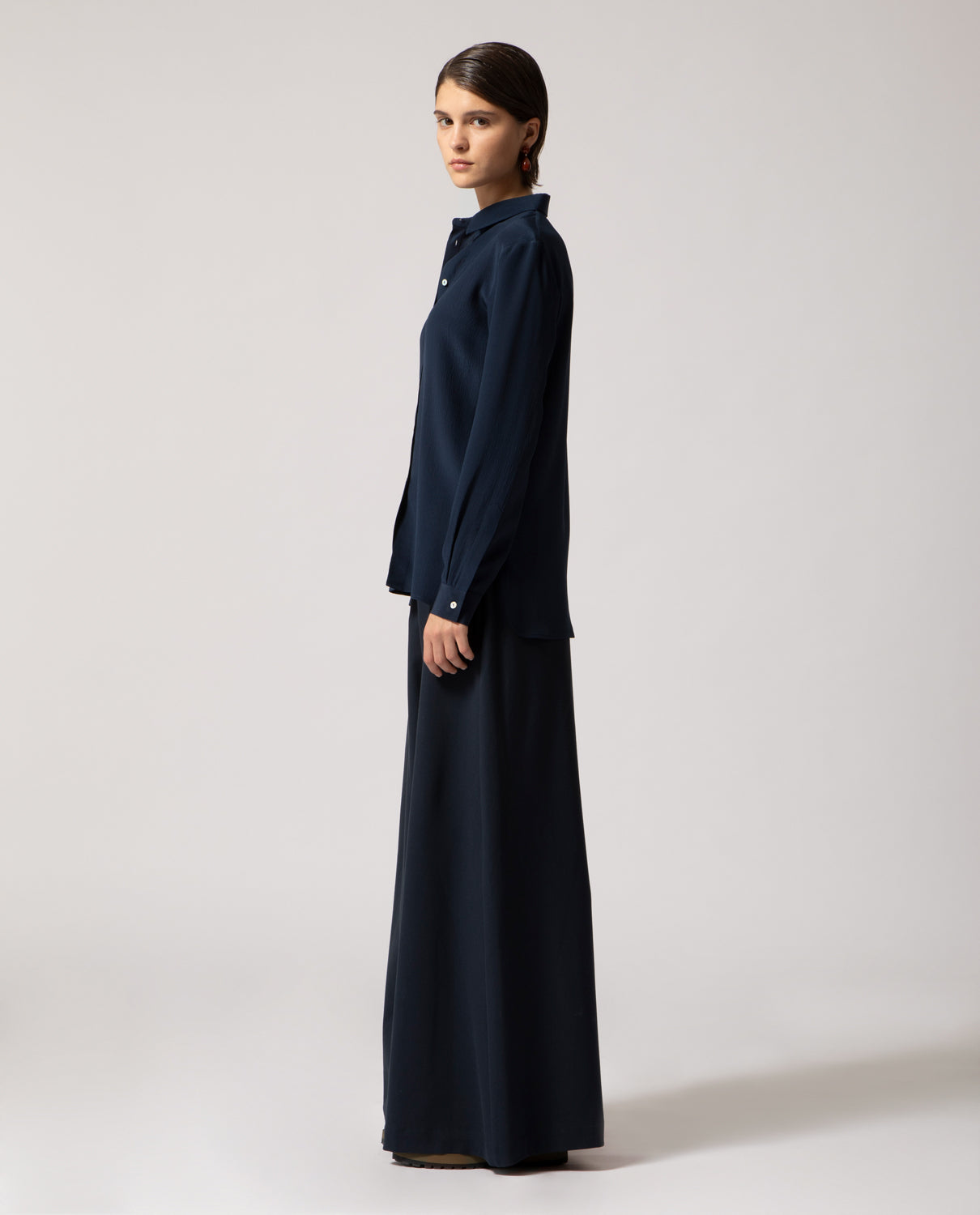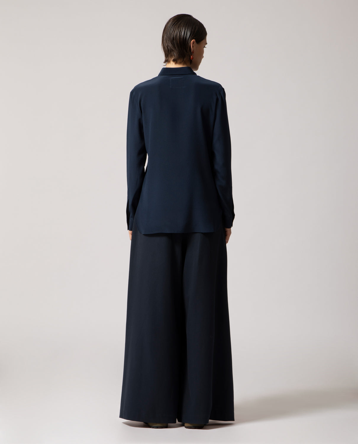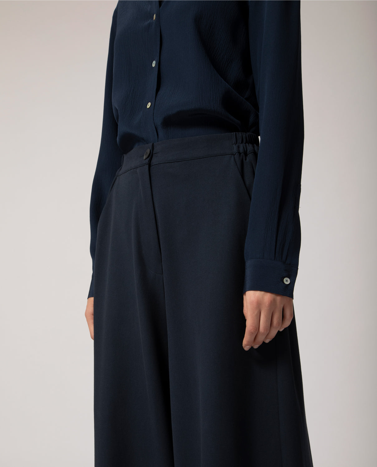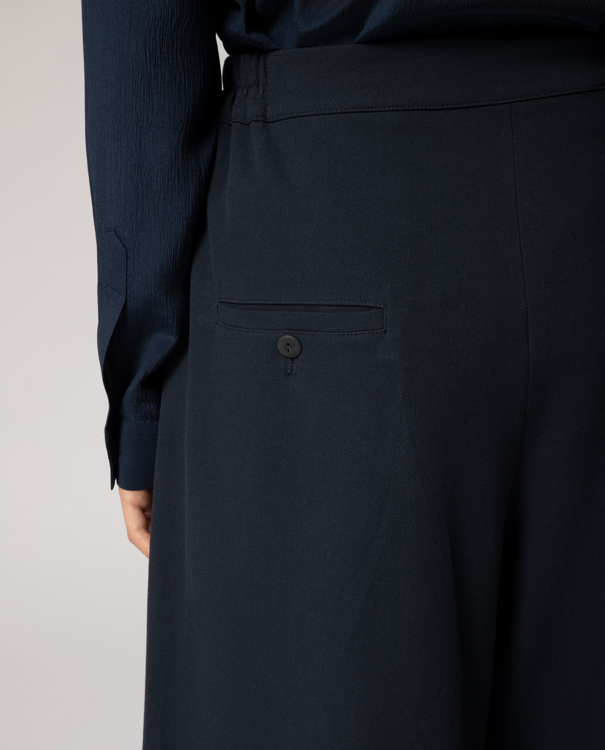 Wool trousers featuring a wide-leg palazzo silhouette with elasticated side panels for ease and comfort. A single welt pocket at the back completes the design.
