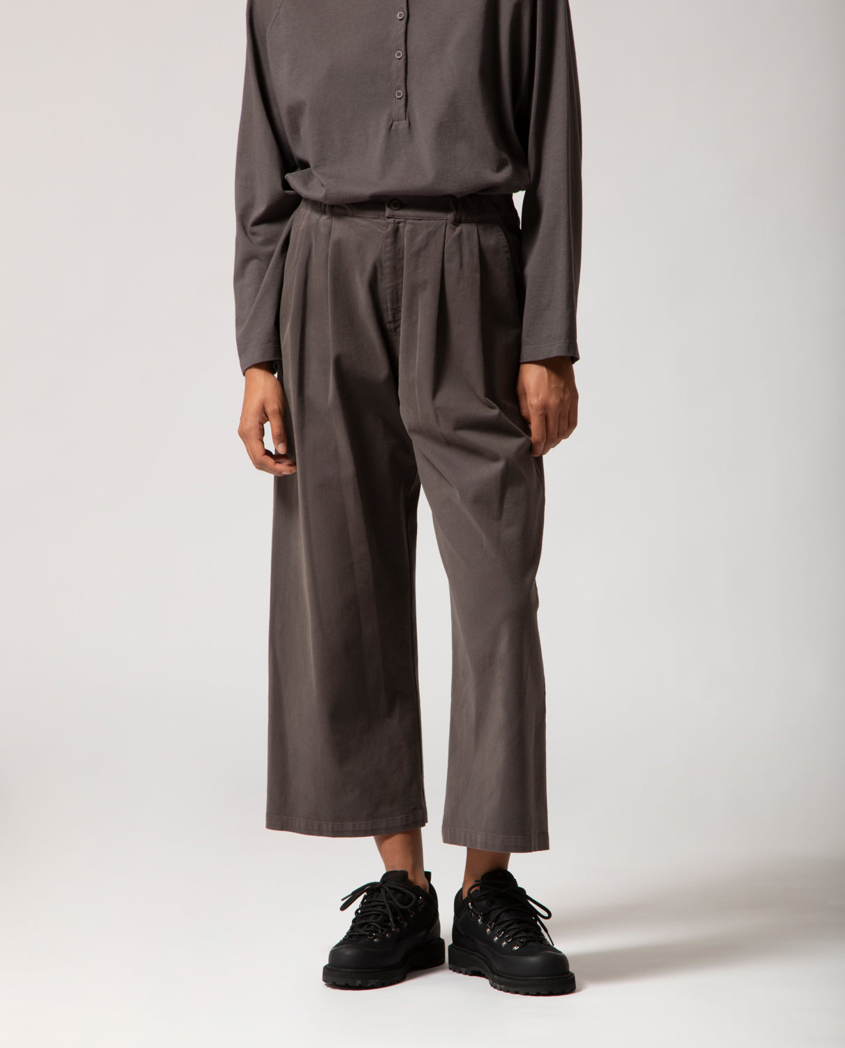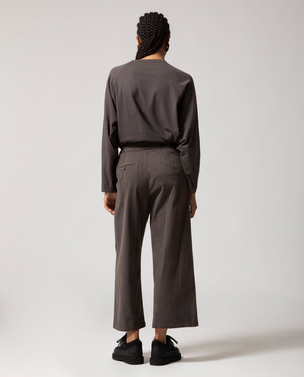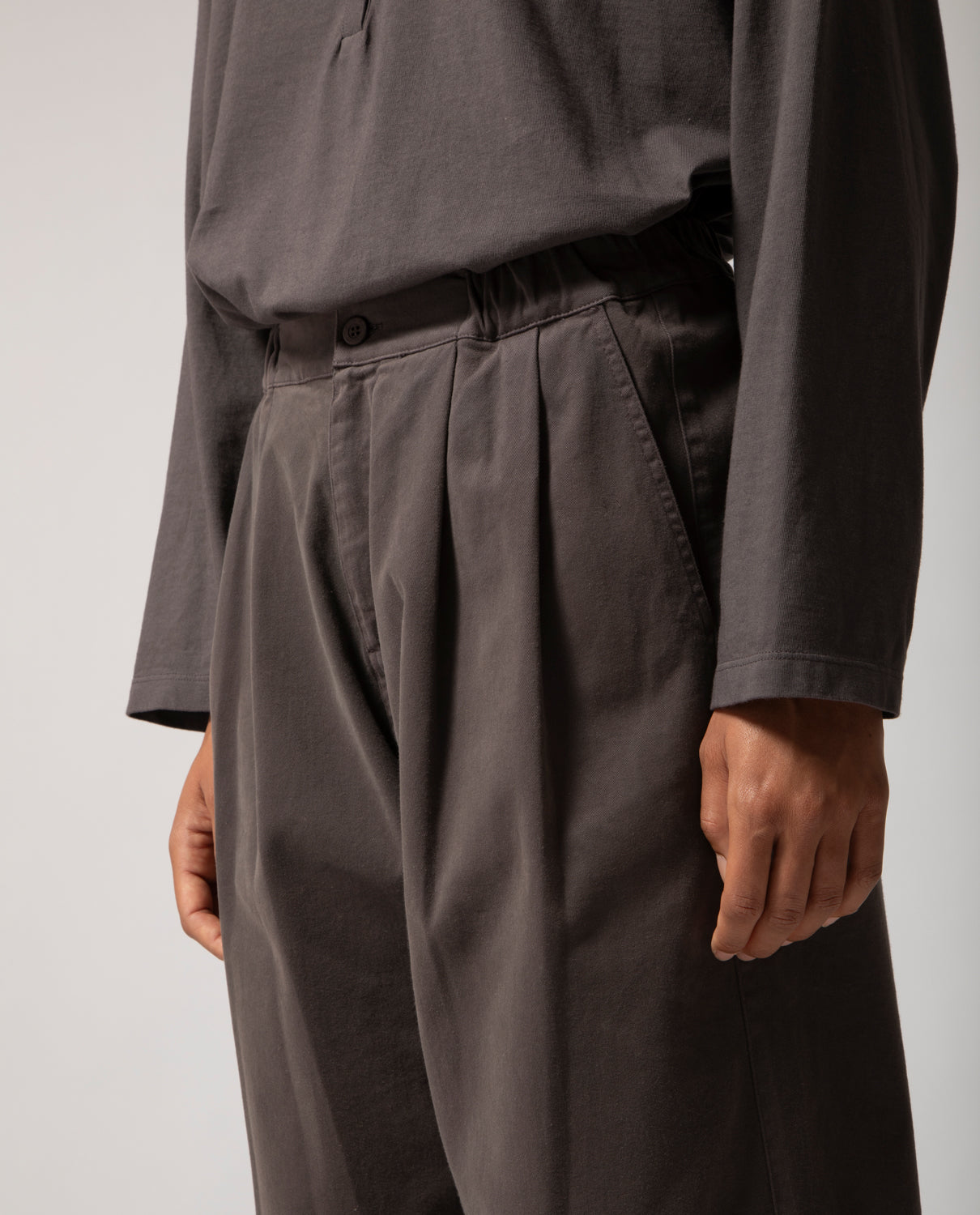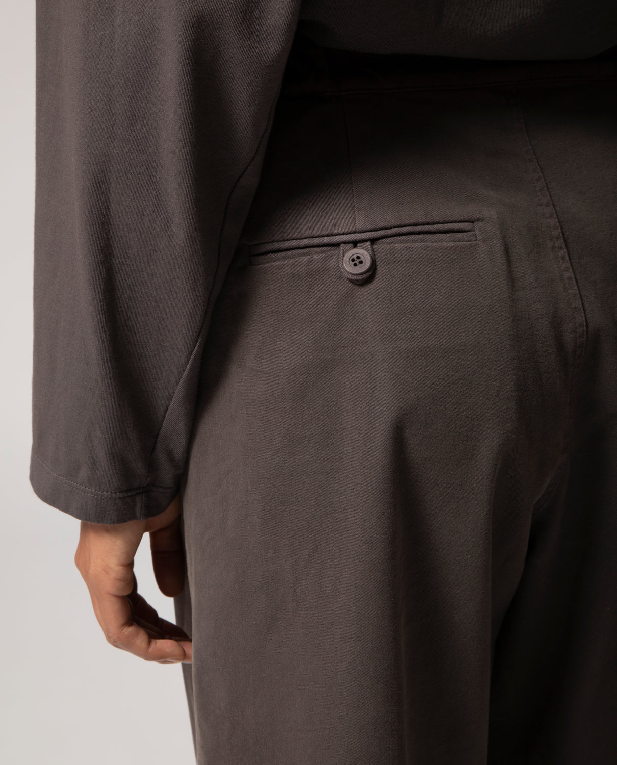 Pleated trousers featuring front pleats and elasticated side panels for ease and comfort. At the back, a single welt pocket is detailed with a looped self-fabric buttonhole and a dyed cotton button, echoing the piece’s artisanal finish.