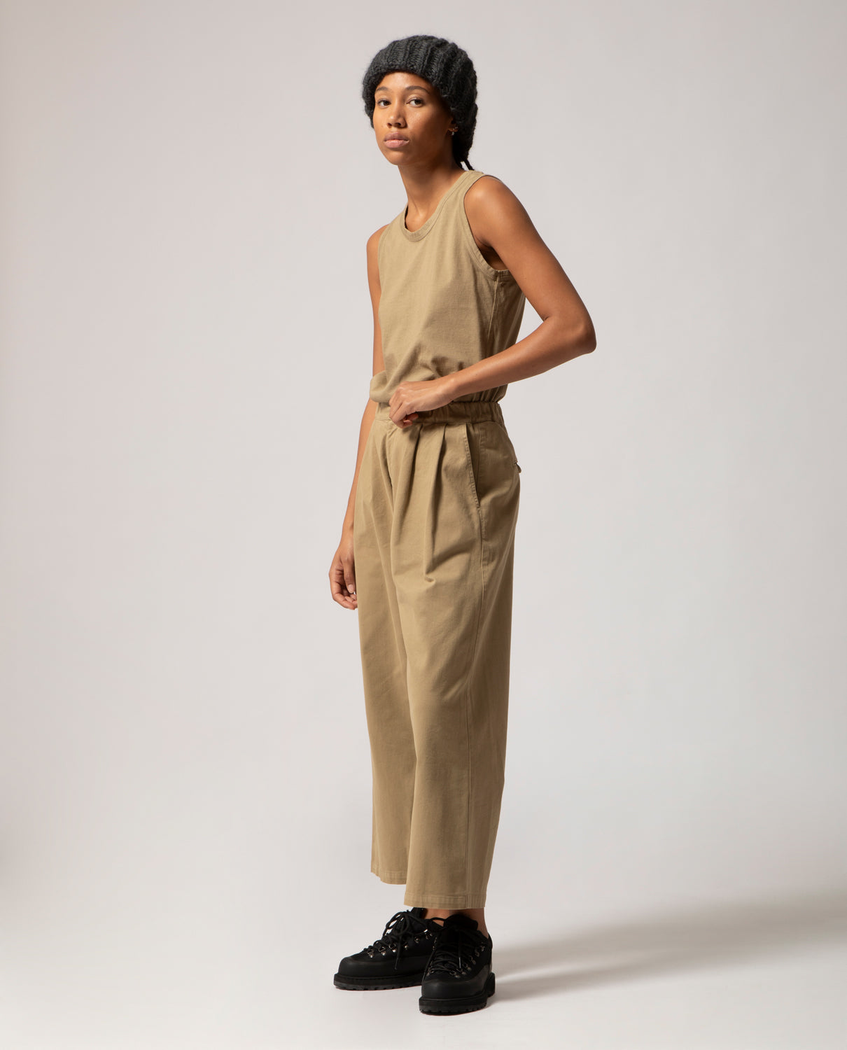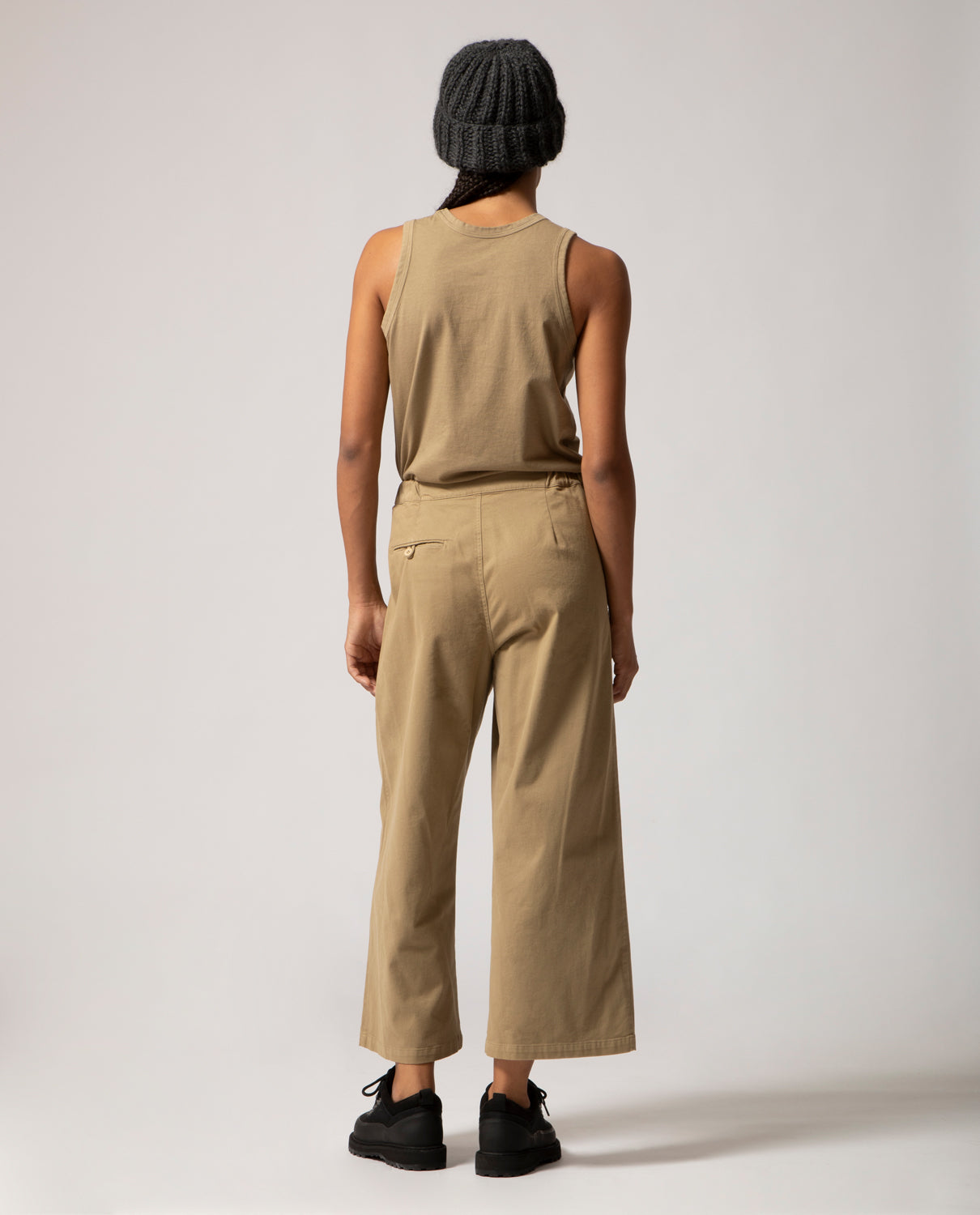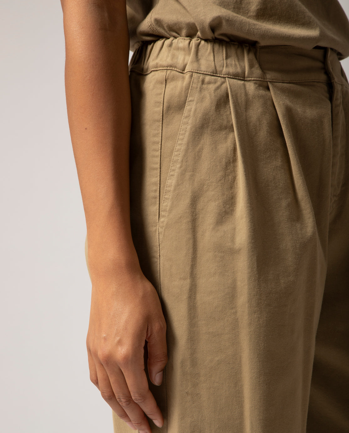 Pleated trousers featuring front pleats and elasticated side panels for ease and comfort. At the back, a single welt pocket is detailed with a looped self-fabric buttonhole and a dyed cotton button, echoing the piece’s artisanal finish.
