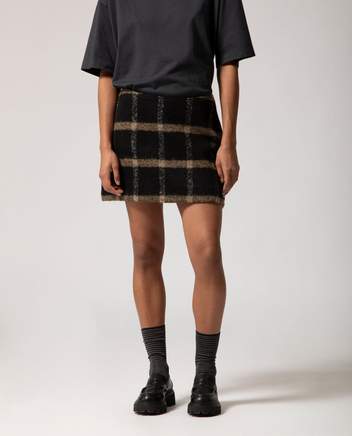 Plaid skirt with a short A-line cut in checked wool fabric, detailed with a concealed zip closure. The piece is fully lined in cotton for comfort and structure.