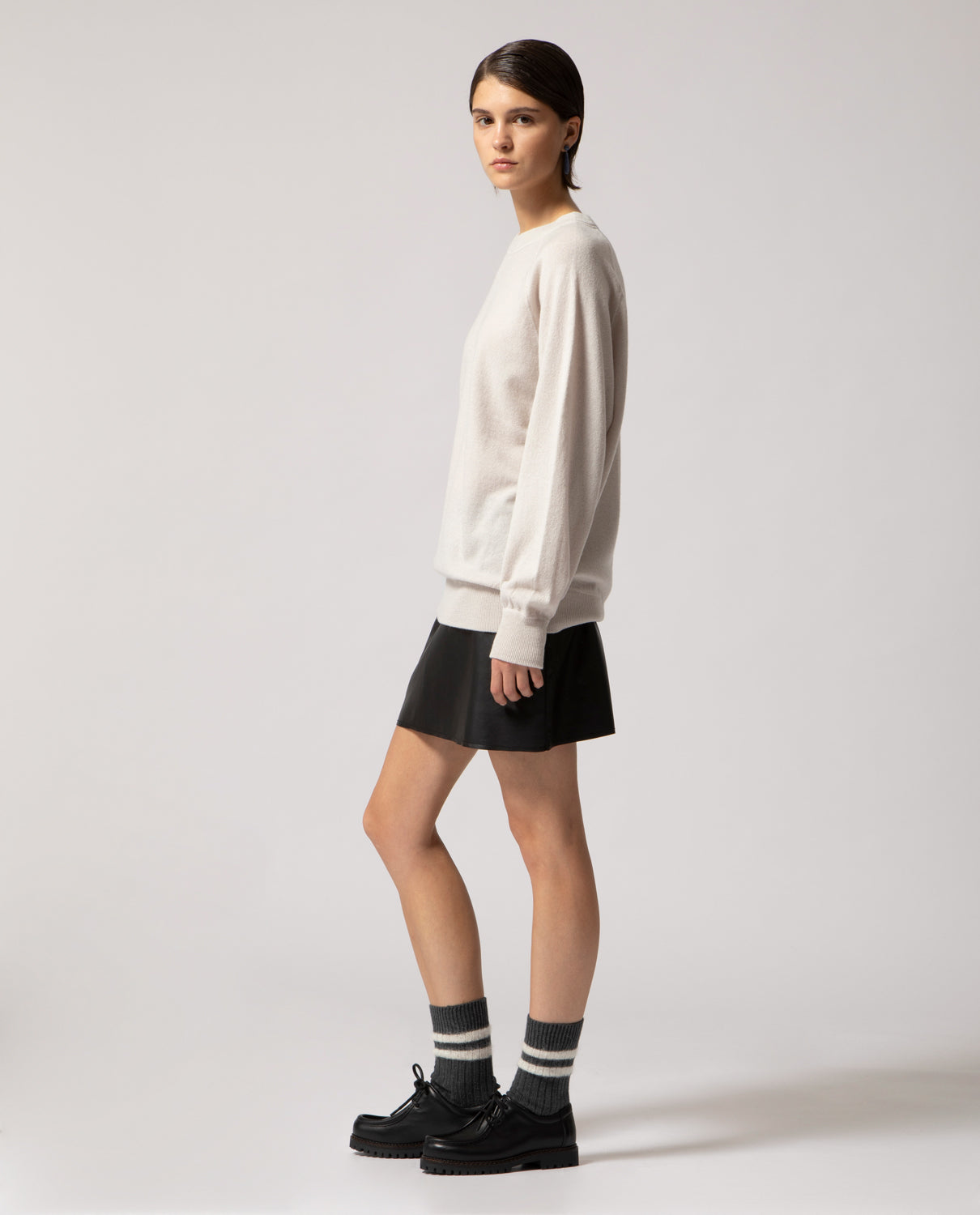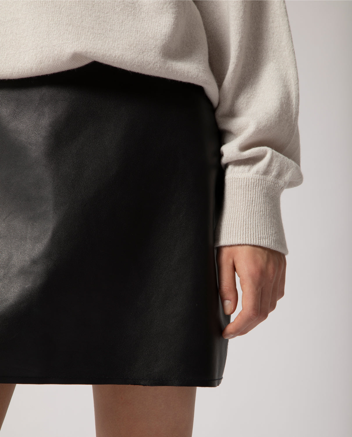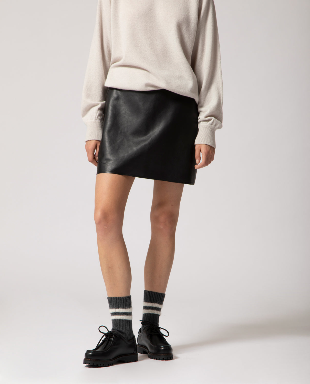 Short A-line cut leather skirt, detailed with a concealed zip closure. The piece is fully lined in cotton for comfort and structure.