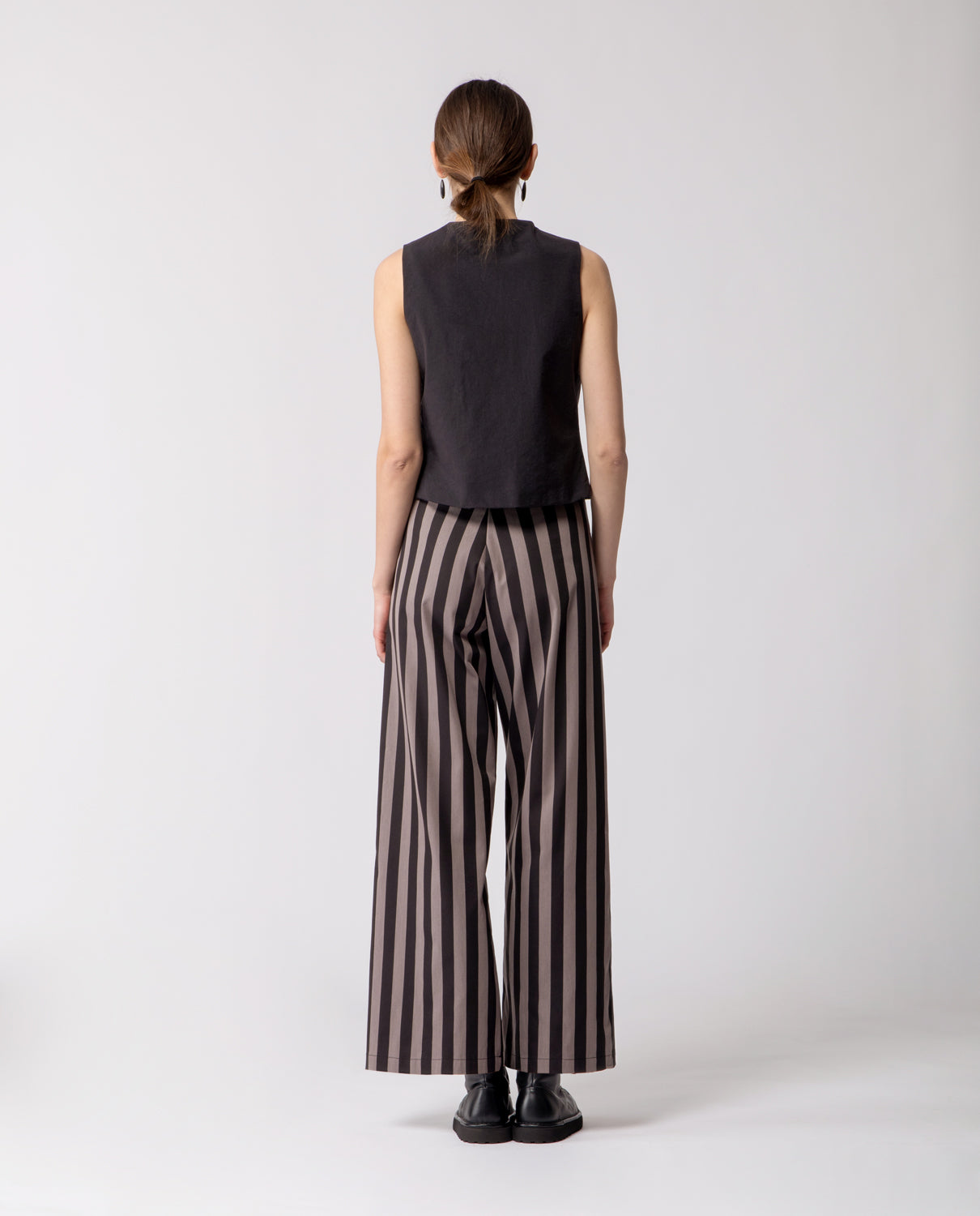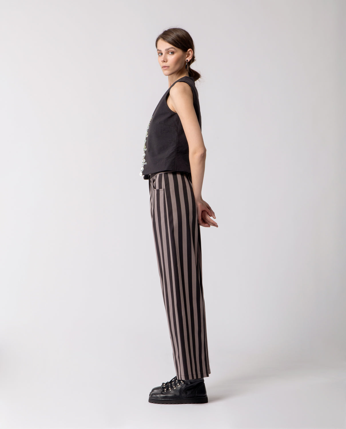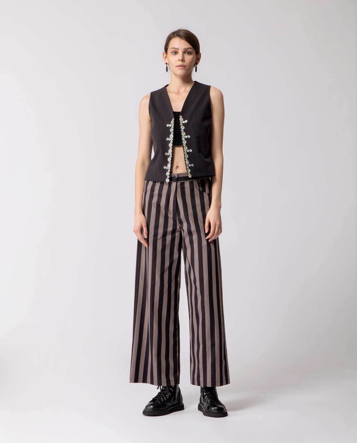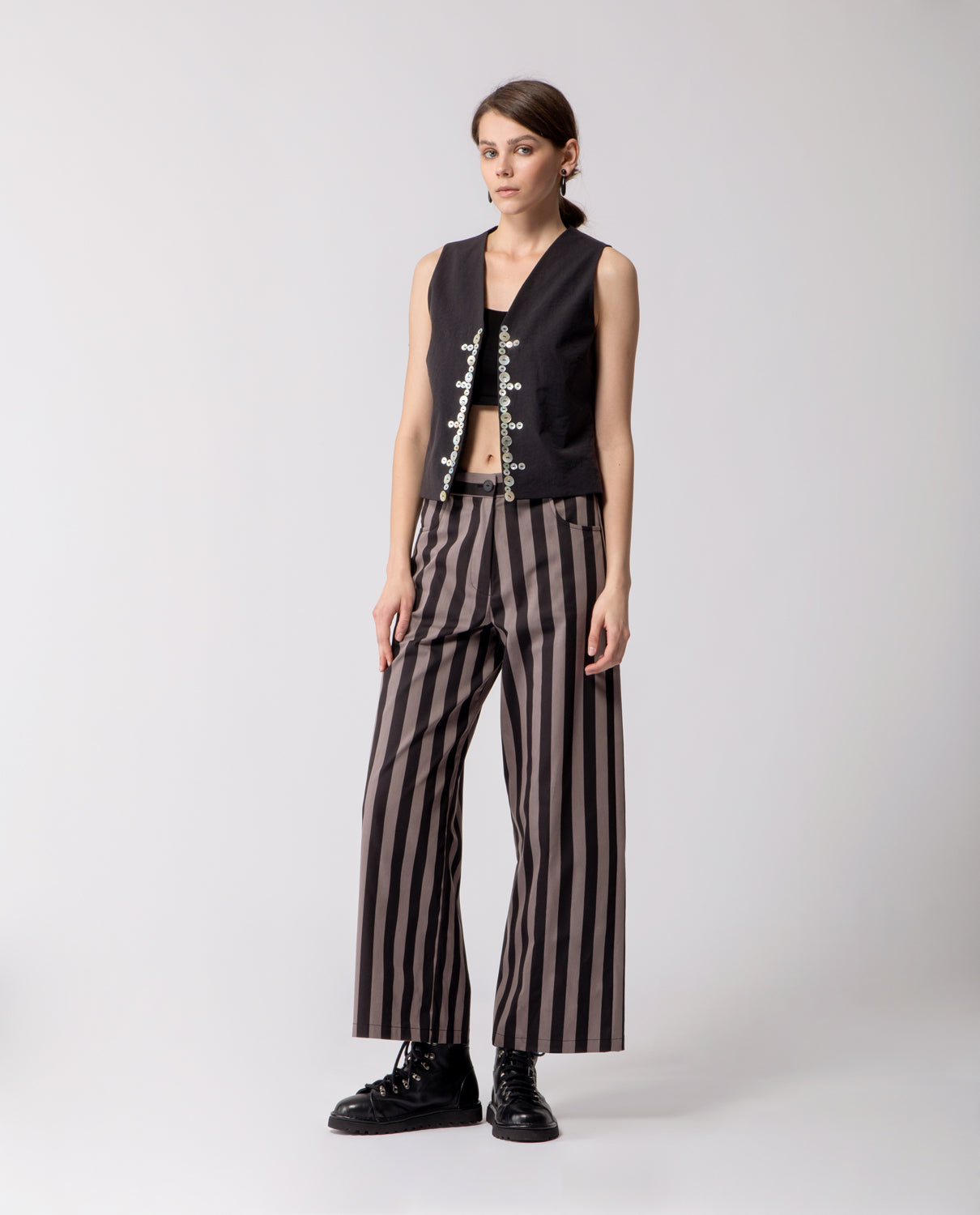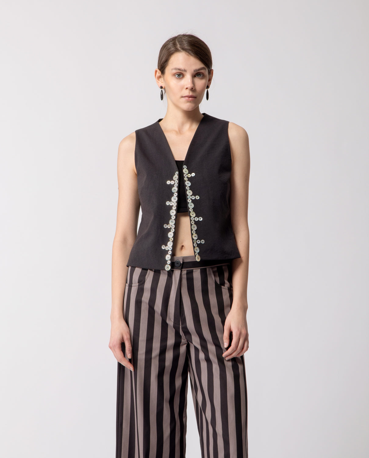 A squared gilet crafted in pure linen, inspired by the English Pearly Kings and Queens — a late 19th-century London community known for hand-sewing mother-of-pearl buttons as symbols of civic pride and solidarity. The front is adorned with three sizes of mother-of-pearl buttons, each carefully hand-stitched. A subtle tribute to the original tradition, celebrating craftsmanship and meticulous attention to detail.