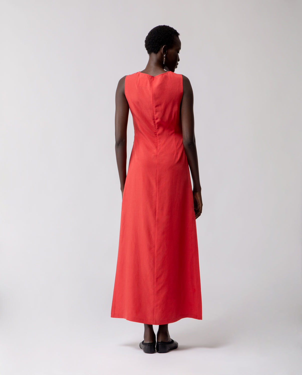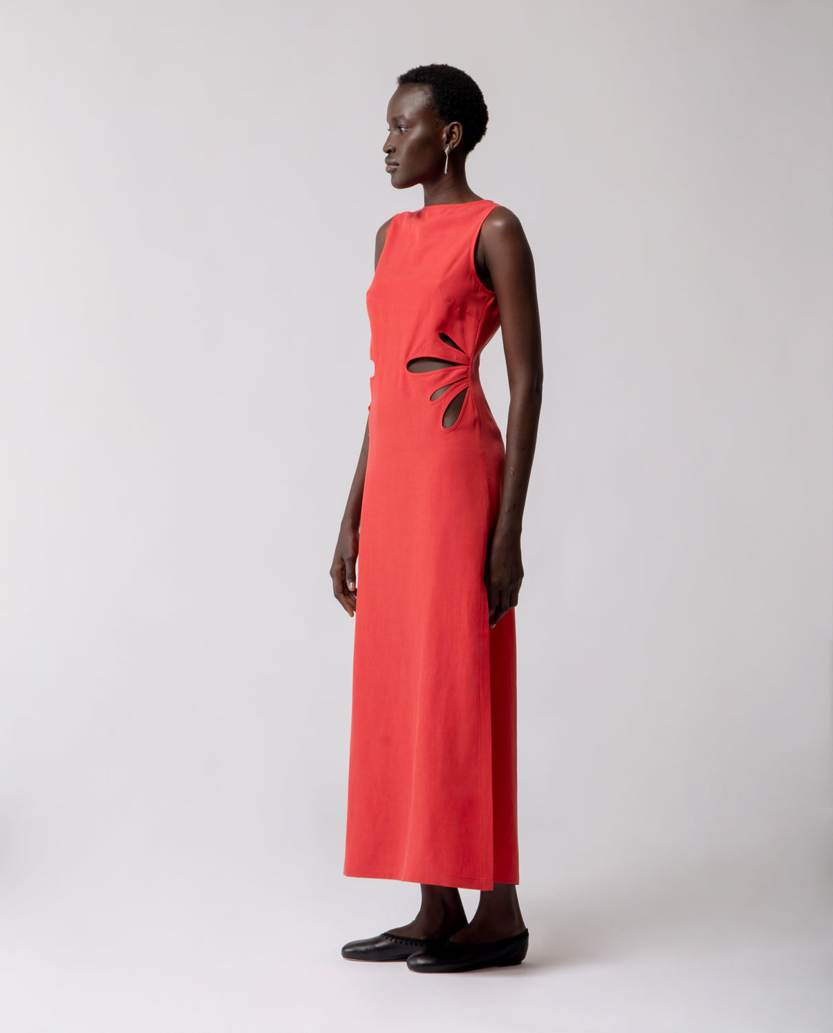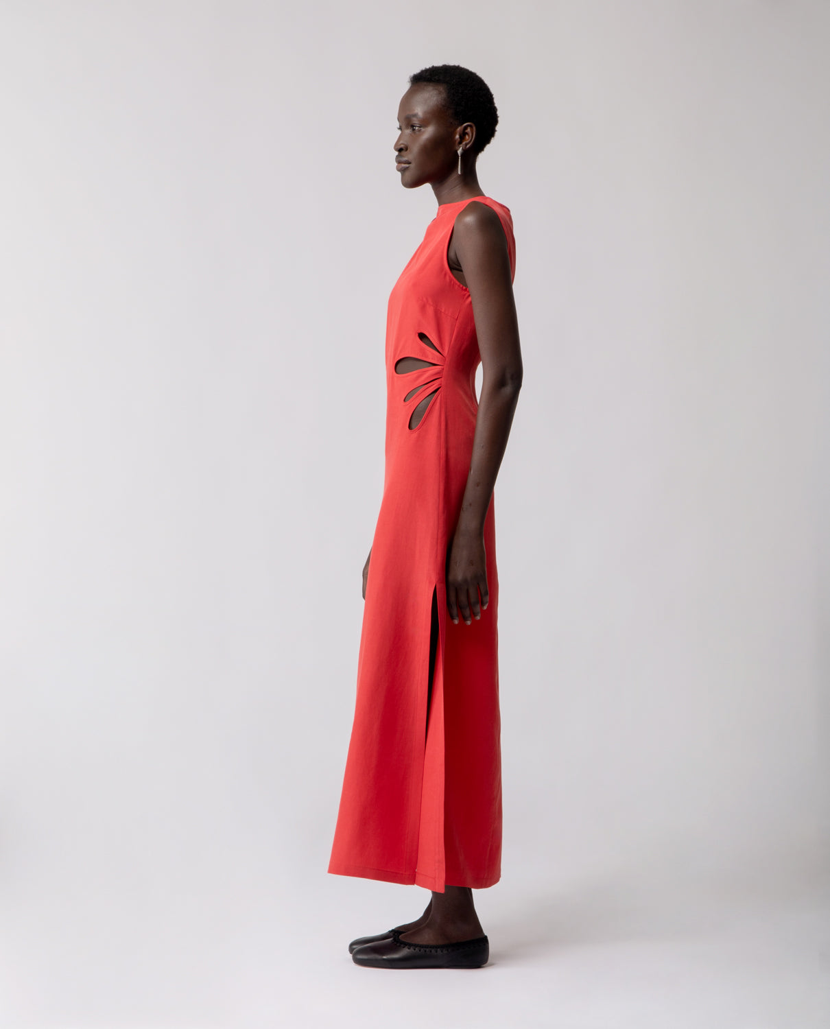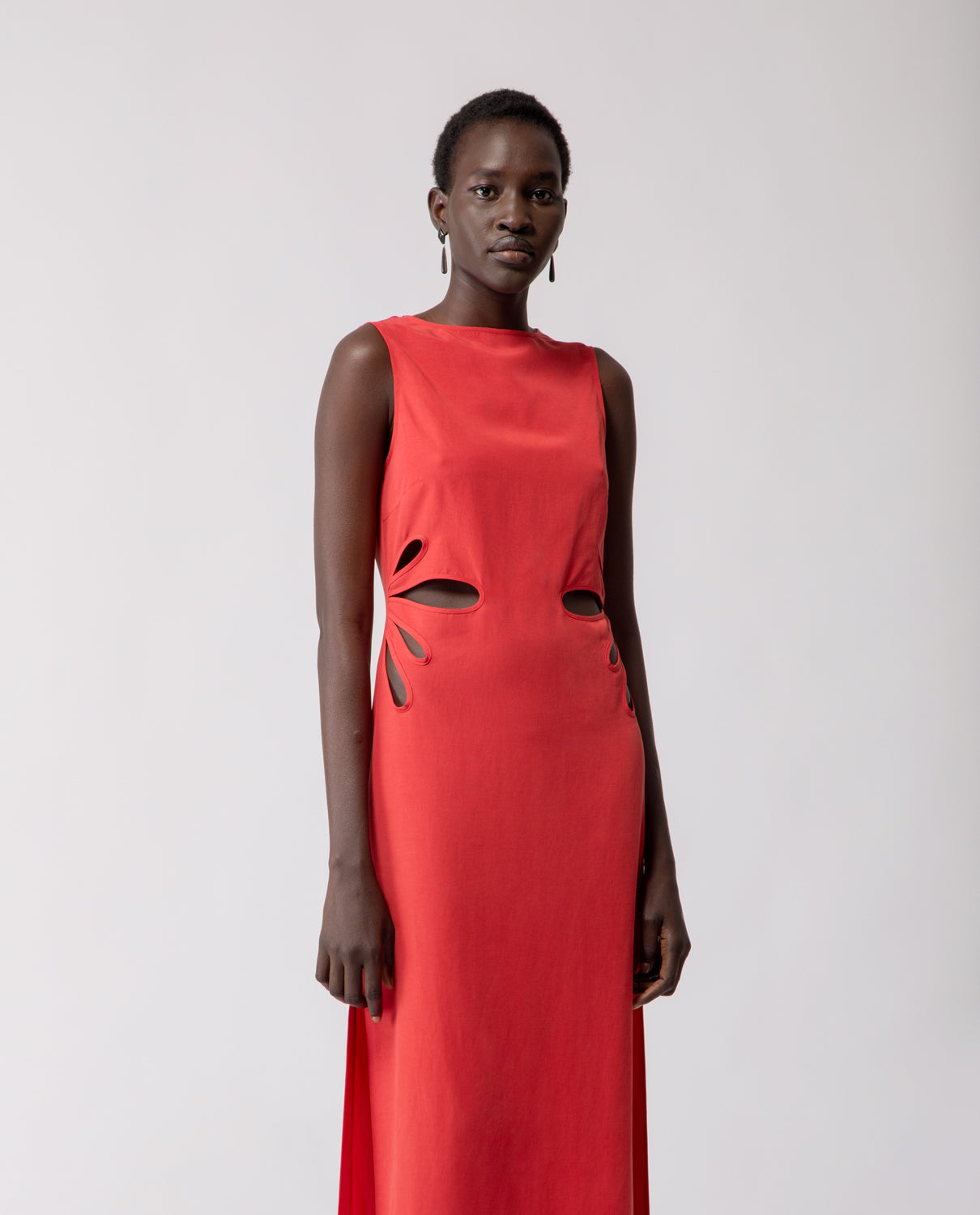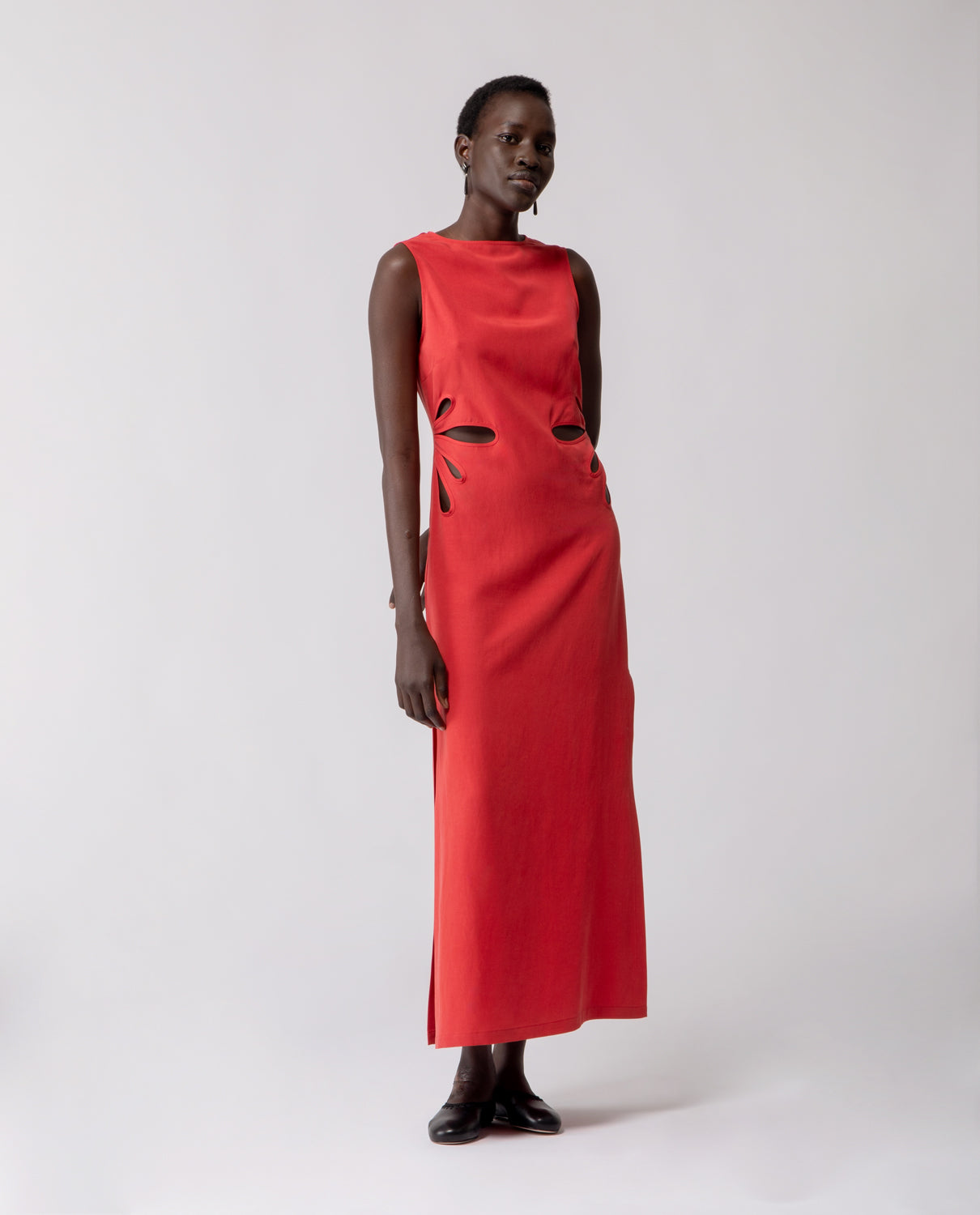 A long sheath dress defined by clean, understated lines and inspired by the elegant silhouette of the traditional Chinese qipao. Side slits enhance movement, while the waist is adorned with hand-crafted details reminiscent of flower petals — subtly adding depth and volume while preserving the garment’s streamlined shape.