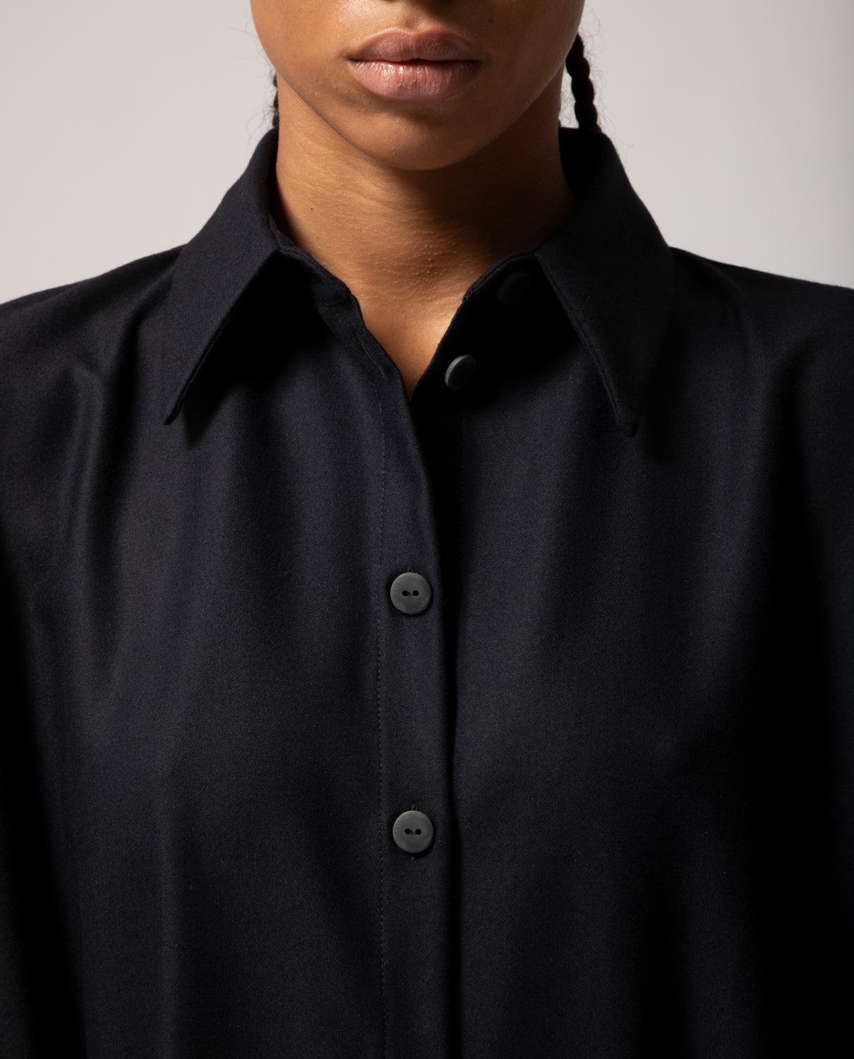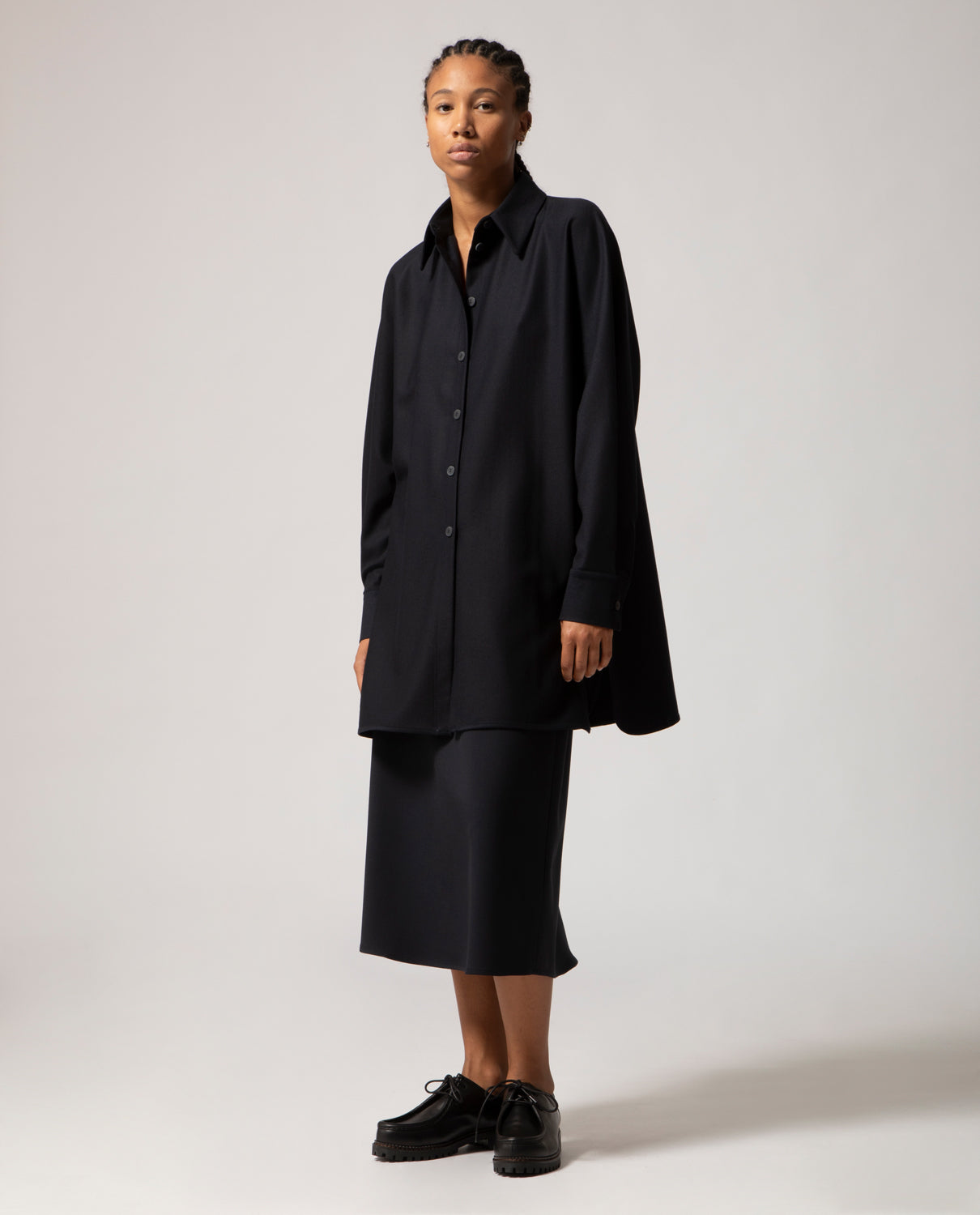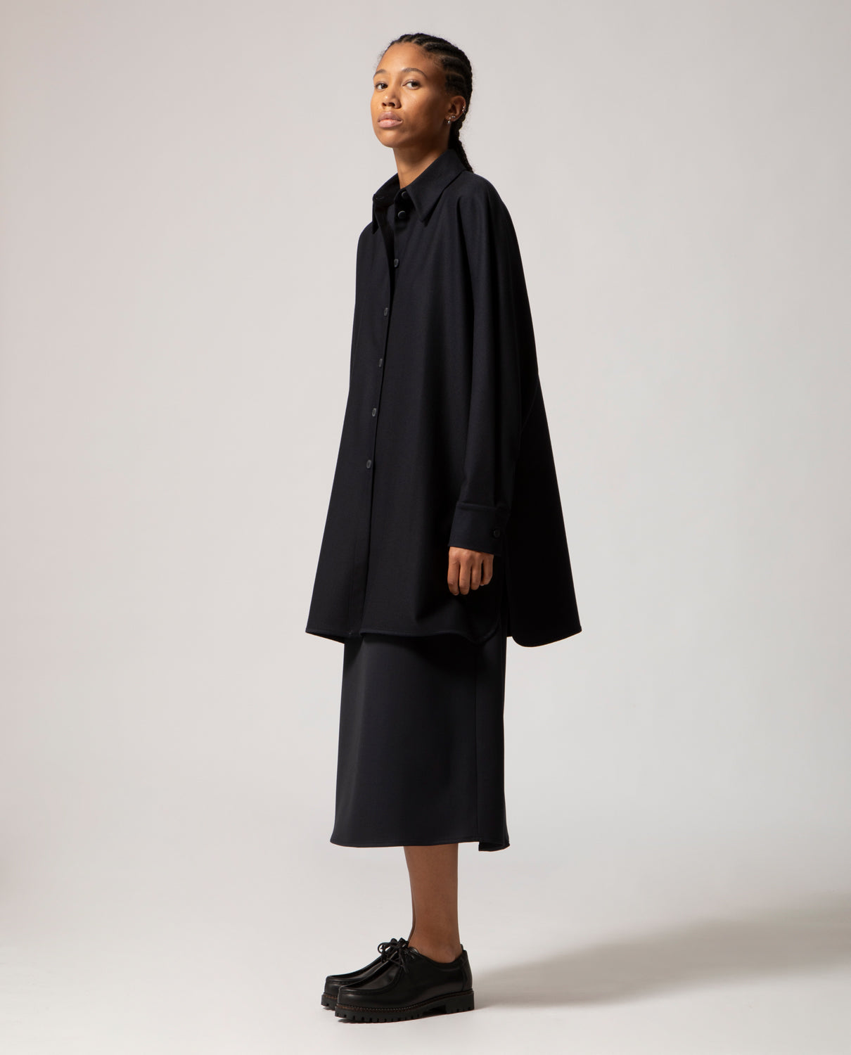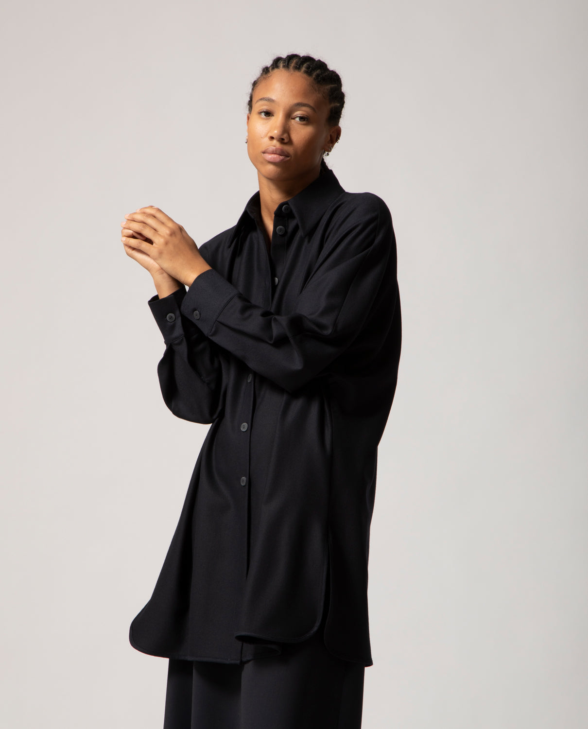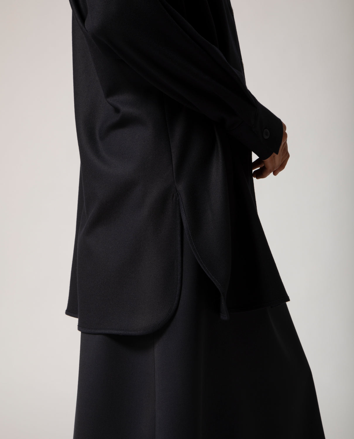 Cut in an oversized silhouette, this piece can be worn either as a light jacket or layered under a coat. Designed with small buttons and rounded side slits, it offers ease and versatility.