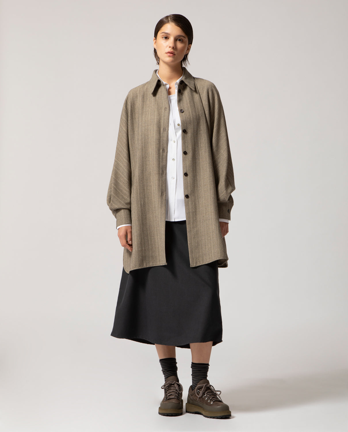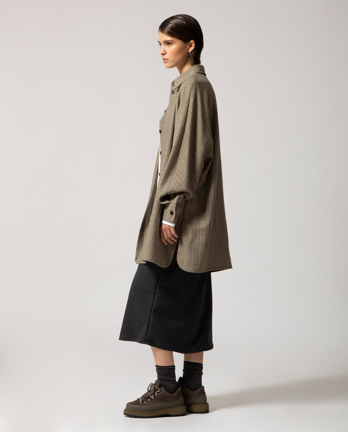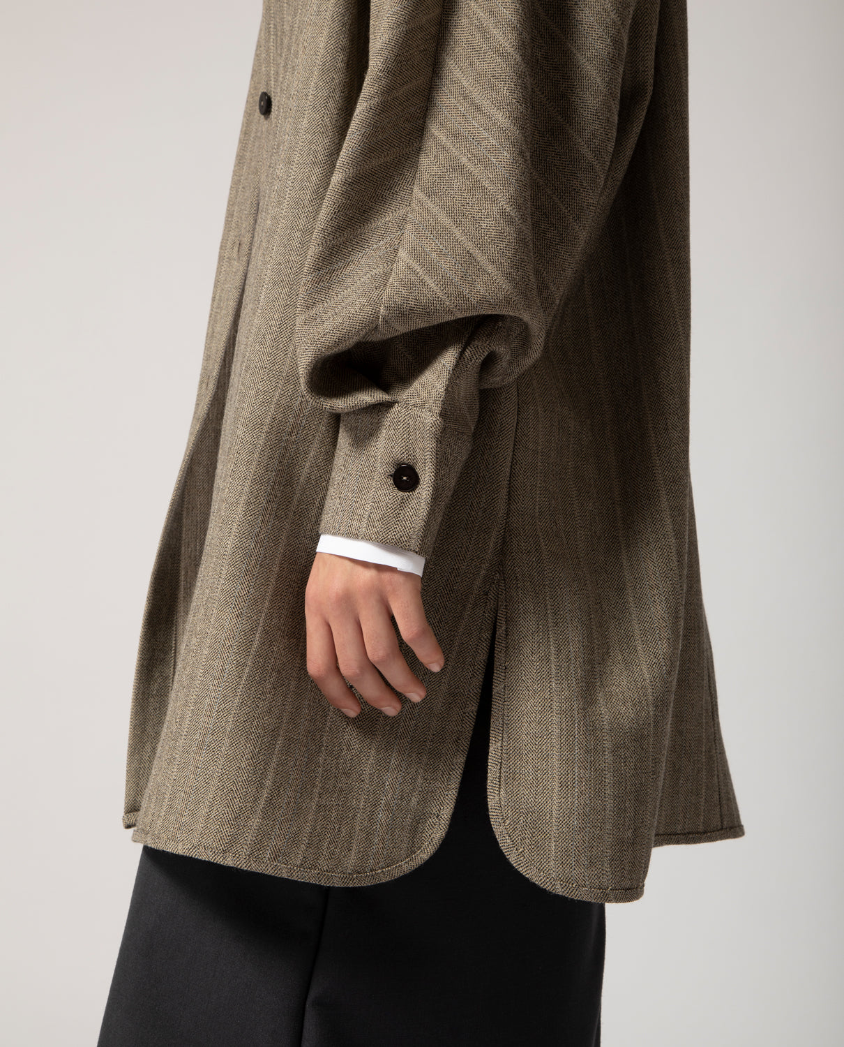 Cut in an oversized silhouette, this piece can be worn either as a light jacket or layered under a coat. Designed with small buttons and rounded side slits, it offers ease and versatility.