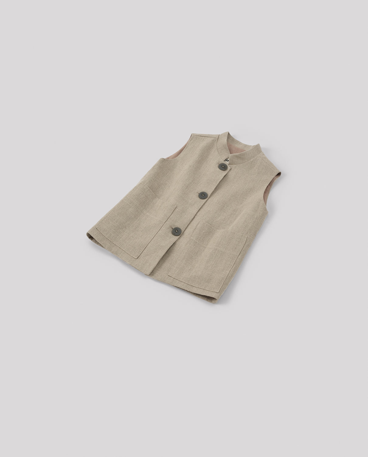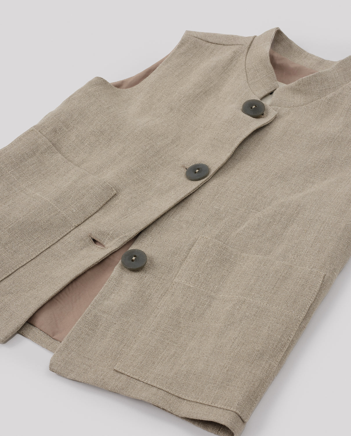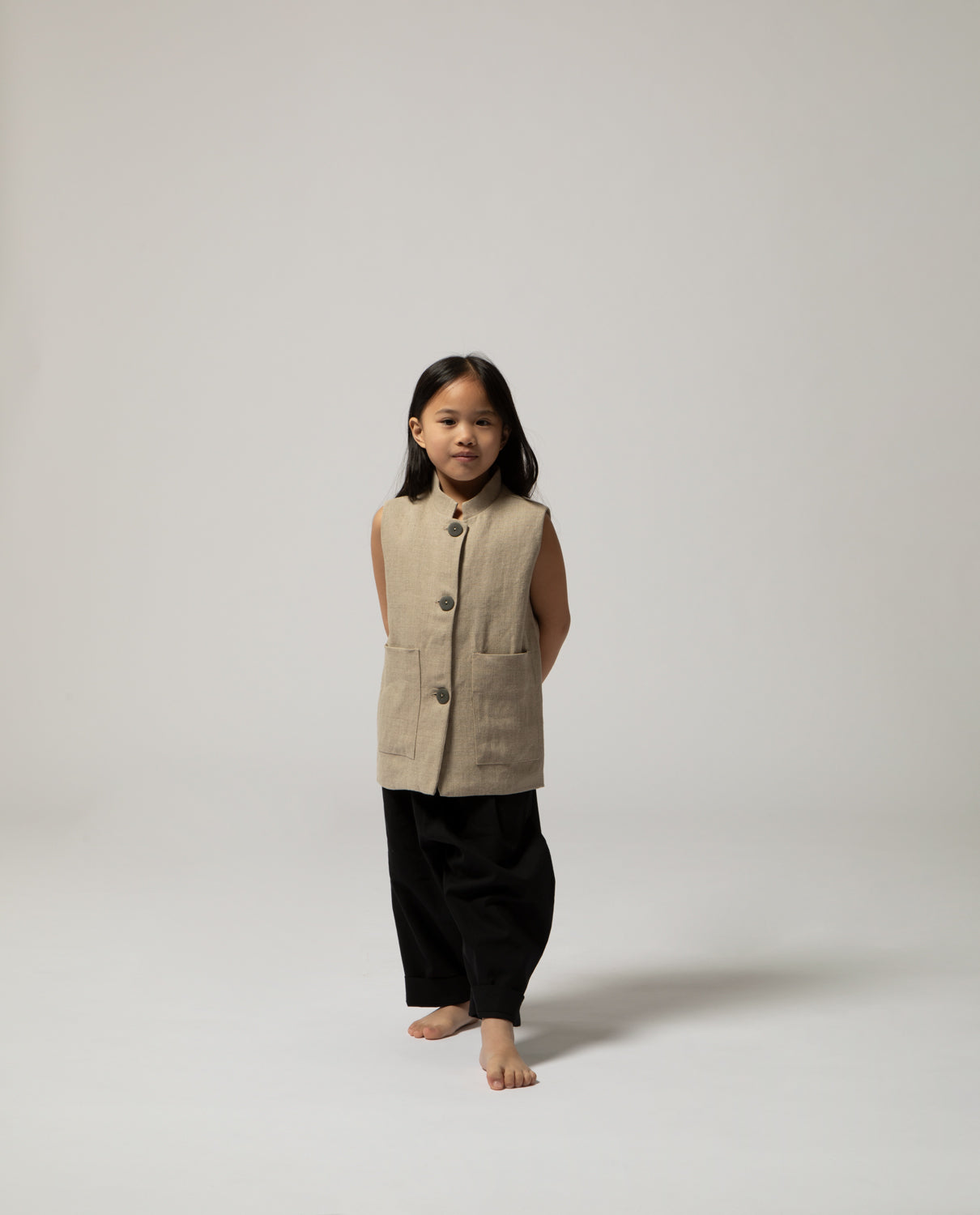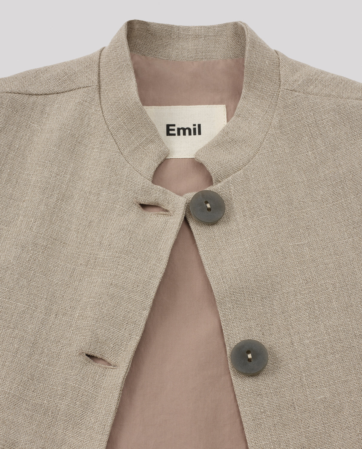 Emil's statement piece joshi is the oversize fit gilet in thick linen with korean-style collar and front pockets.