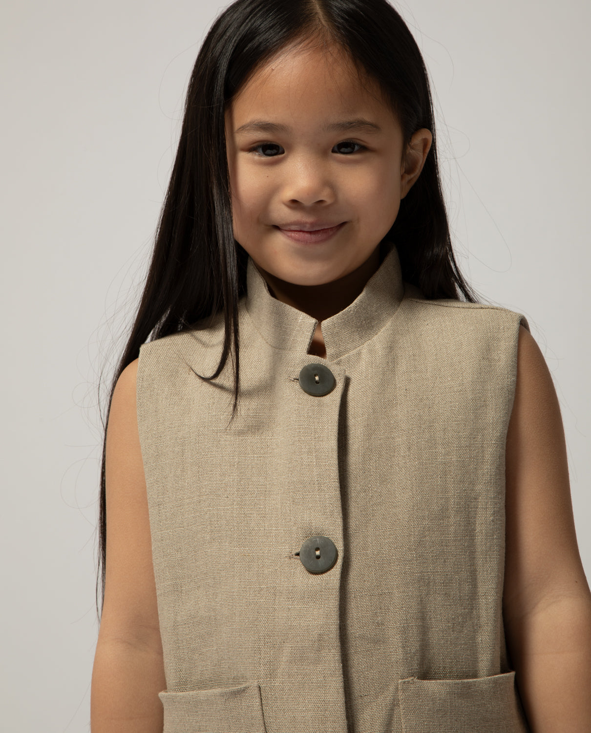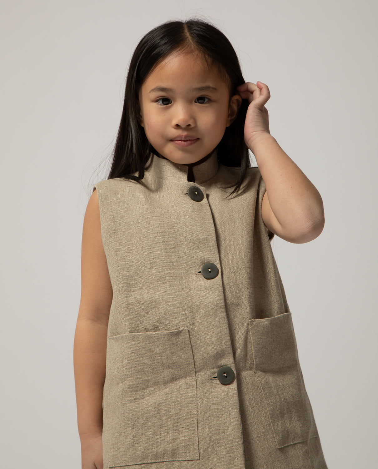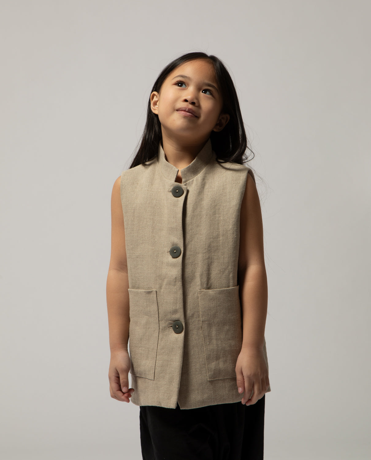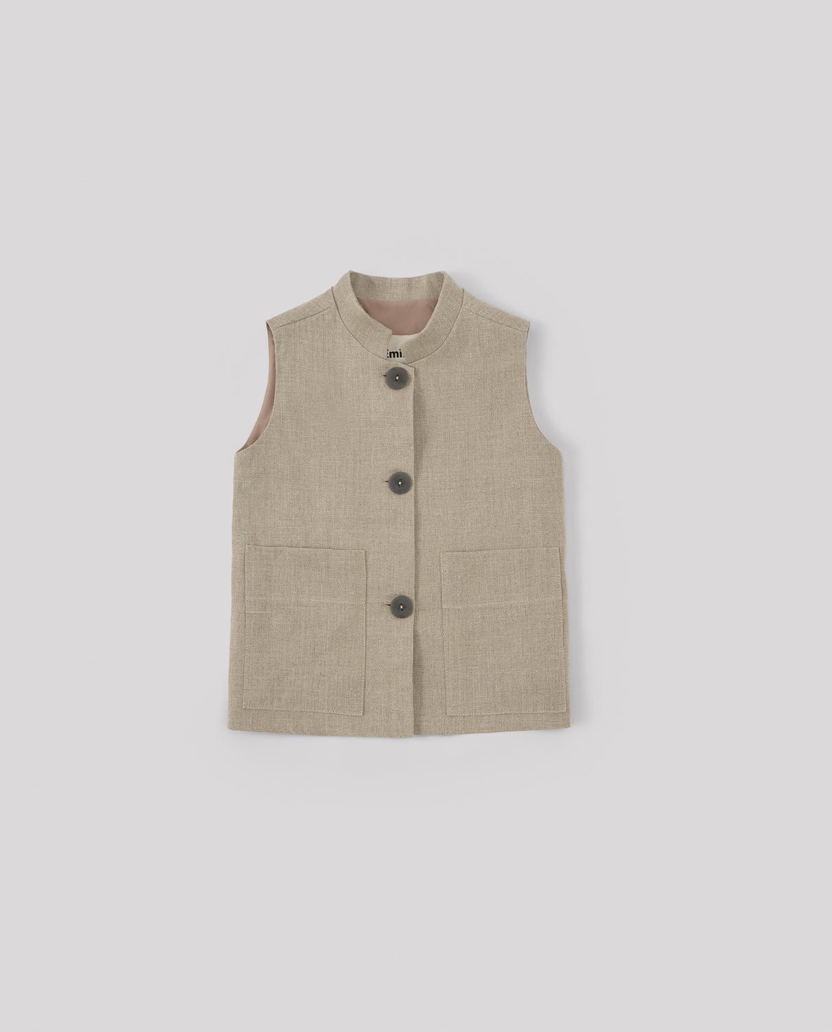 Emil's statement piece joshi is the oversize fit gilet in thick linen with korean-style collar and front pockets.