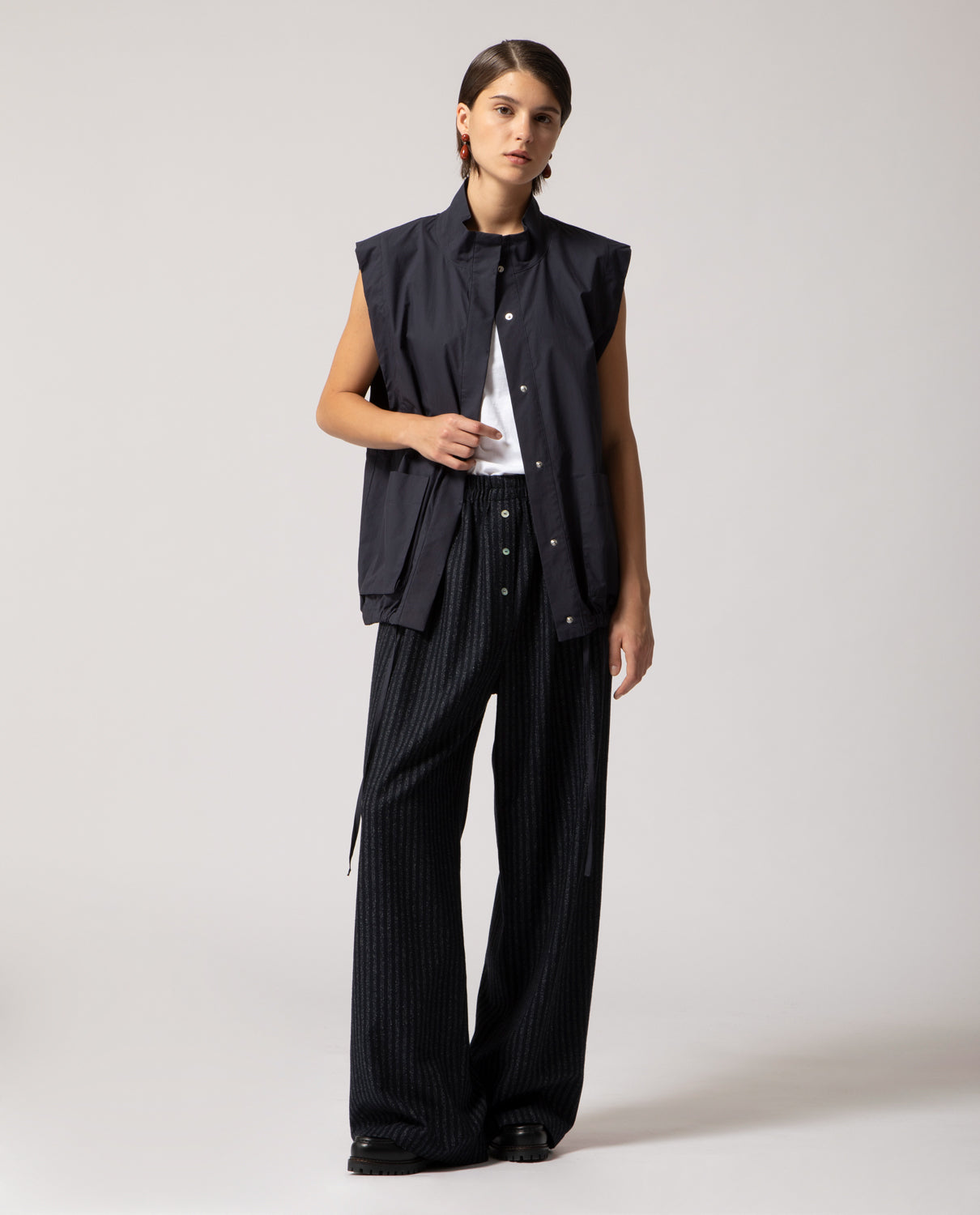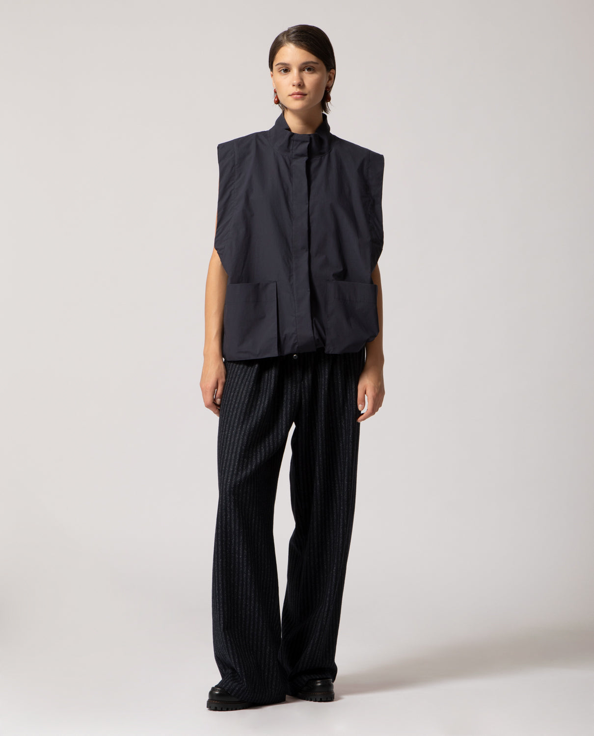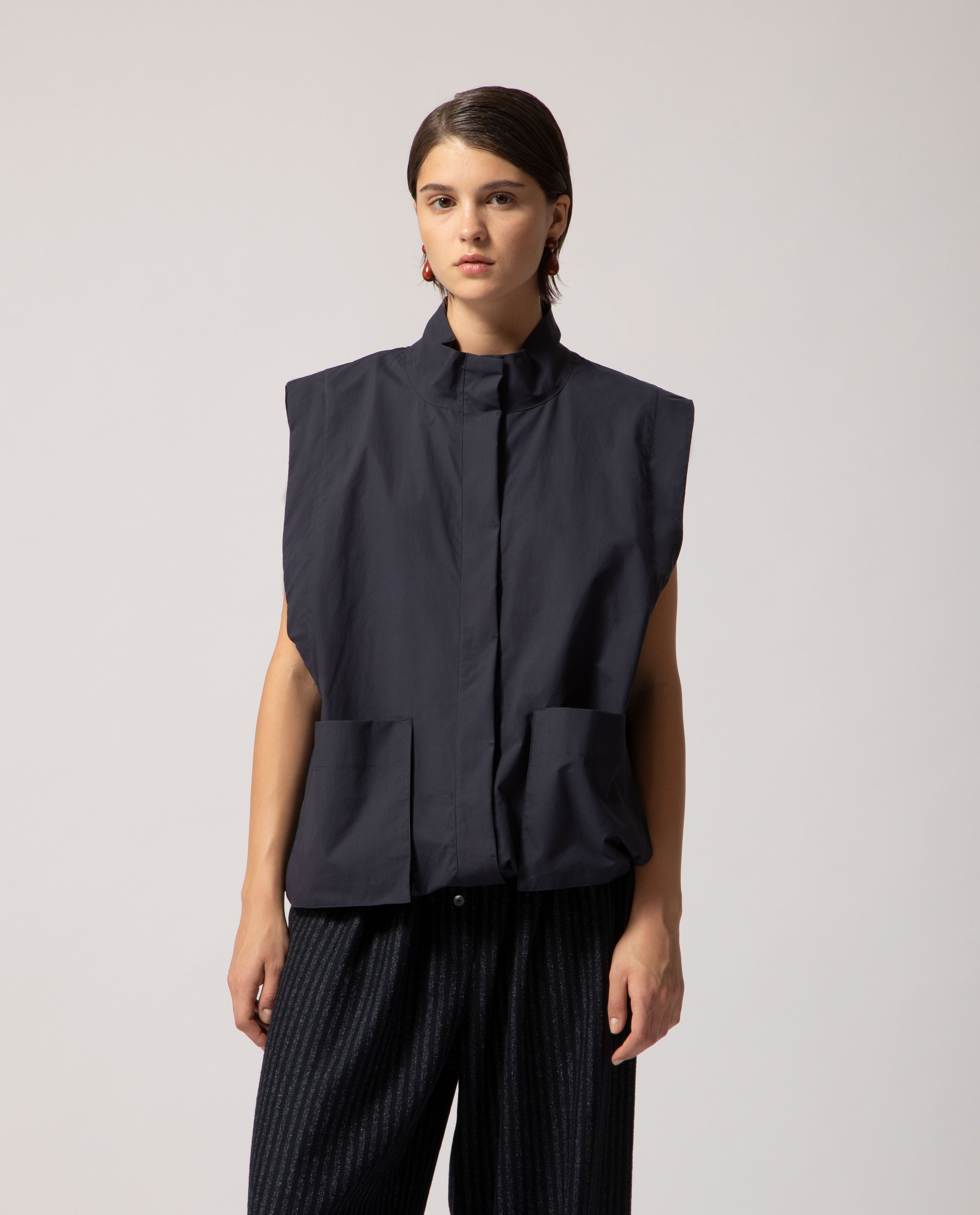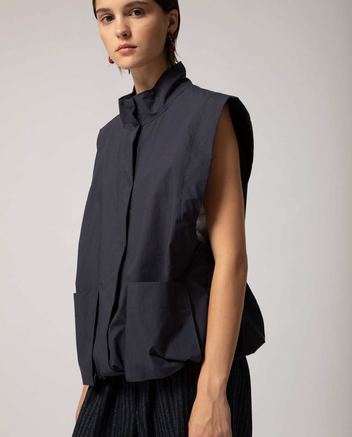Designed in a relaxed, oversized fit, this gilet features metal snap buttons, low gusseted pockets, and a drawstring at the sides for adjustable volume.