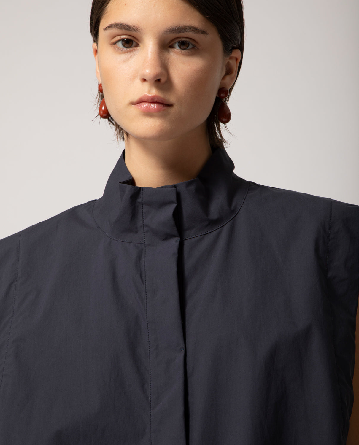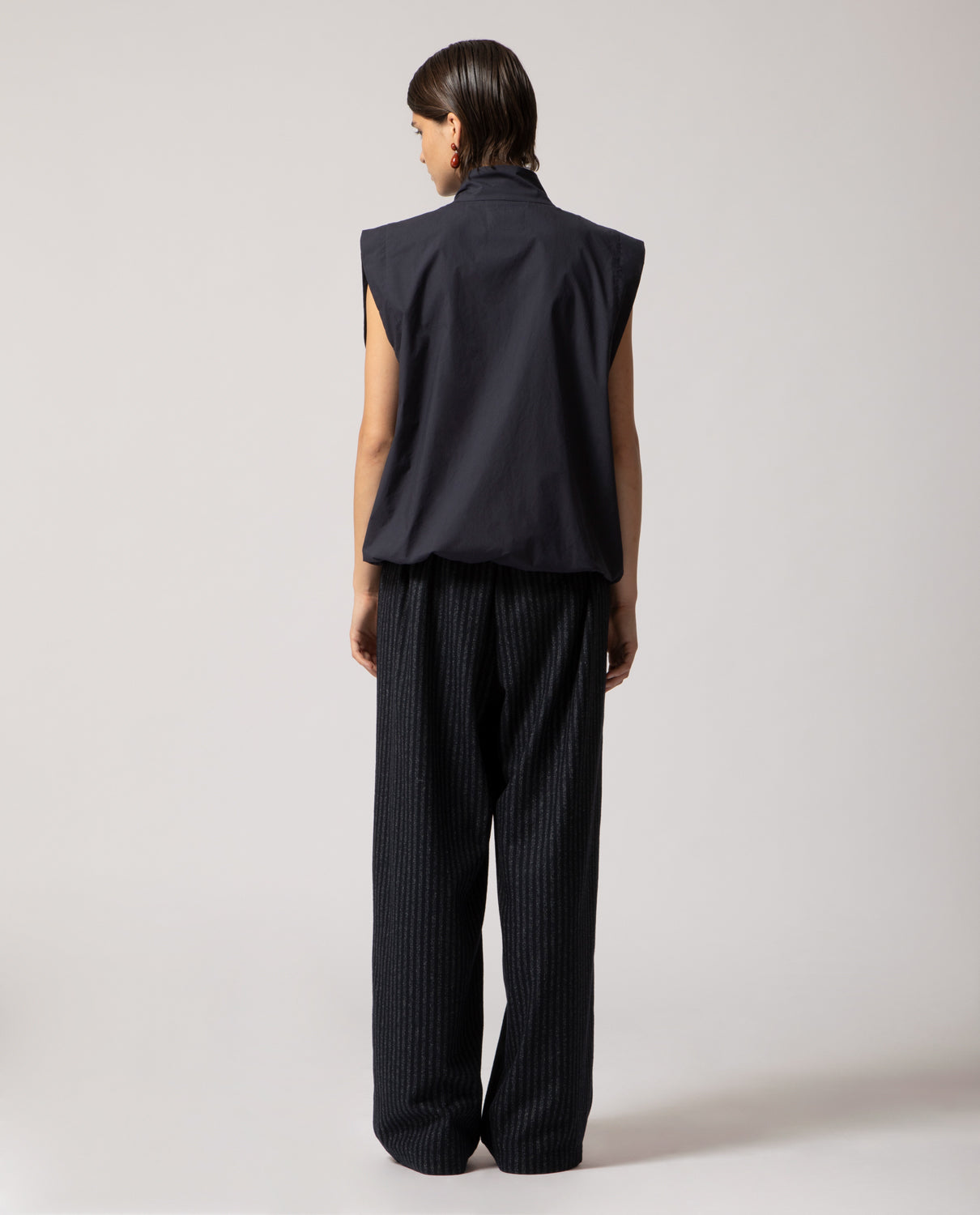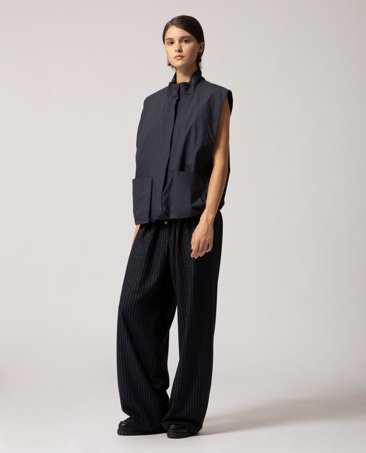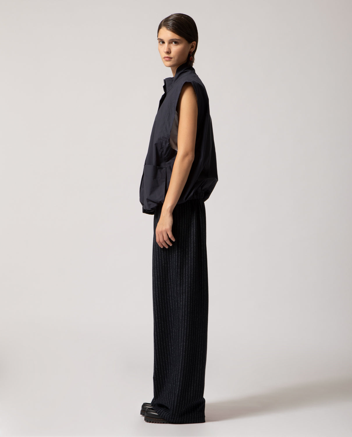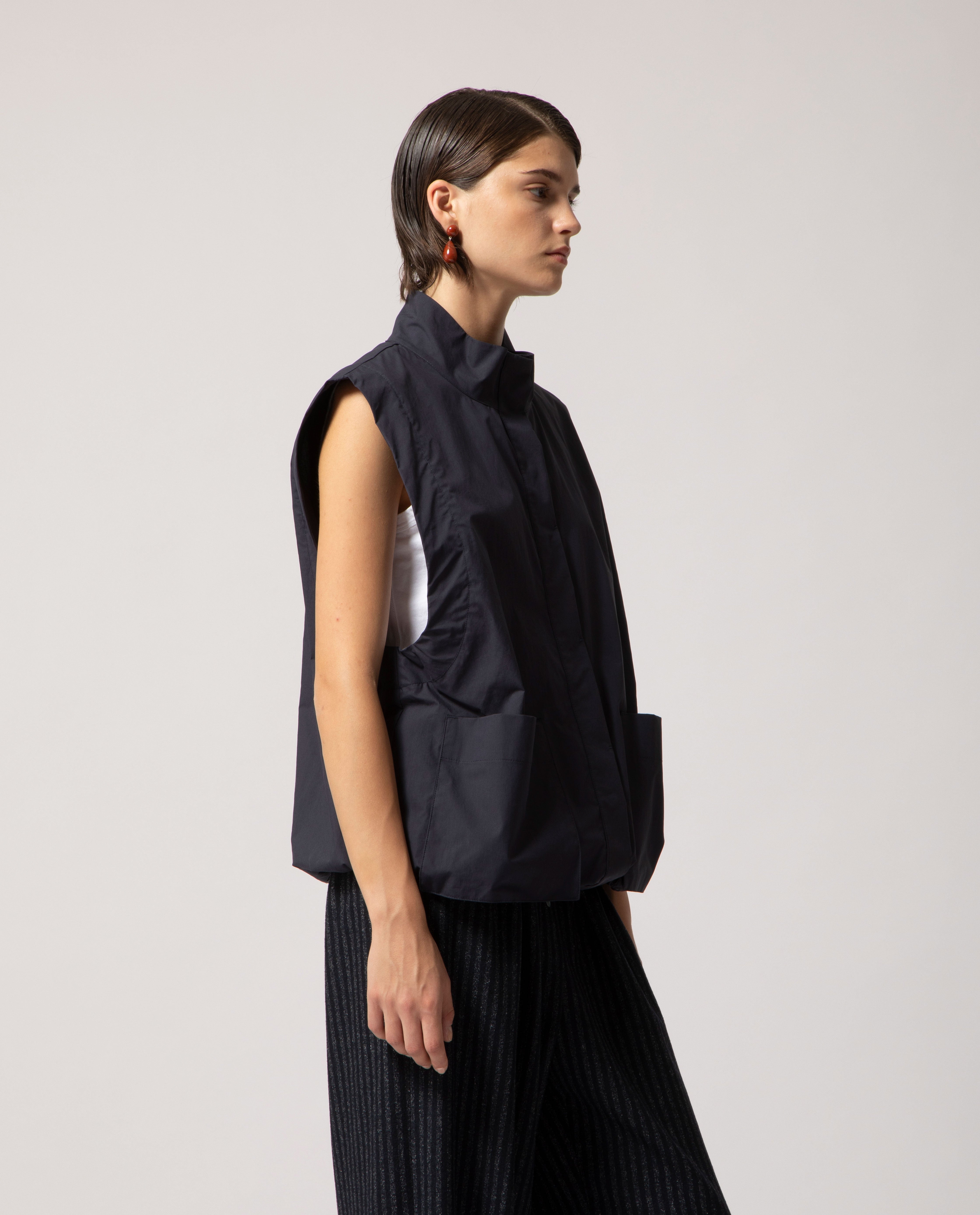Designed in a relaxed, oversized fit, this gilet features metal snap buttons, low gusseted pockets, and a drawstring at the sides for adjustable volume.