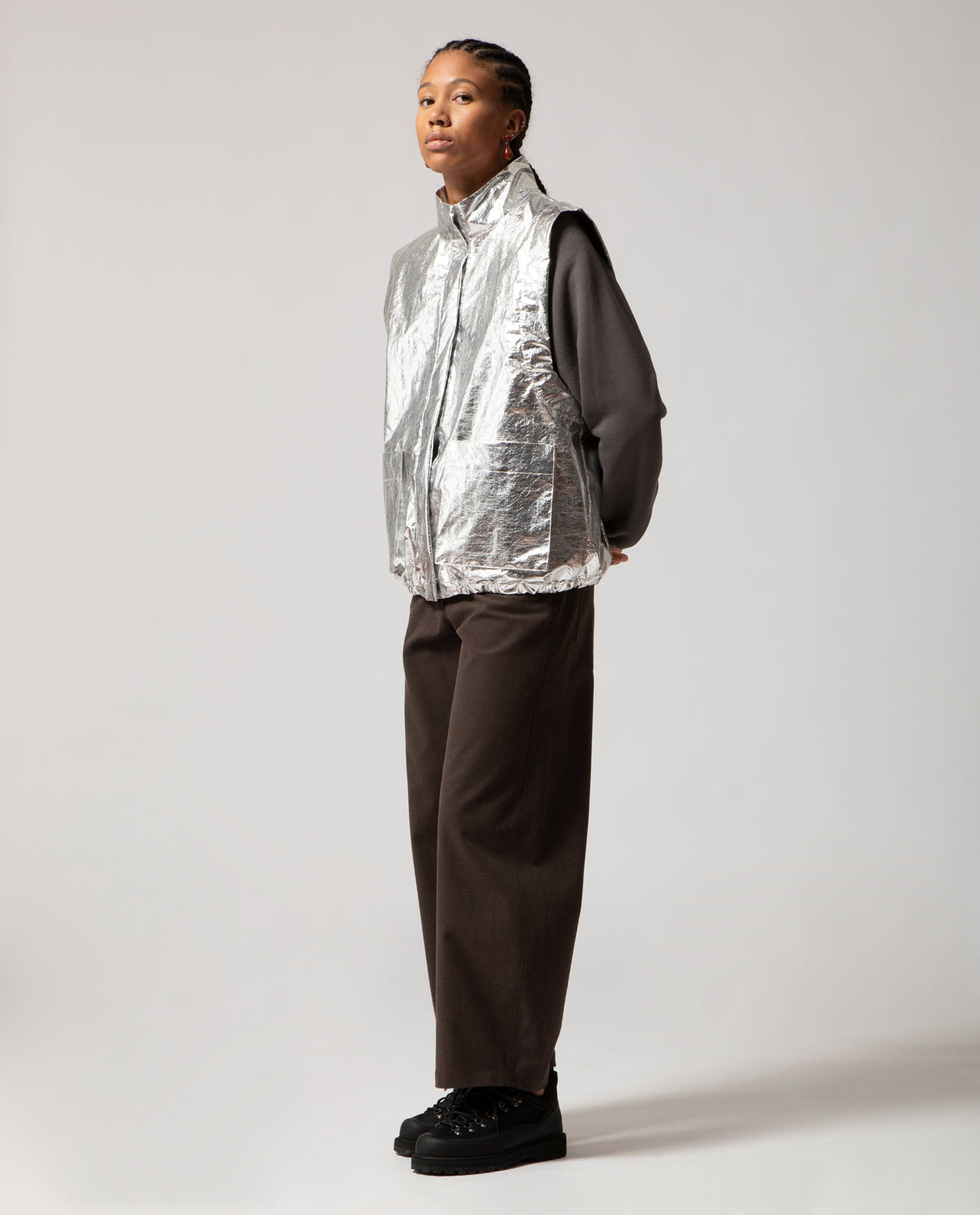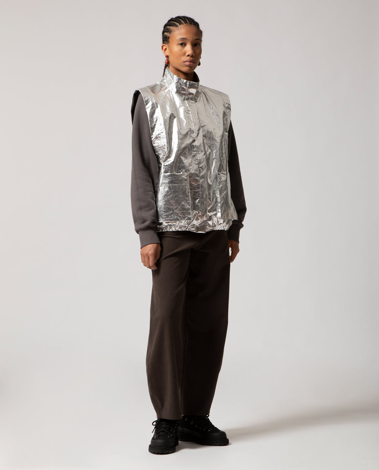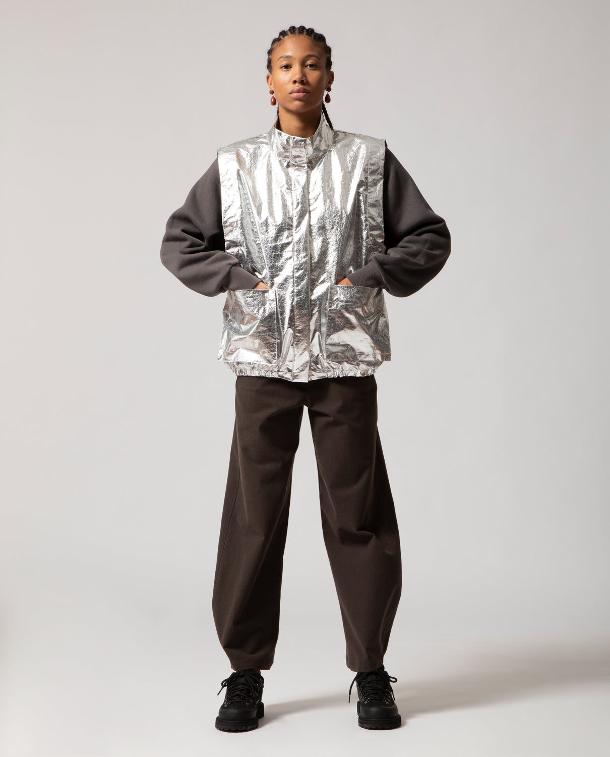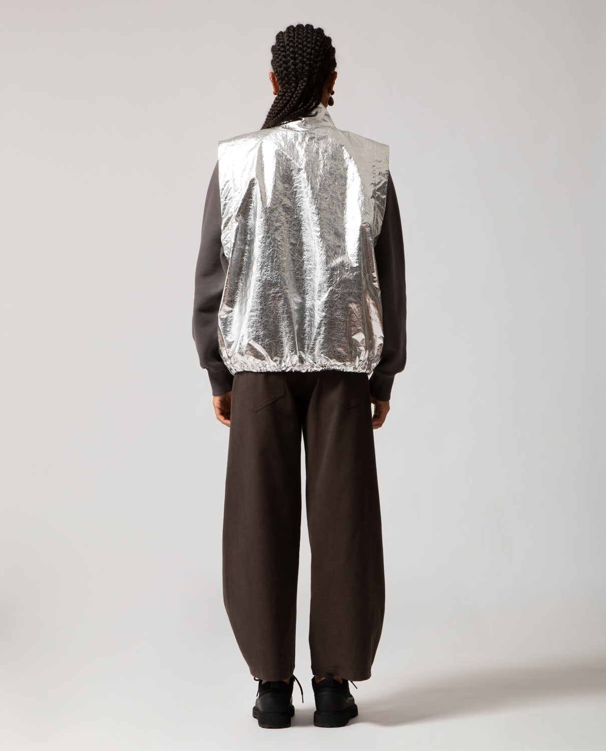 Designed in a relaxed, oversized fit, this gilet features metal snap buttons, low gusseted pockets, and a drawstring at the sides for adjustable volume.