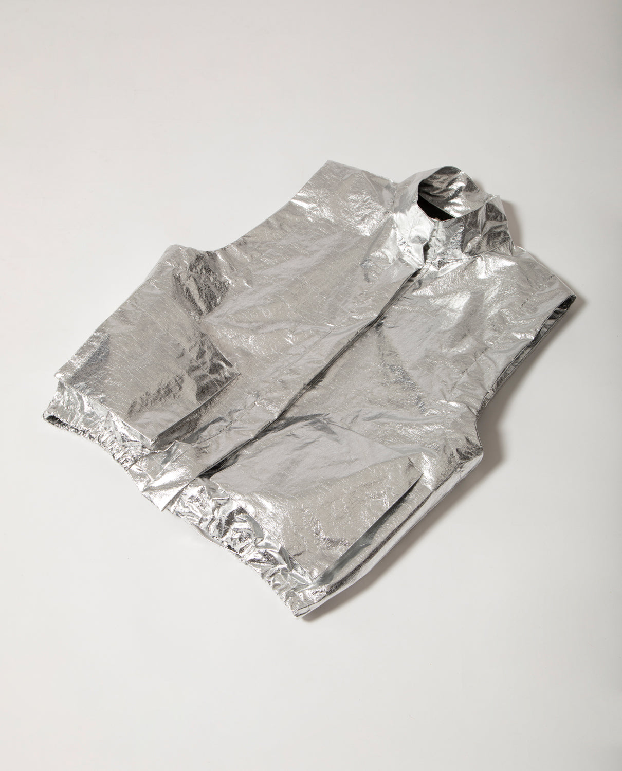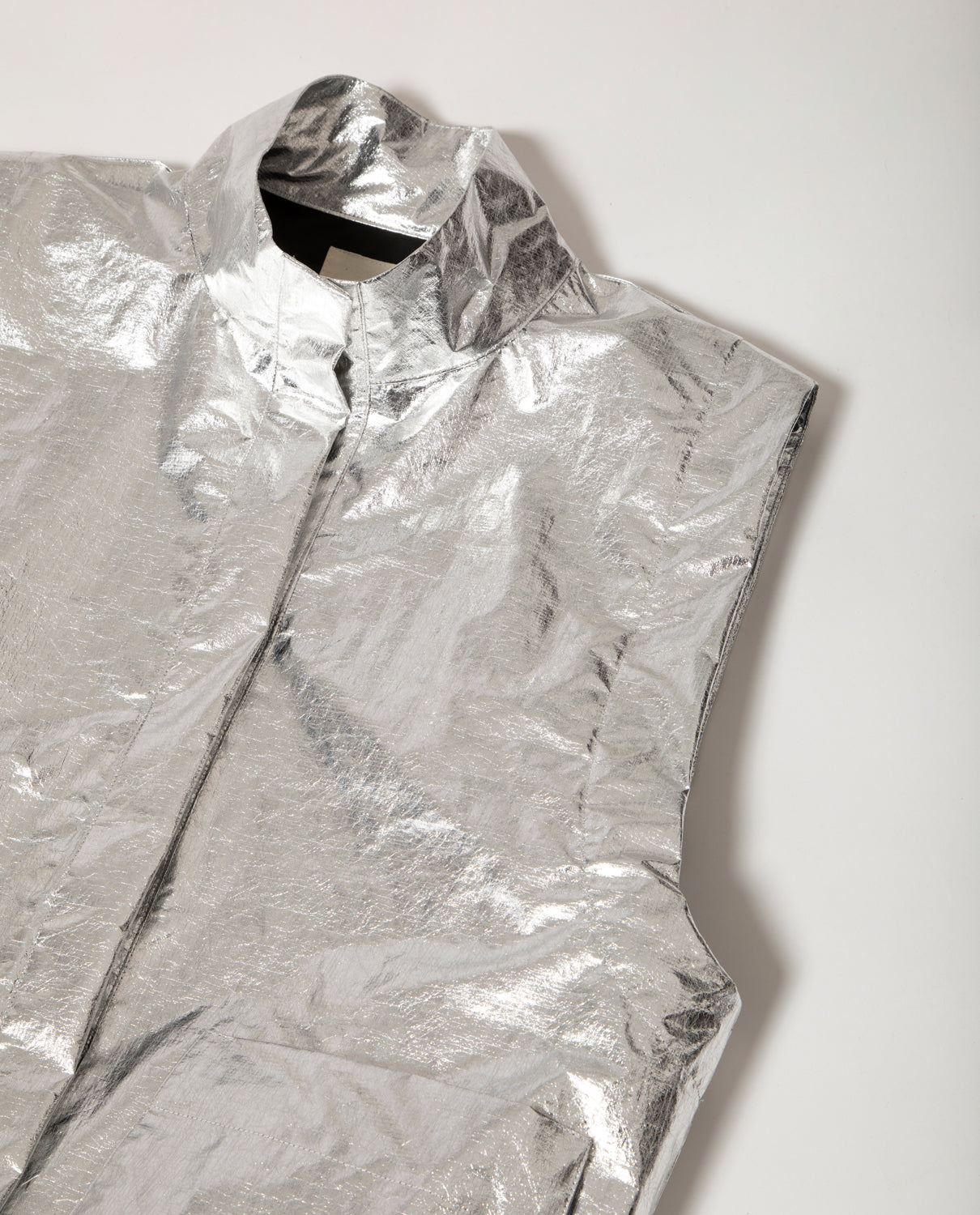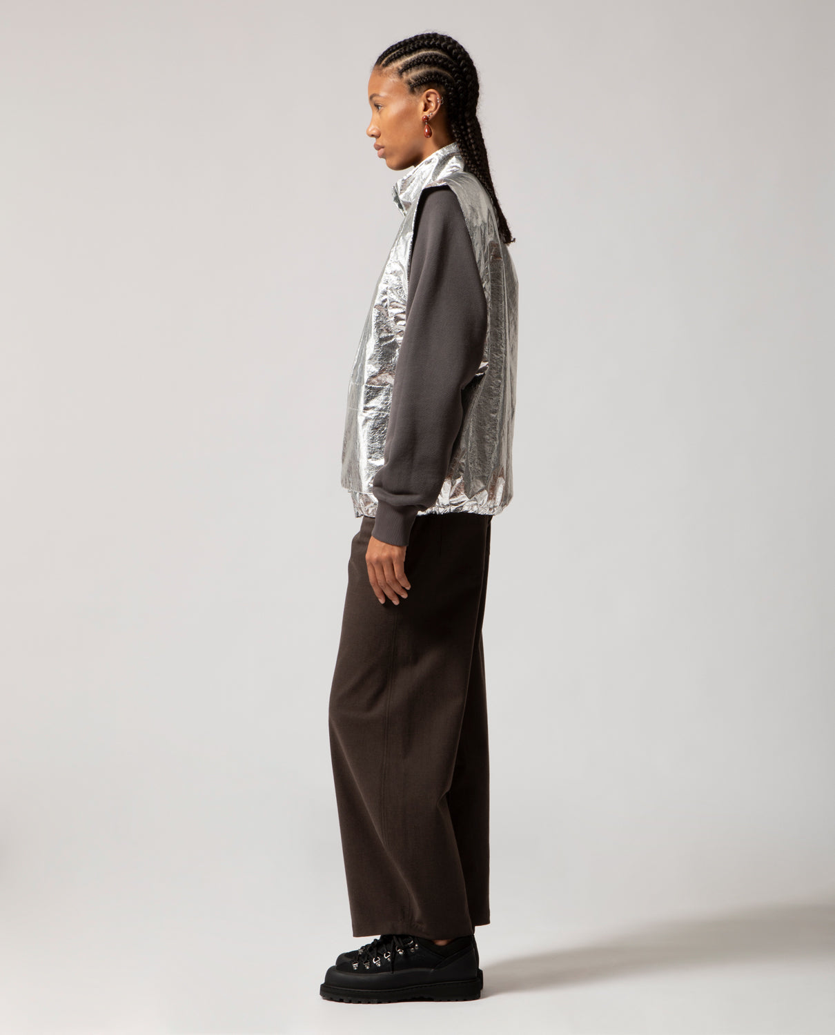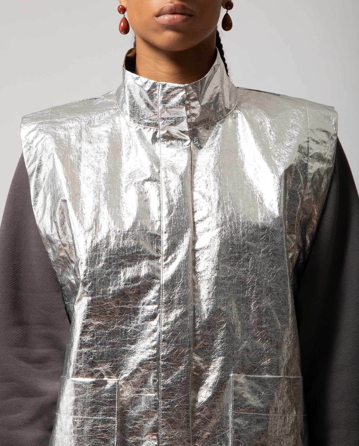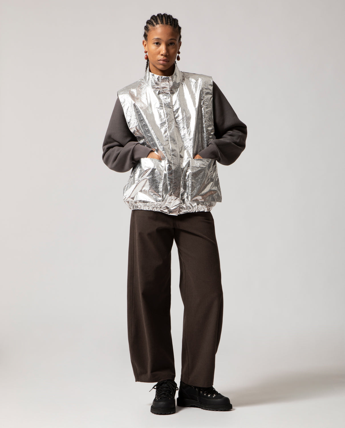 Designed in a relaxed, oversized fit, this gilet features metal snap buttons, low gusseted pockets, and a drawstring at the sides for adjustable volume.