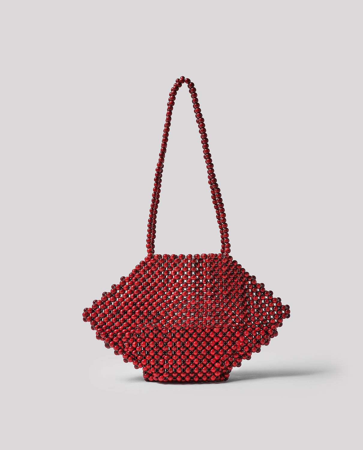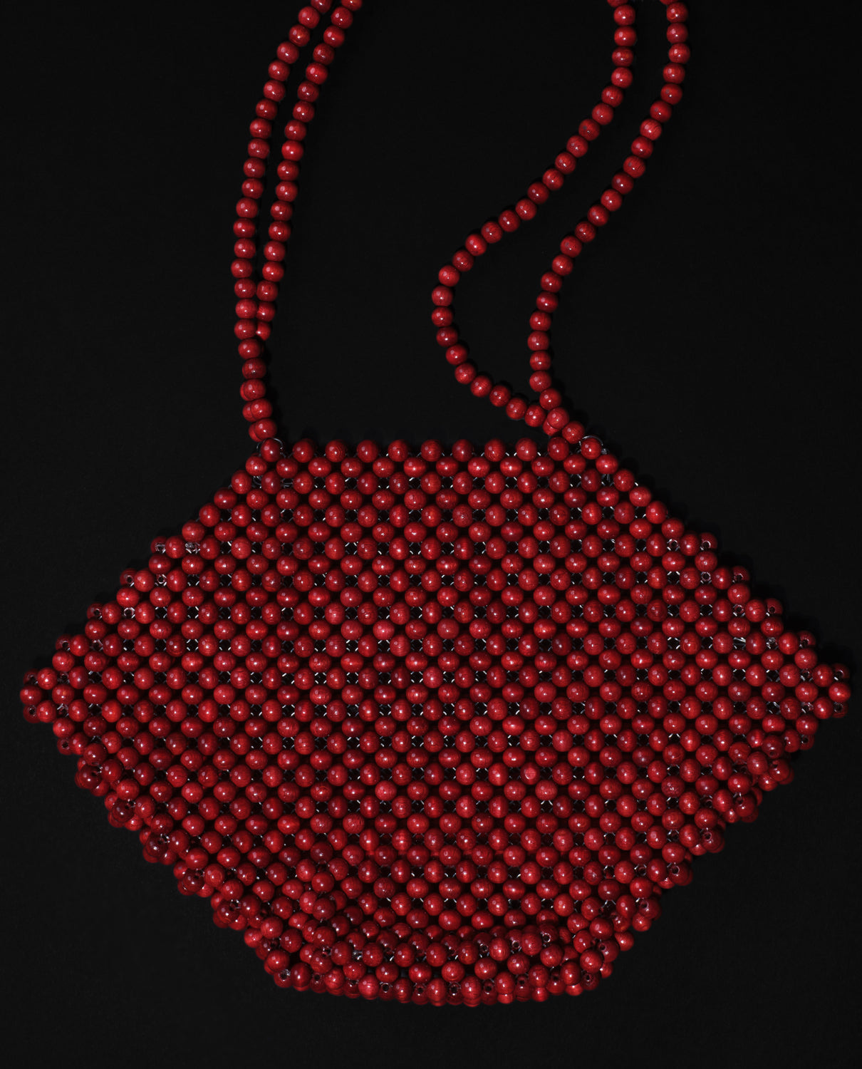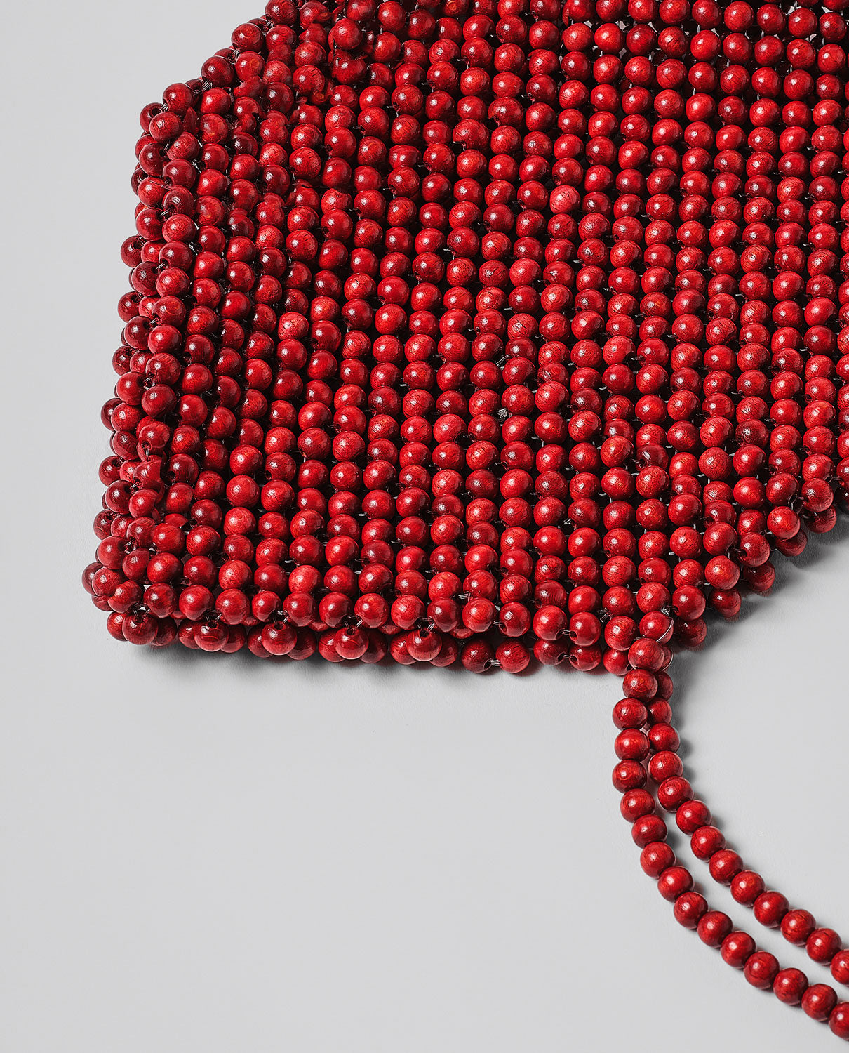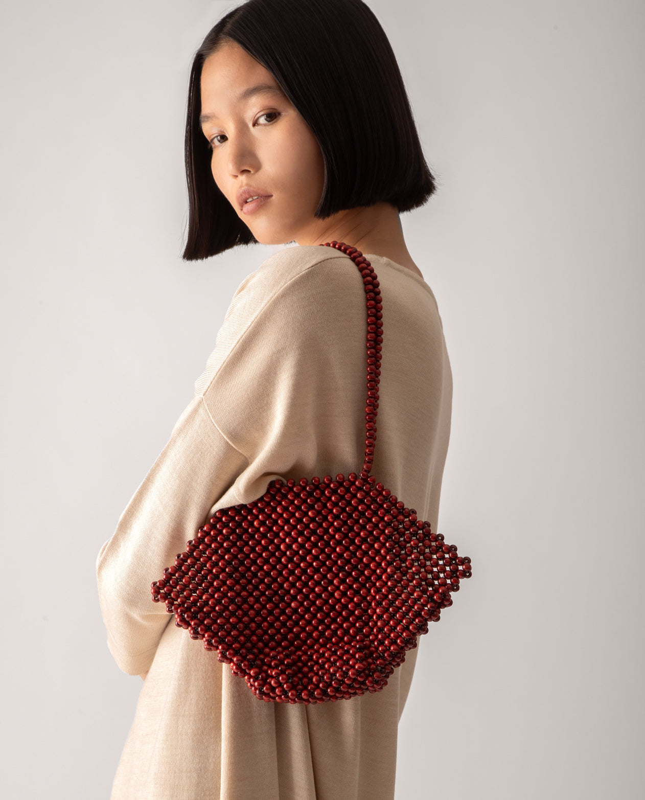 Limited-edition handbag in wooden beads inspired by Chinese street lanterns.