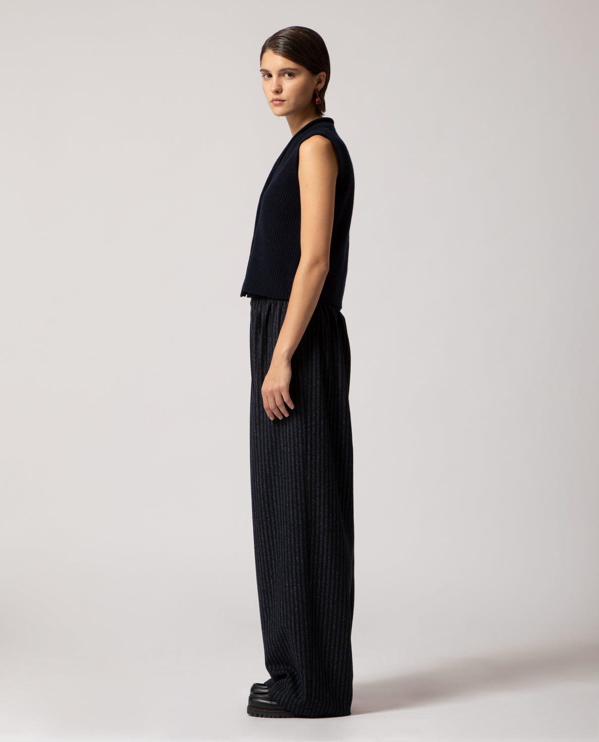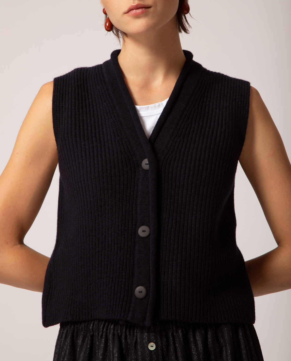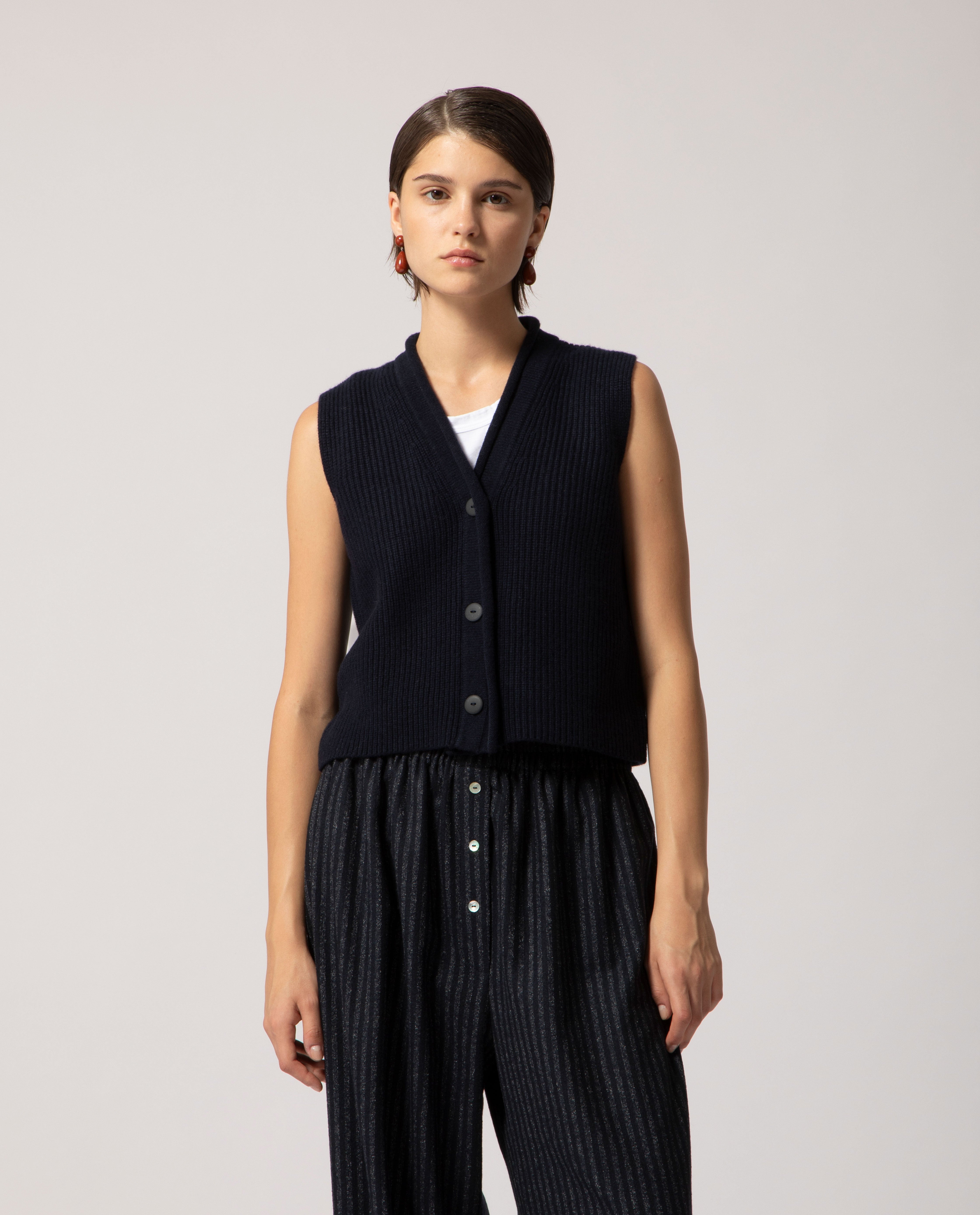 A soft and warm ribbed vest with button closure, crafted from a blend of merino wool and cashmere. Designed in a boxy silhouette, it offers both comfort and warmth.