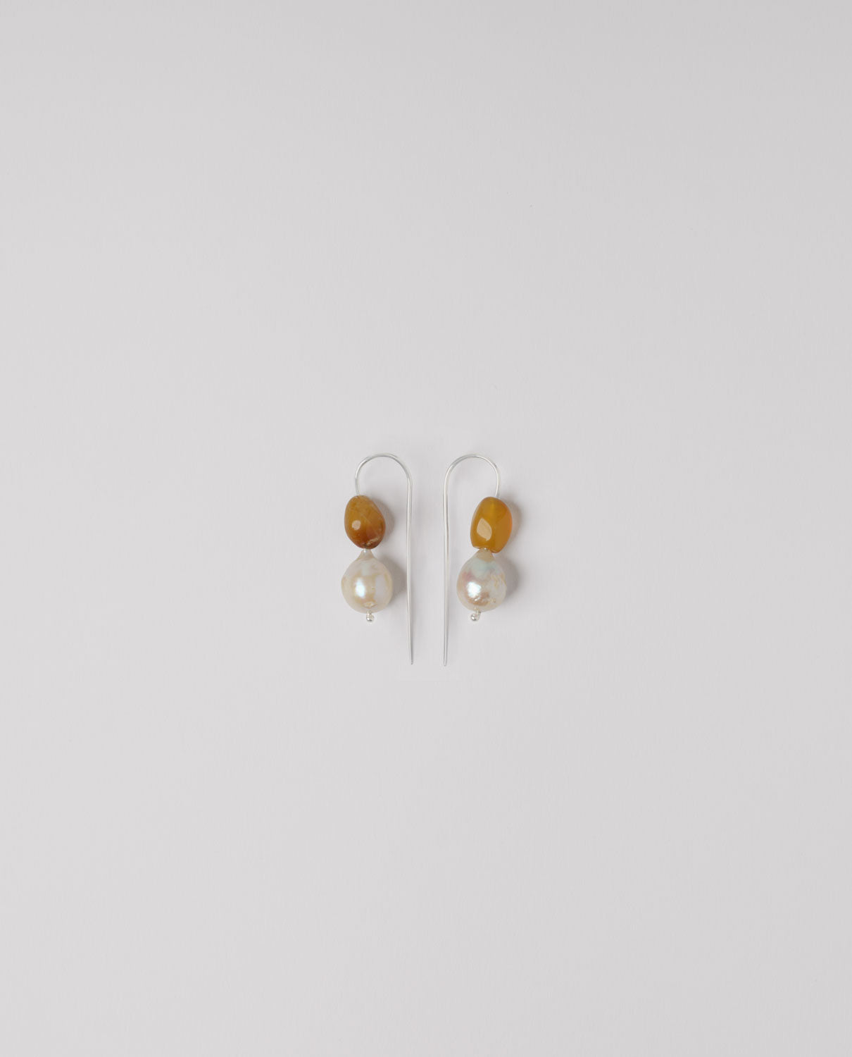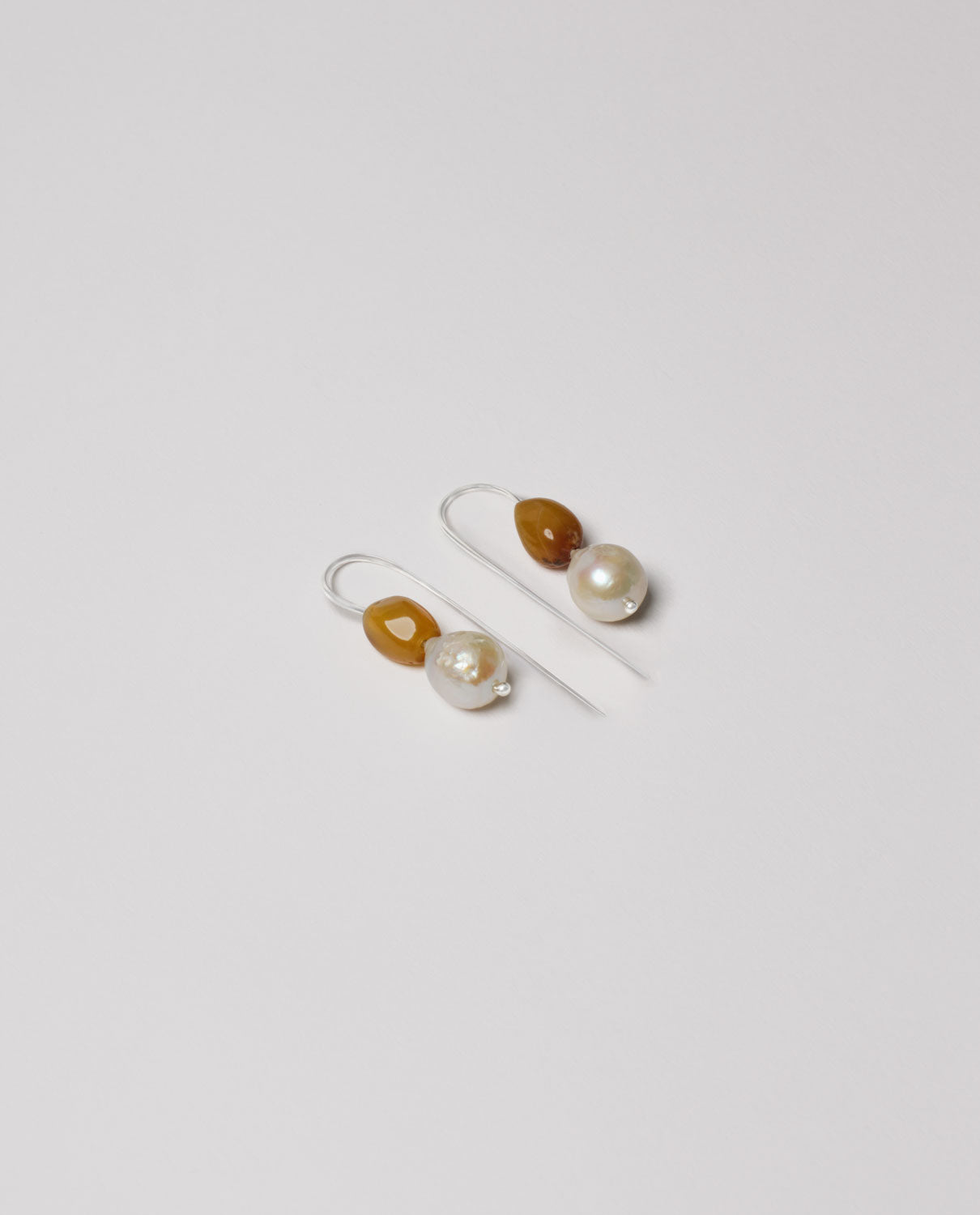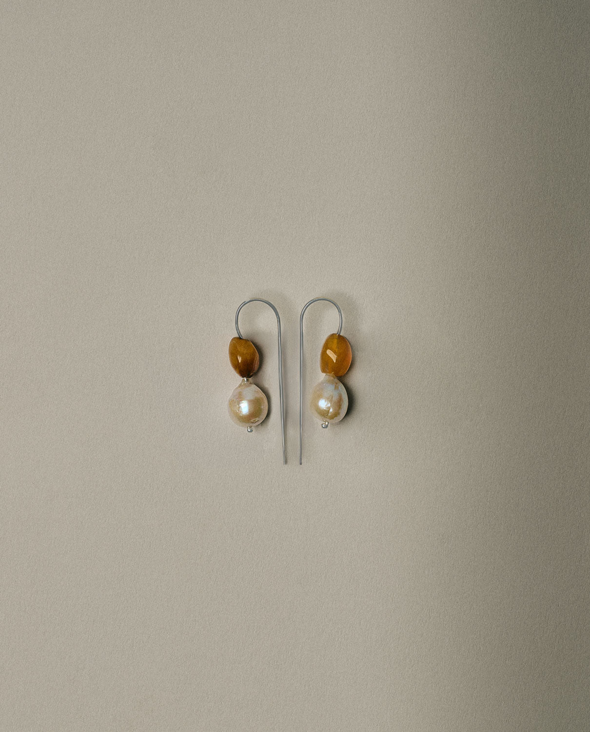 The Klea earrings are 925 sterling silver pendants featuring two natural stones—one freshwater pearl and one amber stone.