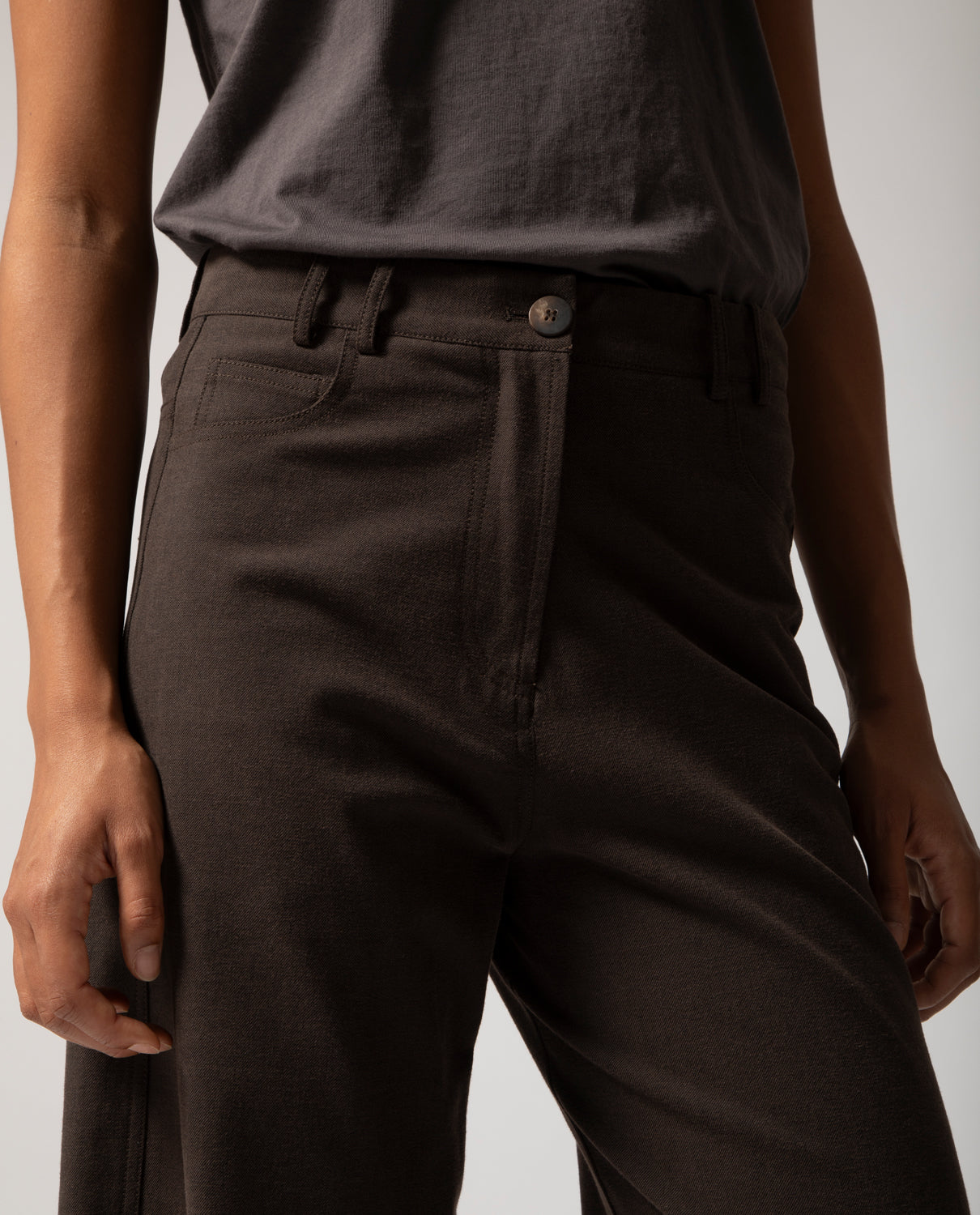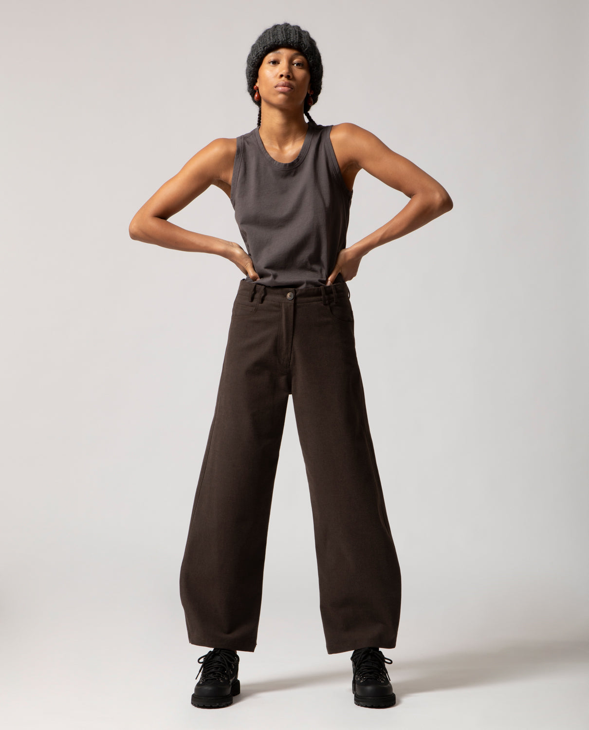 Designed with a relaxed, baggy fit, these trousers feature a slightly rounded hemline and tonal topstitching throughout. Classic five-pocket construction completes the design.