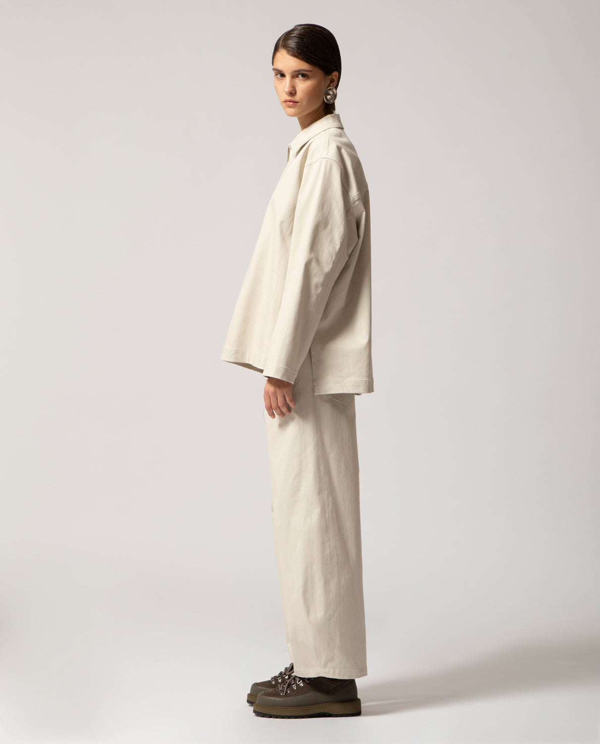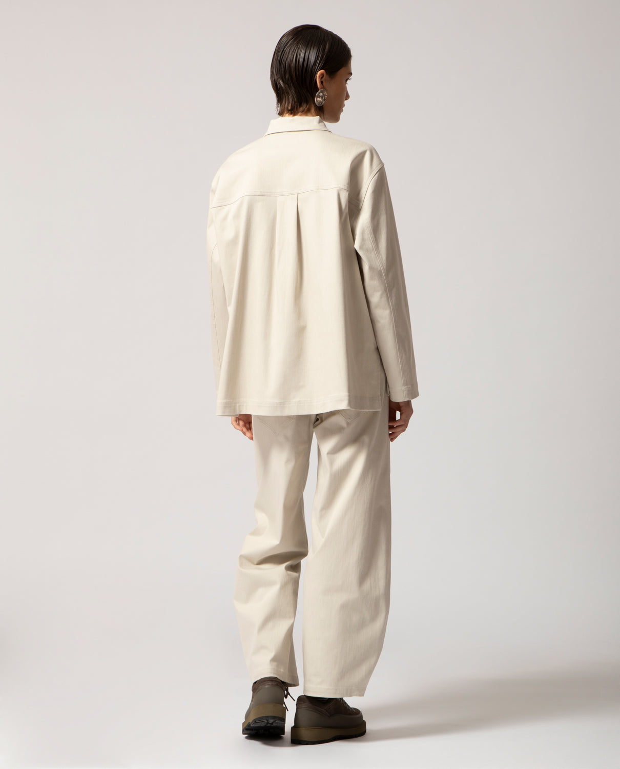 Designed with a relaxed, baggy fit, these trousers feature a slightly rounded hemline and tonal topstitching throughout. Classic five-pocket construction completes the design.