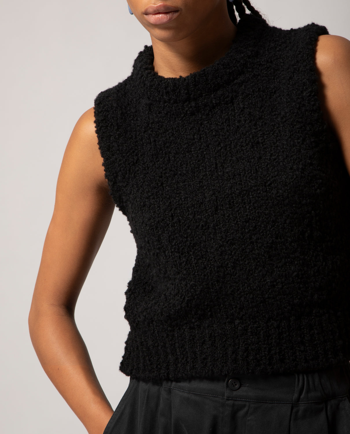 A warm wool gilet featuring a crew neckline, with a raised collar and shoulder details that add subtle structure and definition.