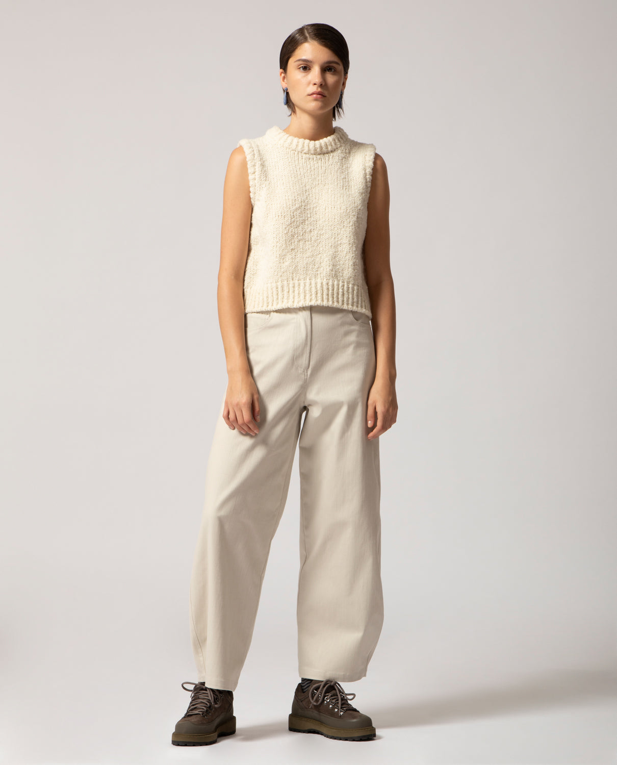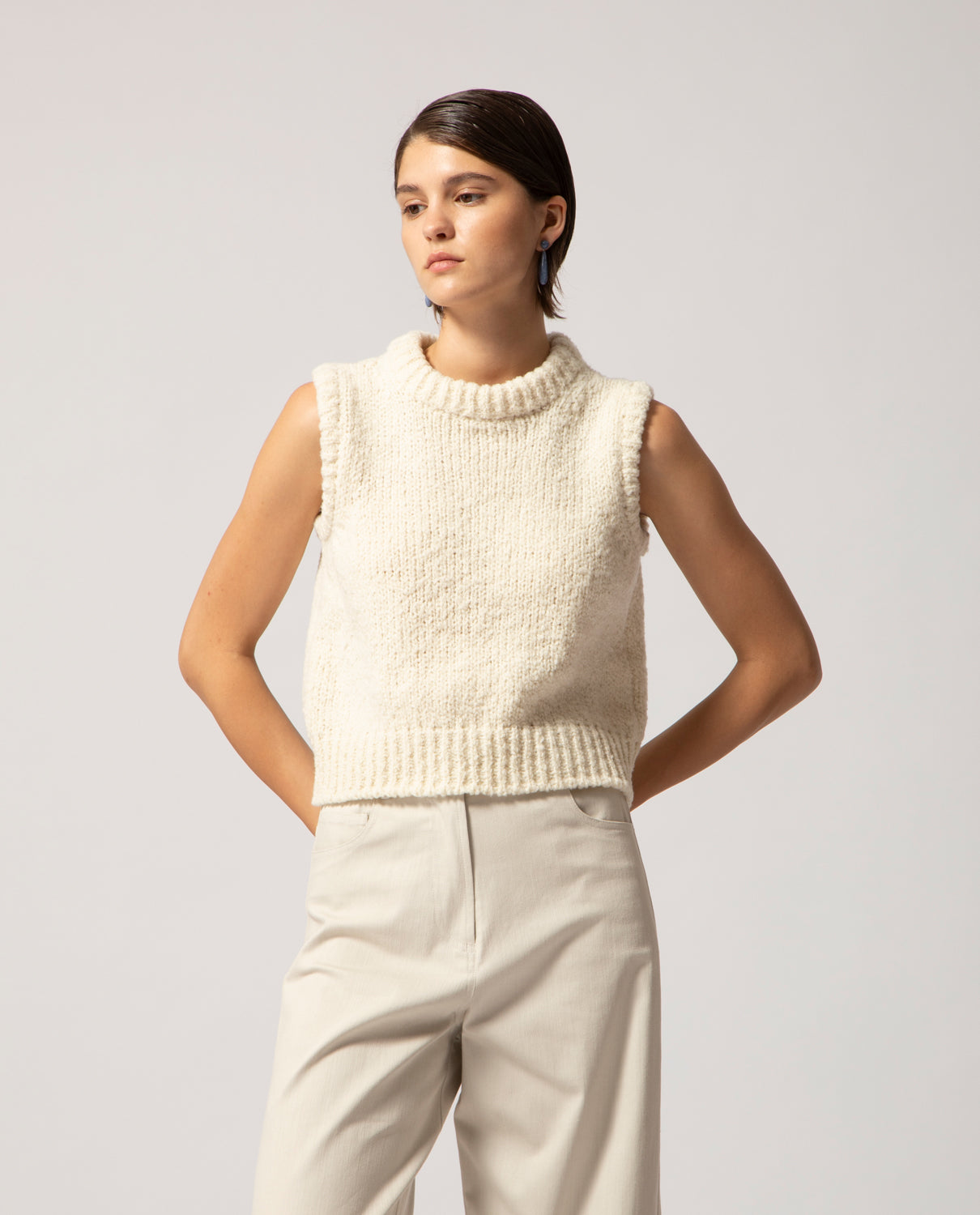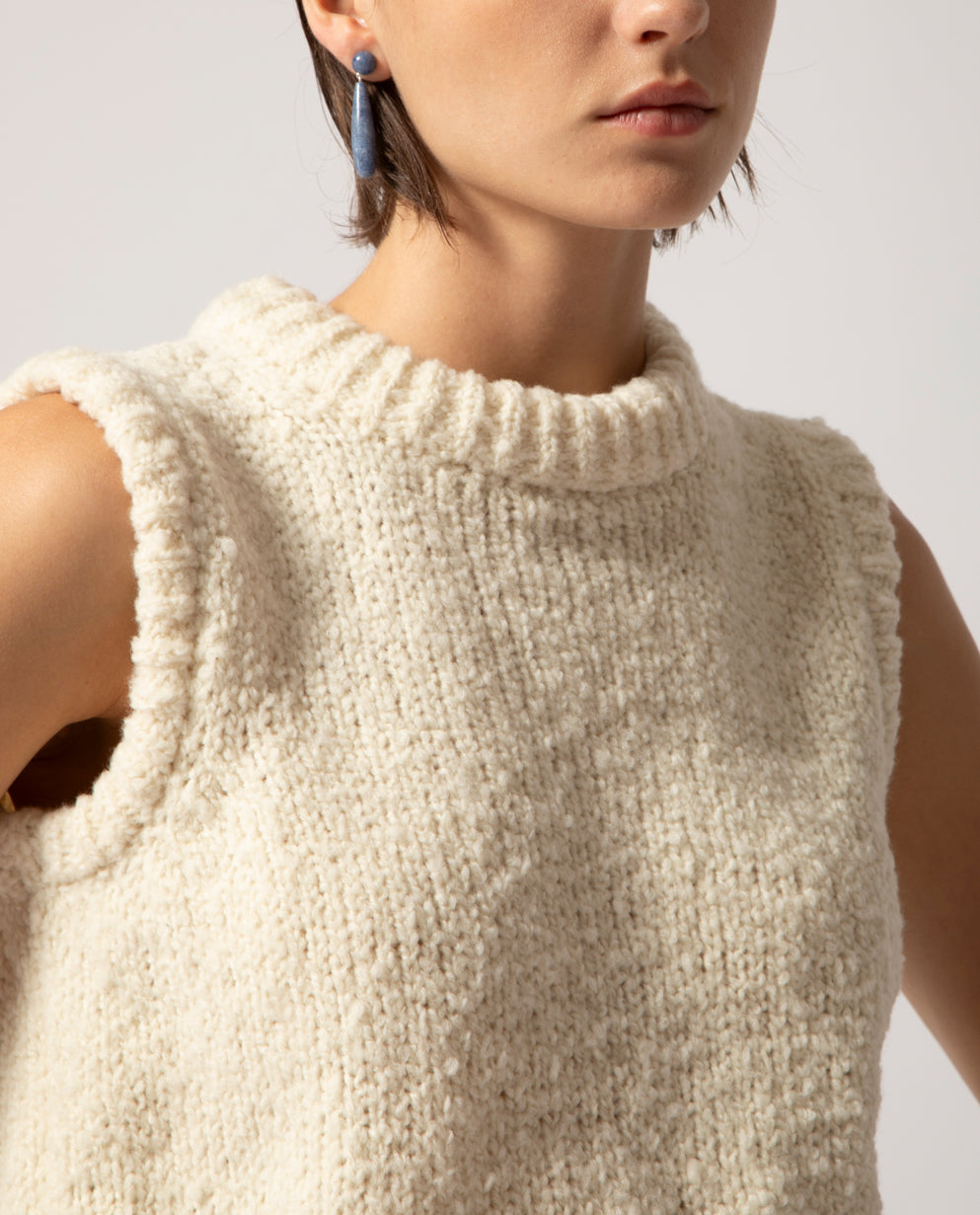 A warm gilet handcrafted from pure merino wool yarn, specially worked to create a voluminous, cloud-like texture.